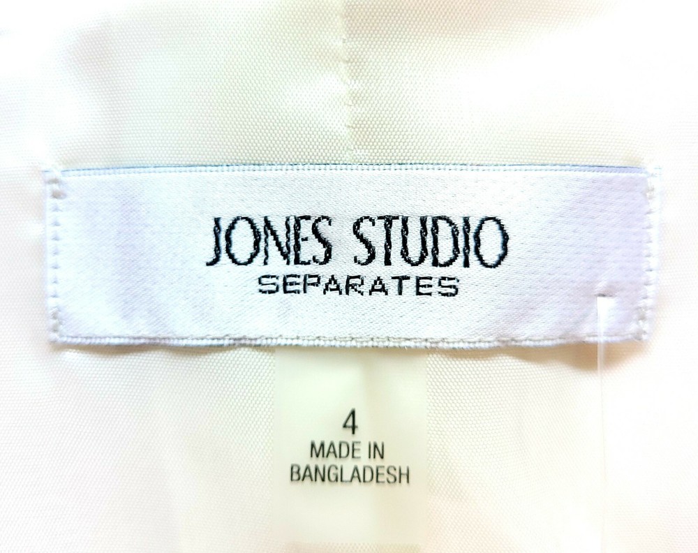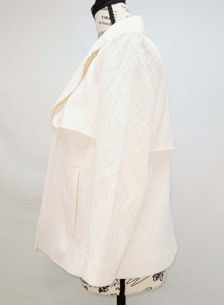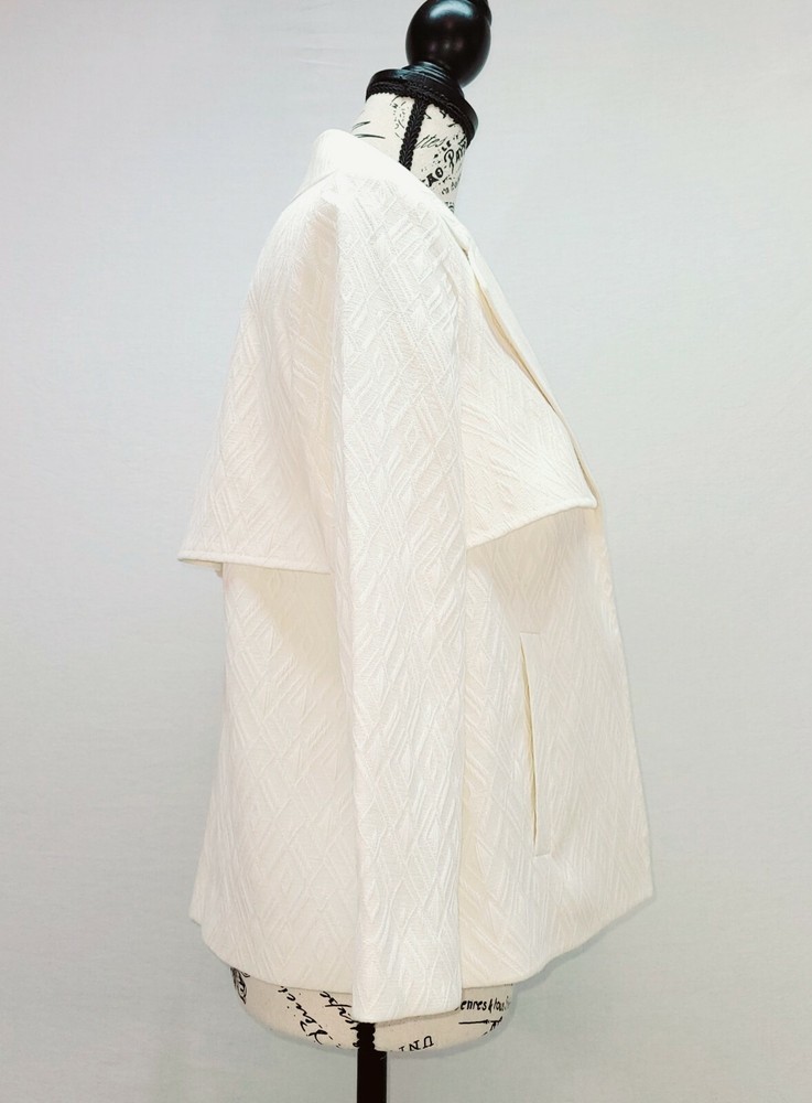 Jones Studio Seperates Ivory Fly-Away Blazer - Geometric/Diamond Pattern - Size 4 - NWT. This lovely size 4 ivory/cream/ beige fly-away blazer from Jones Studio Seperates is a great statement piece to add to your lineup! Features a textured geometric diamond pattern, flared sleeves, and an upper fly-away section. Due to lighting and screen settings, colors may be slightly different than pictured. Condition is "New with tags". Shipped with USPS Parcel Select.
