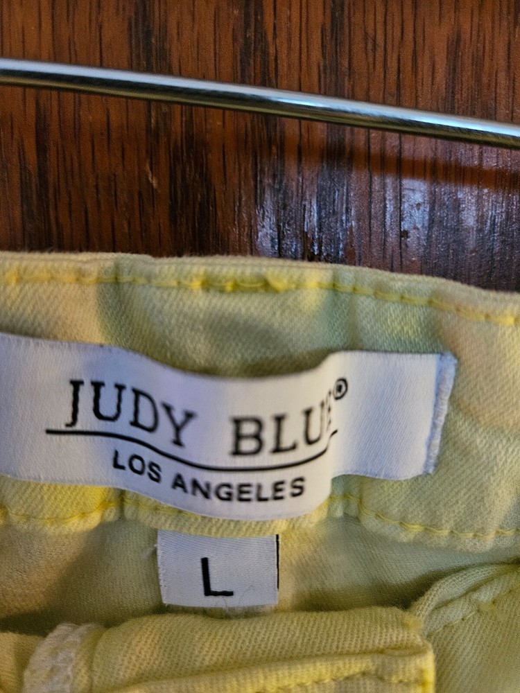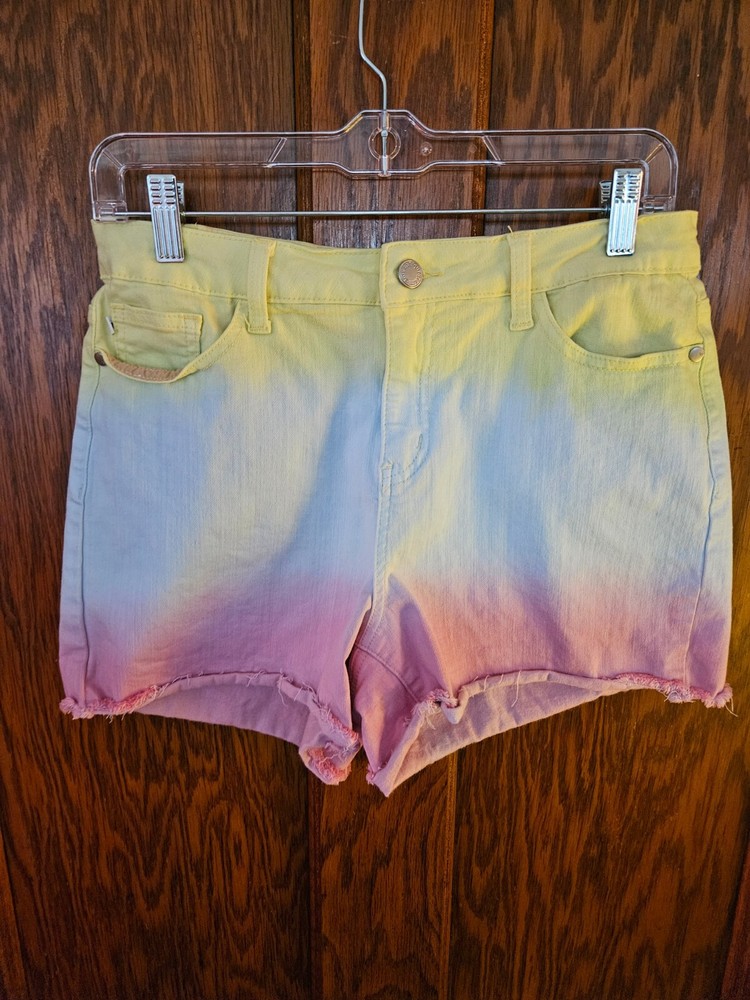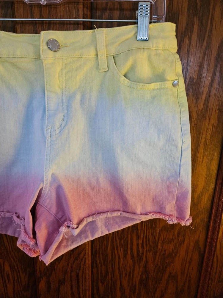Judy Blue Cut Off Denim Shorts Dip Dye Ombre Yellow Blue Pink Frayed Size Large Lots of stretch, cotton rayon polyester spandex blend Excellent pre owned condition...