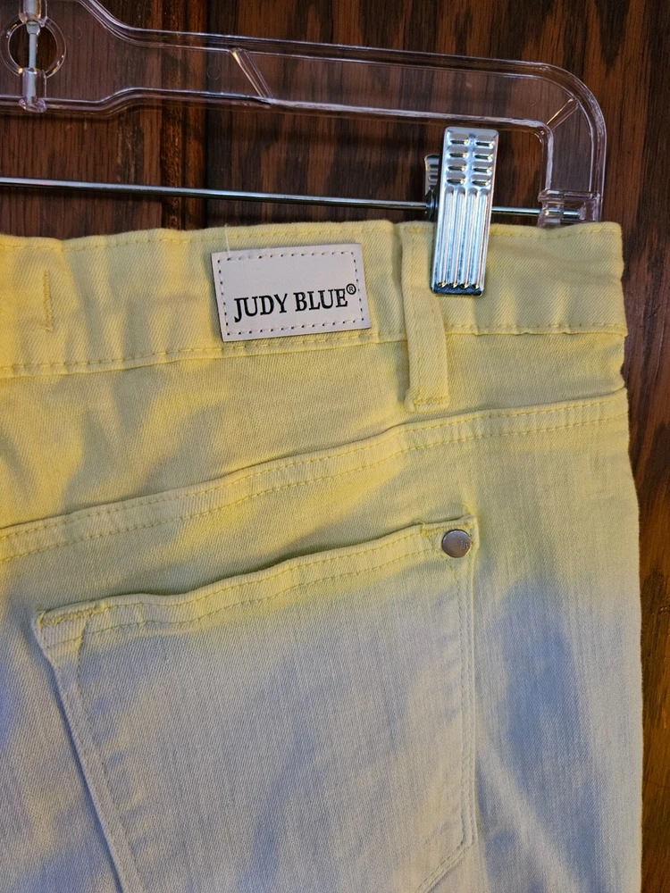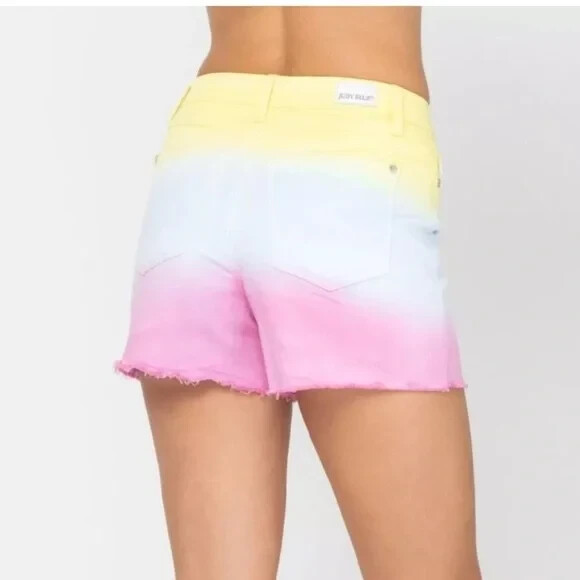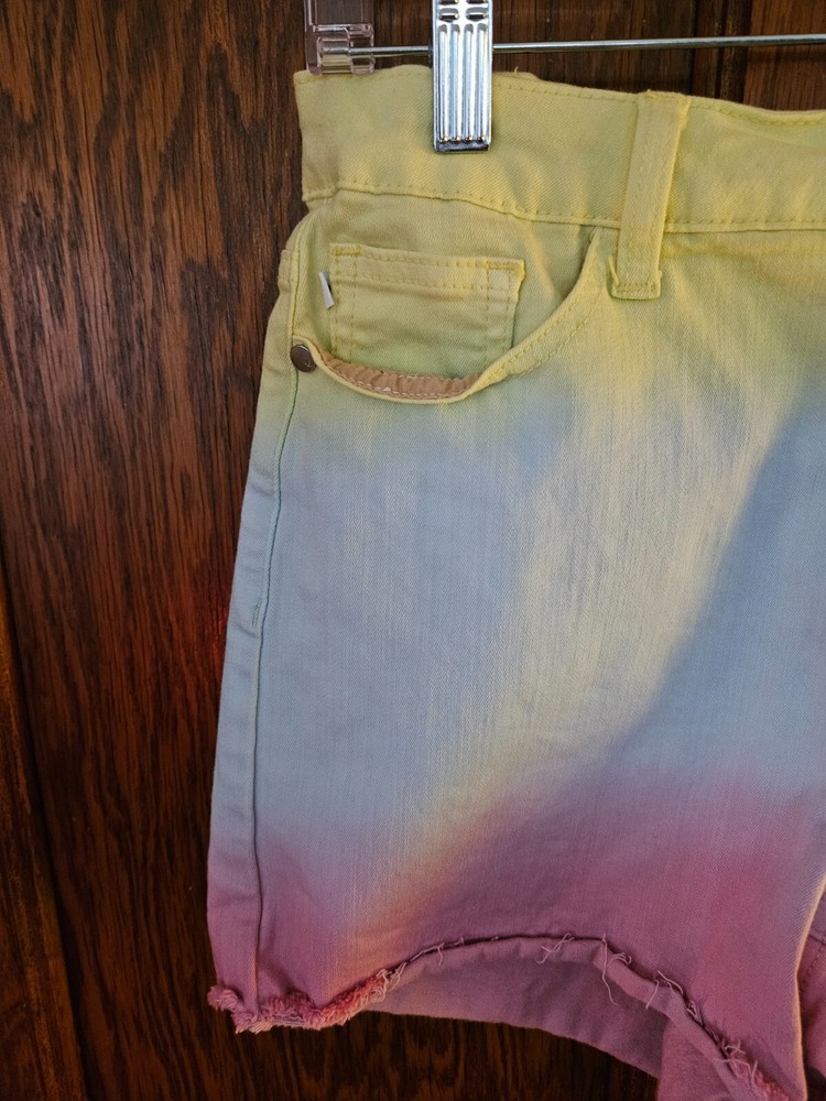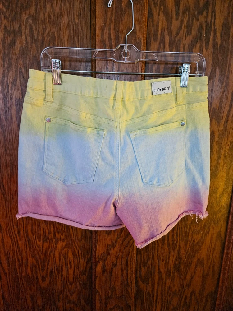 Judy Blue Cut Off Denim Shorts Dip Dye Ombre Yellow Blue Pink Frayed Size Large Lots of stretch, cotton rayon polyester spandex blend Excellent pre owned condition
