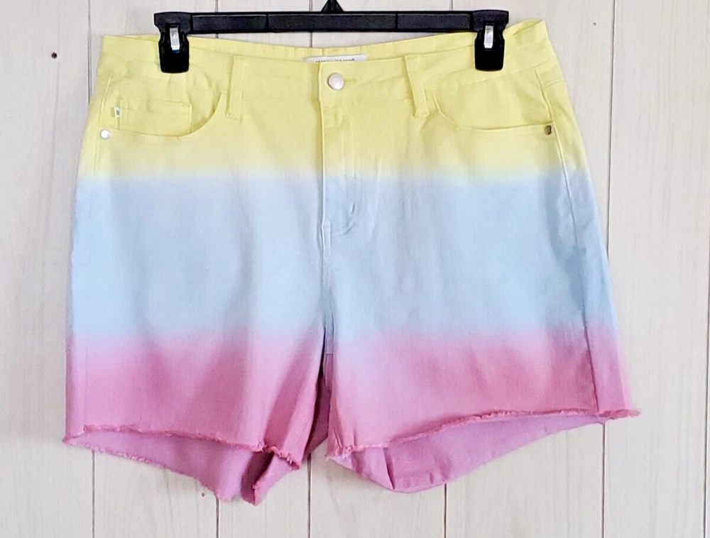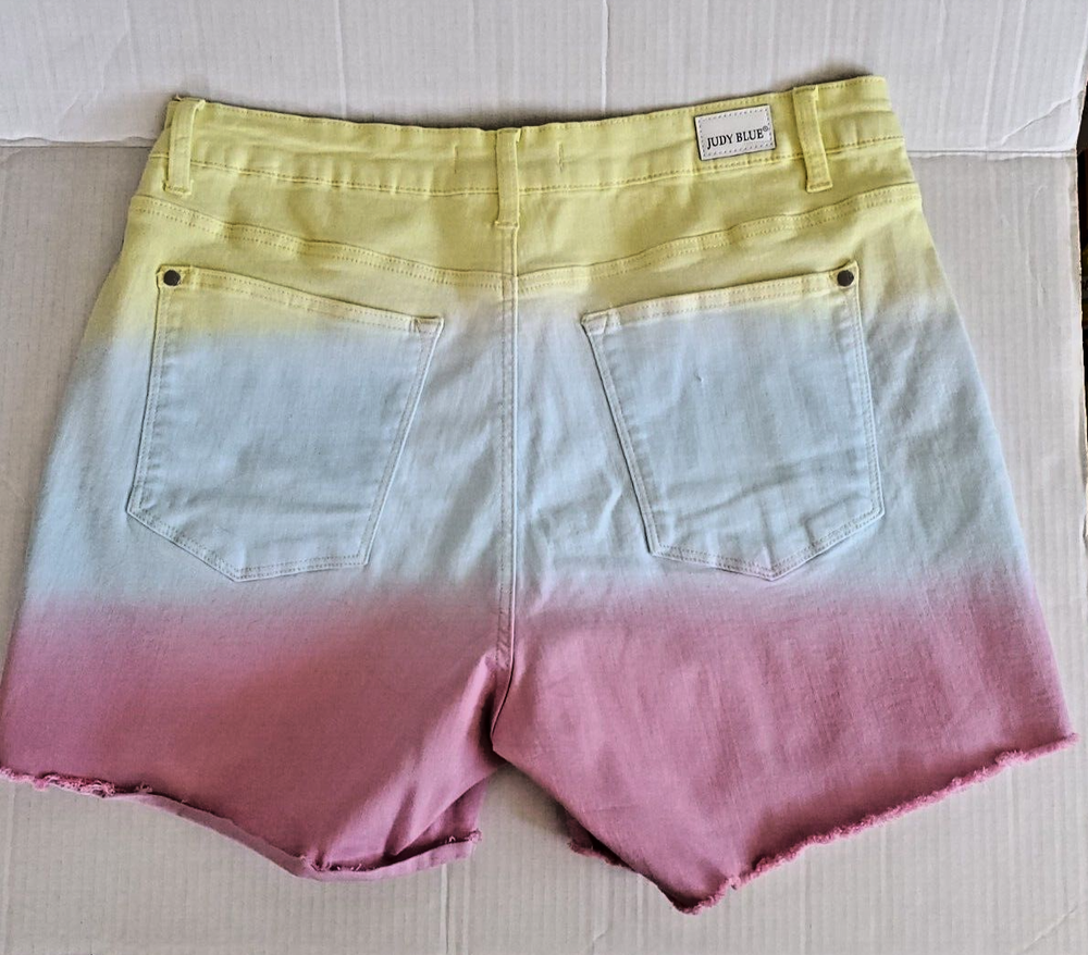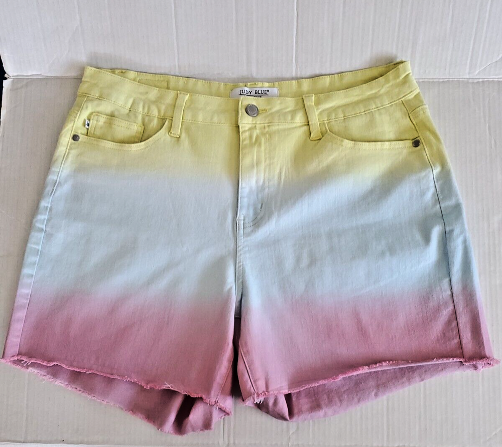Judy Blue Dip Dye Jean Shorts - Pastel ombre pattern - Cut-off style Condition: Pre-owned. No stains, holes, or tears. Please view photos for details. Size: 1XL Approximate Measurements: Waist: 17" Inseam: 5" Rise: 11.5" Leg: 11" Fabric: 76% Cotton, 17% Rayon, 5% Polyester, 2% Spandex From a smoke-free, cat-friendly home. H1680
