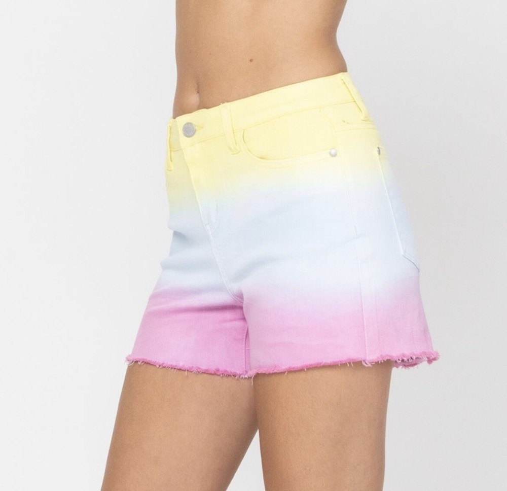 Judy Blue Large Cut Off Denim Shorts Dip Dye Ombre Yellow Blue Pink Frayed NWT. 10” rise 4” inseam Model 5’10”