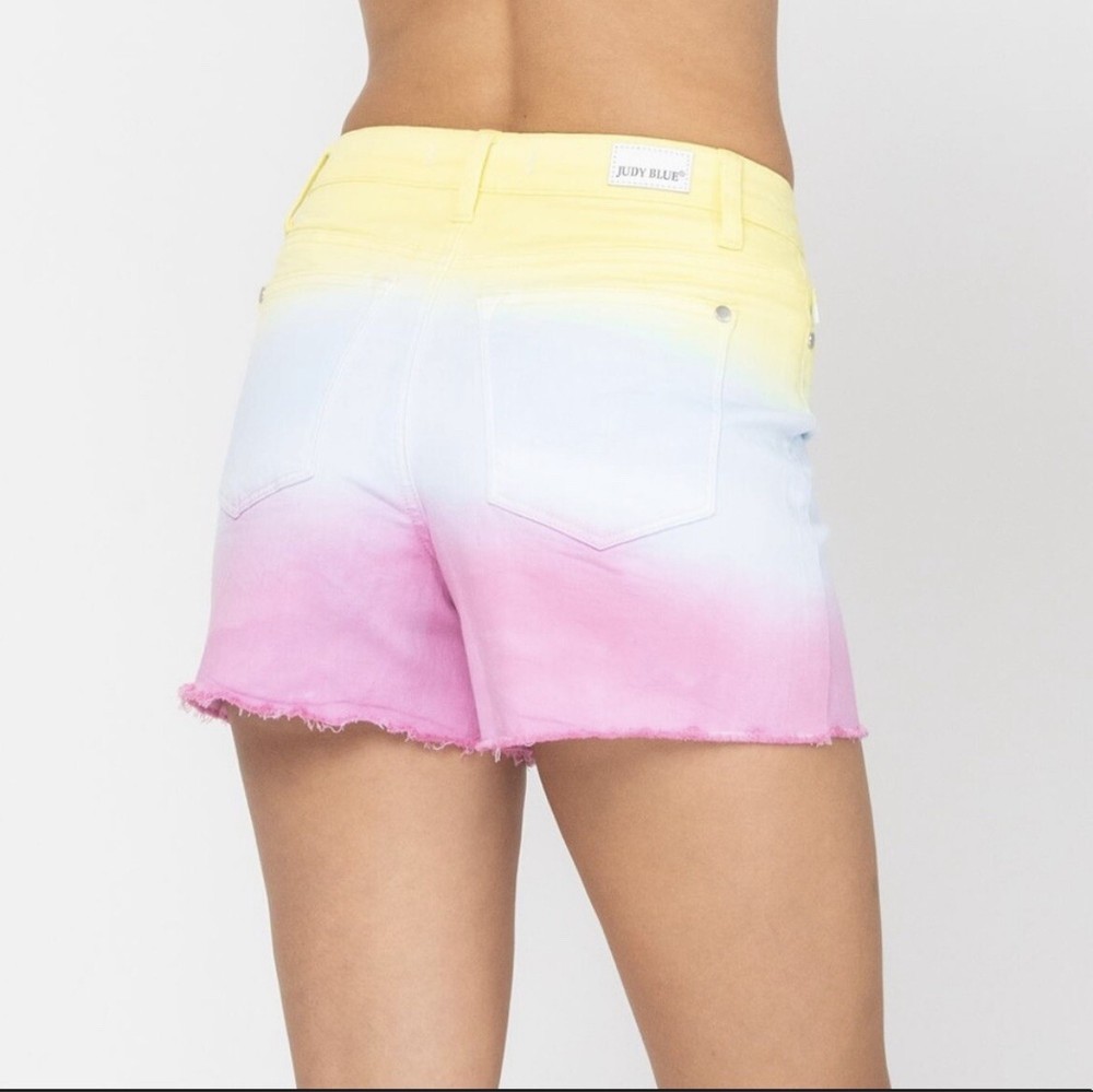 Judy Blue Large Cut Off Denim Shorts Dip Dye Ombre Yellow Blue Pink Frayed NWT. 10” rise 4” inseam Model 5’10”...