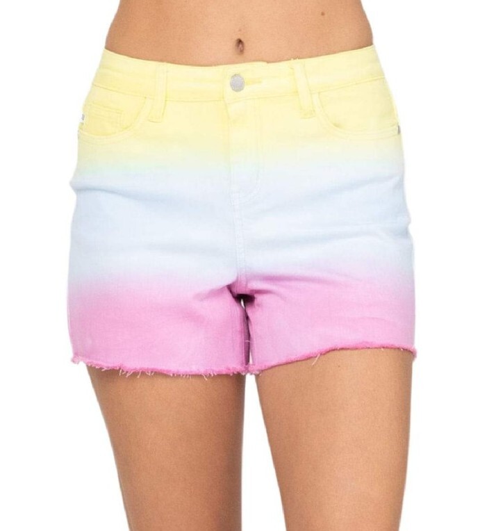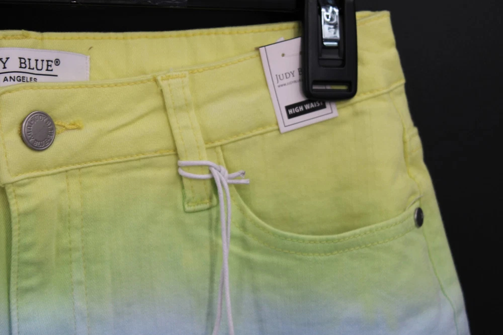 Judy Blue Somewhere Over the Rainbow Dip Dye Ombre Shorts Raw Hem Size L NWT.