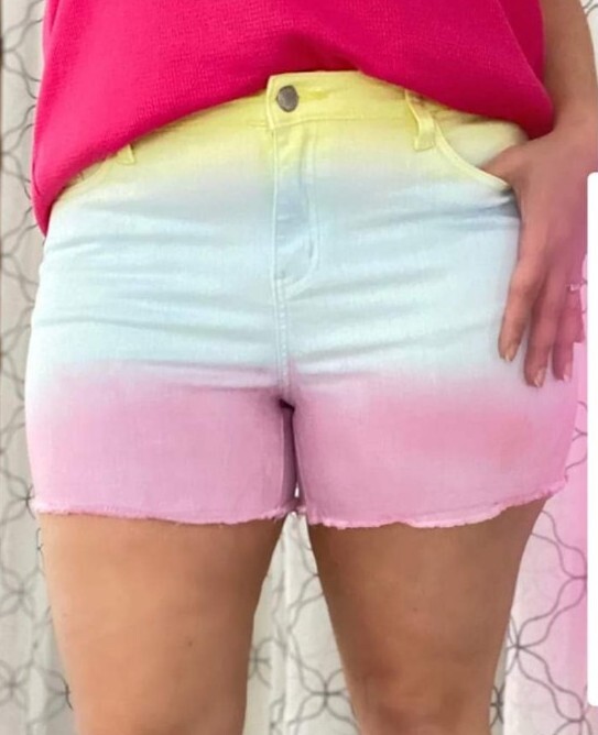 Judy Blue Somewhere Over the Rainbow Dip Dye Ombre Shorts Raw Hem Size L NWT....
