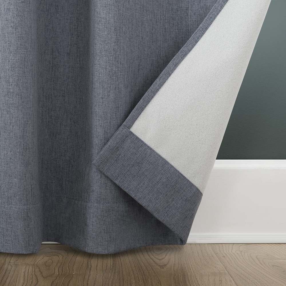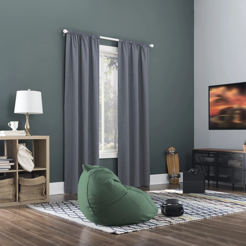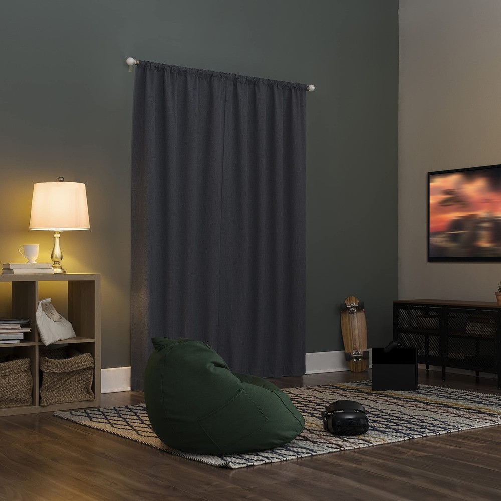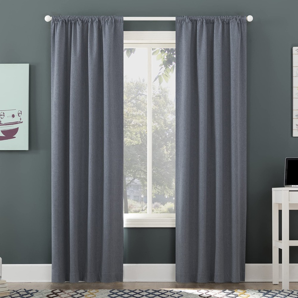 Add cozy vibes to your space with the unique brushed tonal texture of Jules Brushed Tonal Textured 100% Blackout Rod Pocket Curtain Panel. Generation Blackout technology is lab tested to block out 100% of light, reduce outside noise by up to 55%, and decrease energy lost through your windows by up to 35%. Fleece insulation keeps inside air cooler in the summer and warmer in the winter. Built-in rod pocket design allows for easy slide-through installation on curtain rods up to 1.5” in diameter. Sold as individual panels measuring 40" width by 96" length in color blue. Measure carefully before selecting your desired size and quantity. Rod not included. Machine wash cold on gentle cycle. Use non-chlorine bleach when needed. Tumble dry on low heat. Brushed tonal texture adds cozy vibes to your space Fleece insulation keeps air cool in summer and warm in winter Noise reduction by up to 55% for less distractions and better sleep Blackout technology blocks out 100% of outside light and eliminates screen glare Built-in rod pocket fits curtain rods up to 1.5" in diameter Panels sold individually. Measure carefully prior to purchase. (Image features 2 panels)