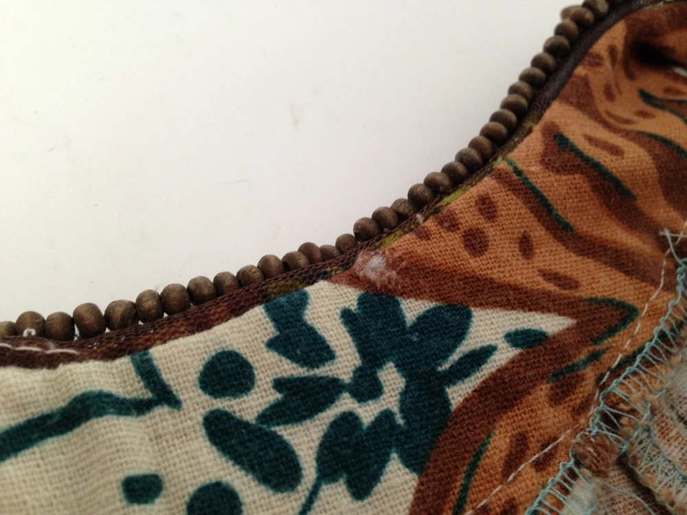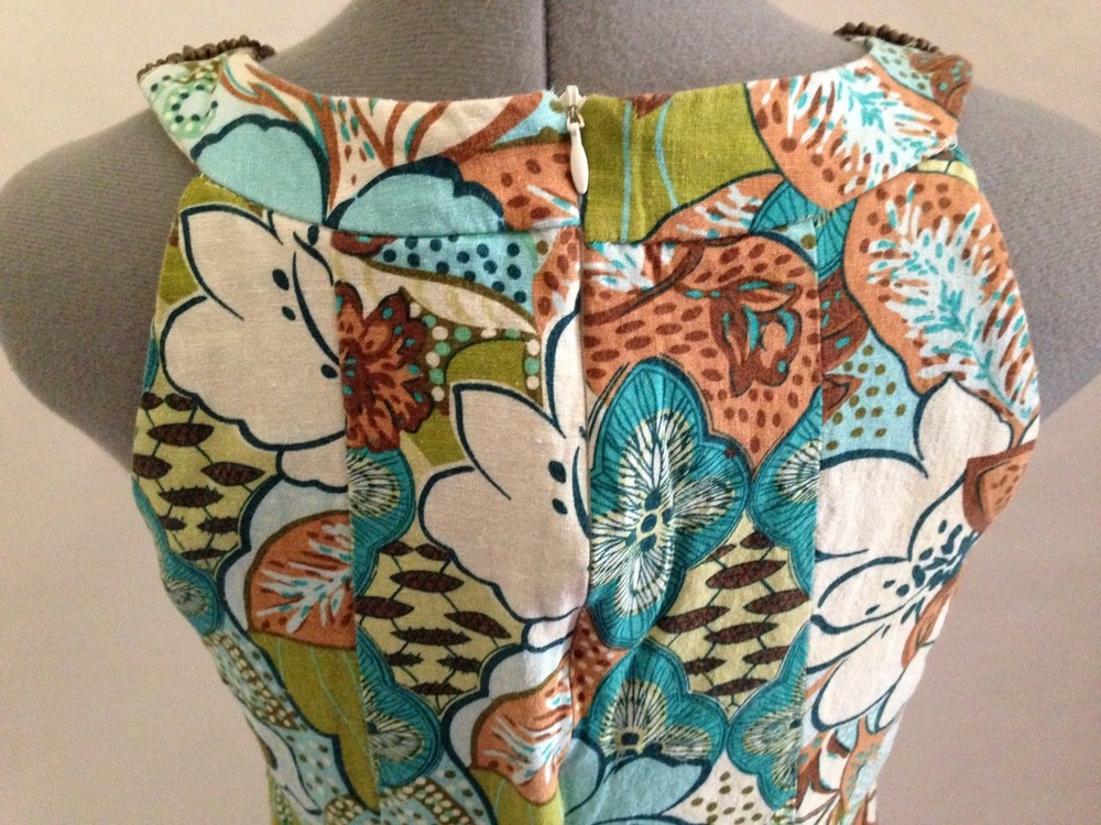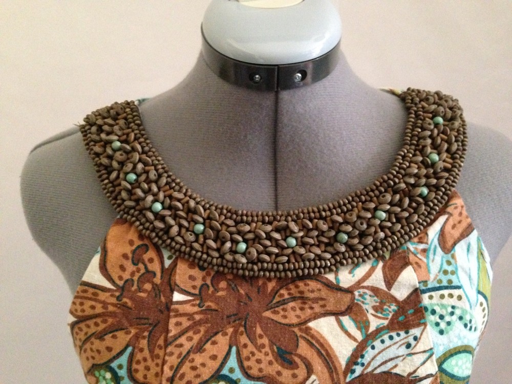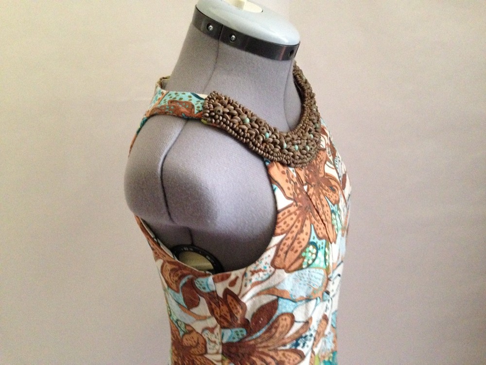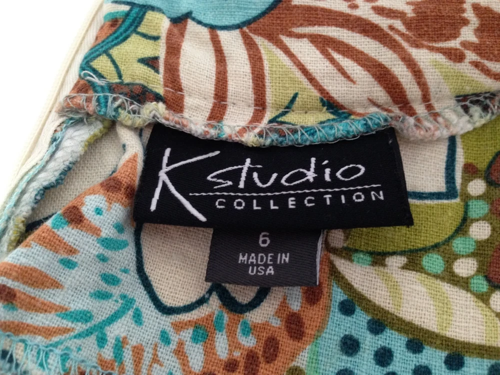 This K Studio floral dress features a beautiful beaded neckline with multiple shaped brown beads accented with blue beads. It a lovely little dress perfect for Sunday brunch or pair it with a little sweater and wear it to work. Classic, beautiful, elegant. Note - there is a small hole on the inside of the neckline. Not visible from the outside (see pics) size 6 fit regular color blue/green/brown pattern floral neckline jewel sleeve sleeveless closure zip material rayon/linen under arm measurement 16 collar to hem measurement 32 lined no