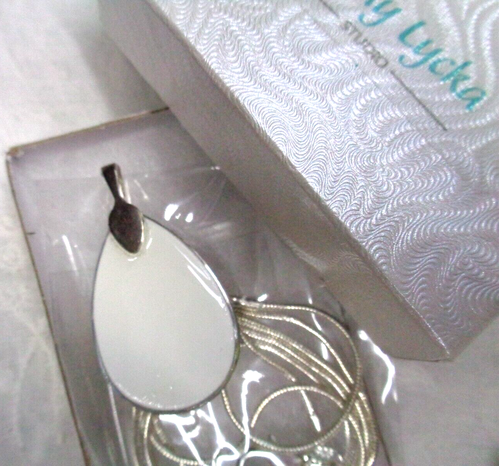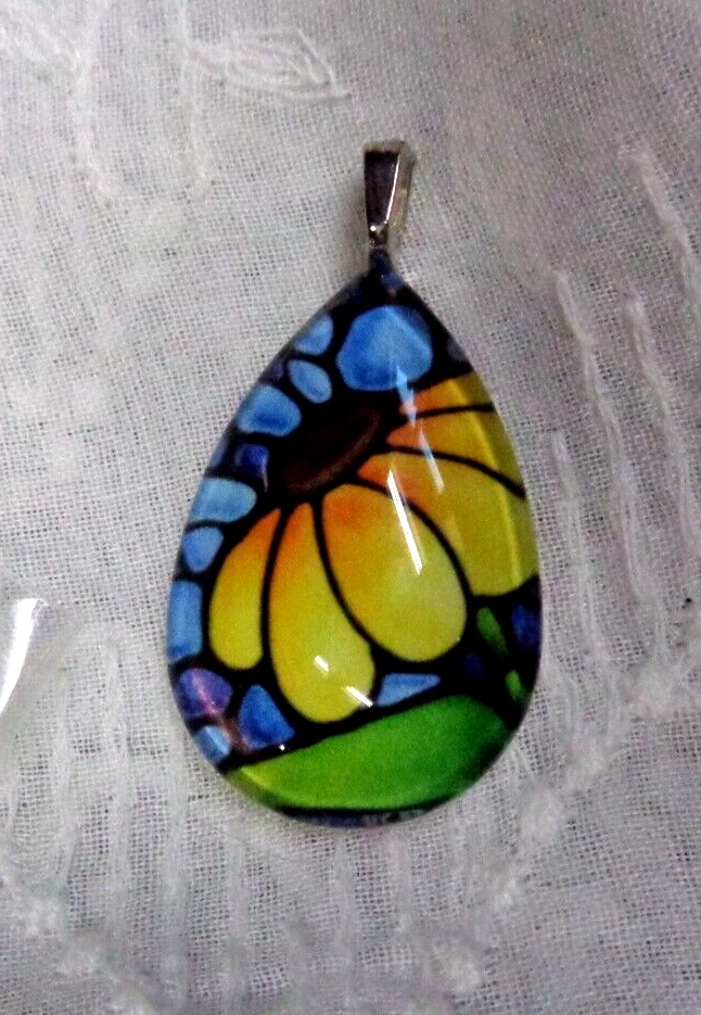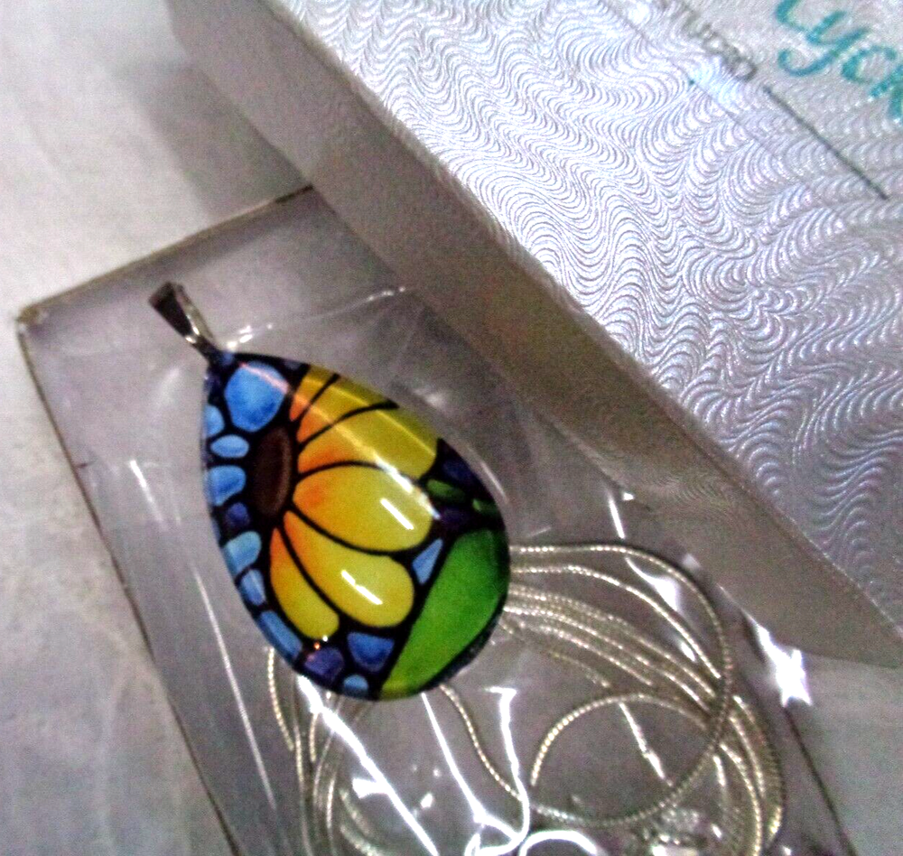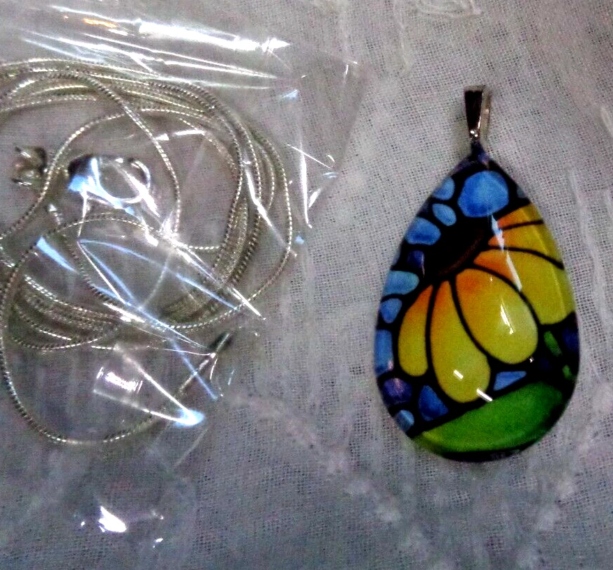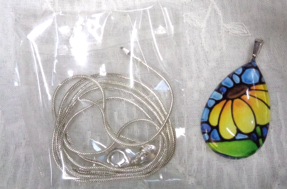 (storage - bin 1 / drawer 2) KATHY LYCKA STUDIO .925 Sterling Silver Chain SUNFLOWER Teardrop Necklace 24" L Chain ** Size: 20 mm w x 30 mm h (teardrop) ** Glass front and sealed back ** Chain is a sterling silver snake chain 1mm, stamped 925 plated (nickel free) ** HAND MADE SUNFLOWER PENDANT CONDITION: NEW WITHOUT TAGS ... INCLUDES THE ORIGINAL BOX ... LOVELY! ***CHECK OUT MY LARGE SELECTION OF JEWELRY*** ***CHECK OUT MY UNIQUE MERCHANDISE*** ************************************************************** INTERNATIONAL CUSTOMERS: SHIPPING IS HANDLED BY THE EBAY INTERNATIONAL SHIPPING PROGRAM. PLEASE REFER TO THE PROGRAM DURING CHECKOUT FOR RATES. THANK YOU! SHIPPING: U.S. POSTAL PLEASE ASK ALL QUESTIONS BEFORE BIDDING / BUYING PAYMENT IS EXPECTED WITHIN 3 DAYS OF AUCTION END I LOOK FORWARD TO DOING BUSINESS WITH YOU!