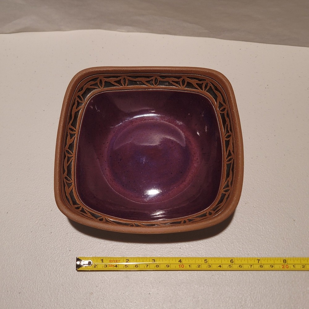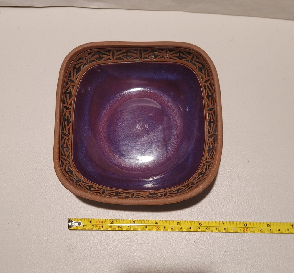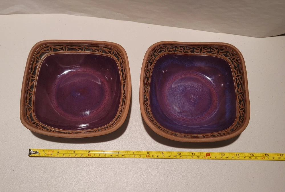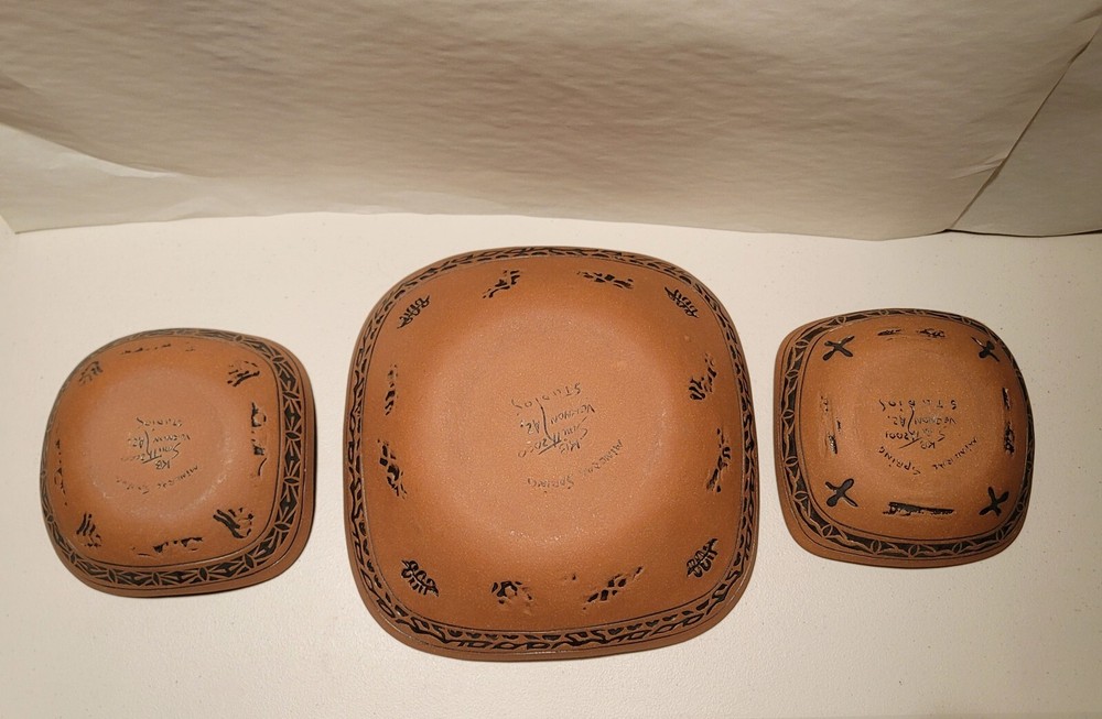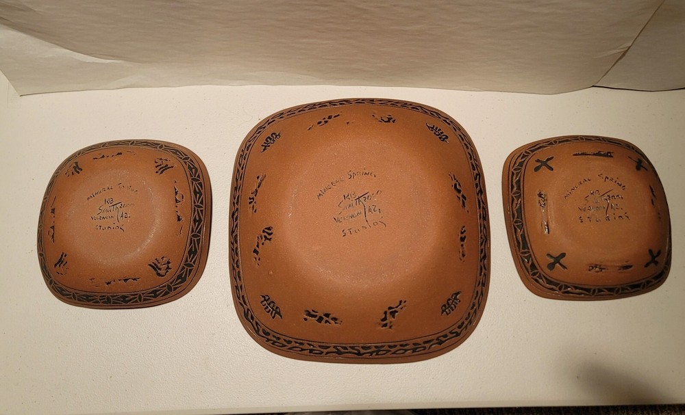 This three-piece pottery bowl set from KB Smith Mineral Springs Studios is a beautiful addition to any kitchen or dining area. The set includes a large bowl and 2 small bowls. all of which are crafted from high-quality clay using traditional pottery techniques. The bowls feature a lovely spring pattern that adds a touch of whimsy to any table setting. The set was manufactured in 2001 in Vermont, AZ, and weighs a total of 8lbs. The bowls are not antique but are still perfect for collectors or anyone looking for unique and decorative cookware. They are suitable for use in serving soups, salads, or snacks and are sure to impress any guests. The bowls are in excellent condition without cracks or chips.