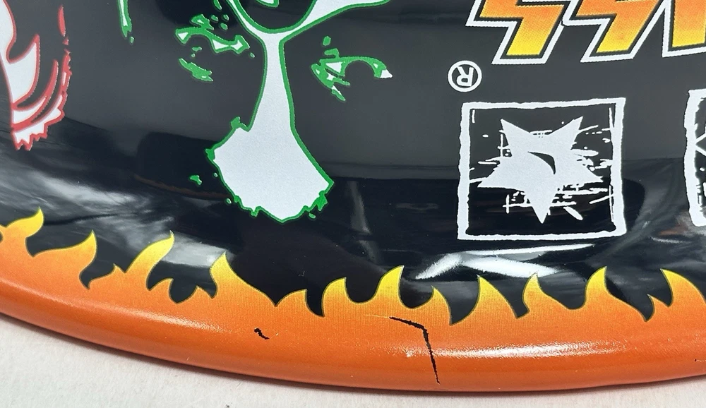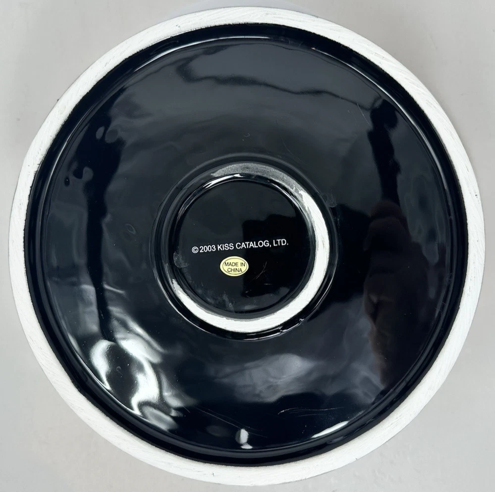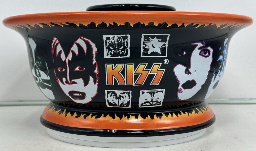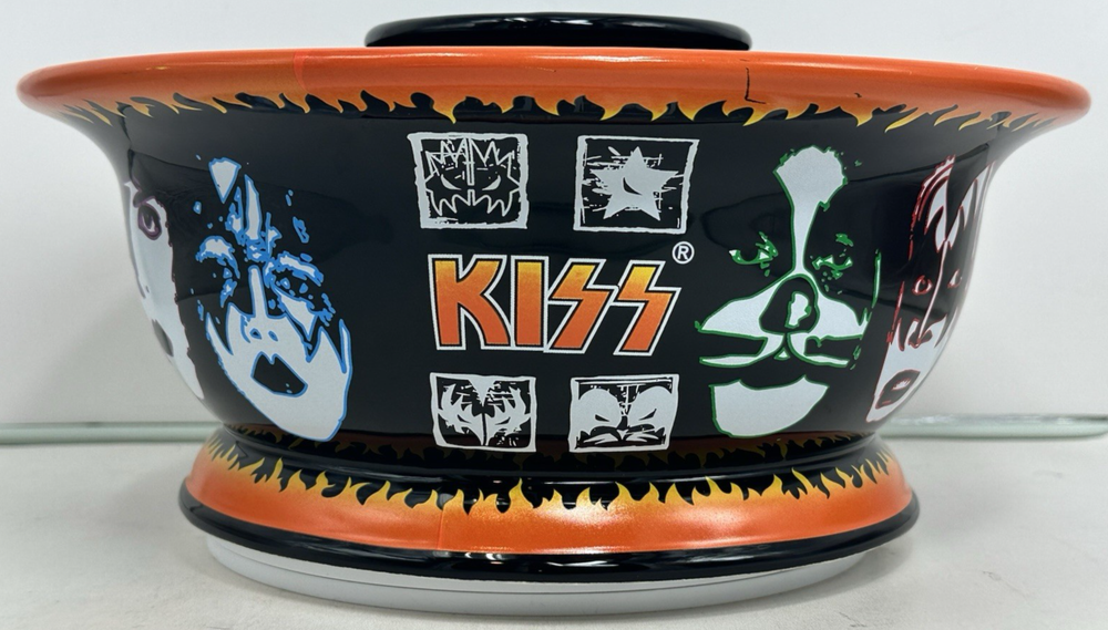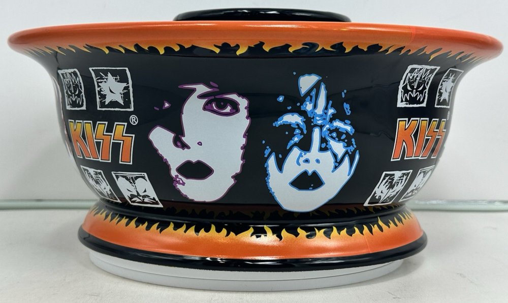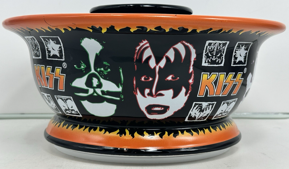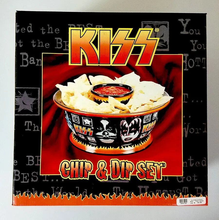 The KISS · Chip & Dip Set by Spenser Gifts 2002 features a large 12" chip bowl with a 4.25" dip bowl, perfect for any rock 'n' roll fan. This original music memorabilia piece pays homage to the iconic rock band KISS, making it a must-have for any music enthusiast's collection. Made in China, this unique set combines functionality with a touch of entertainment memorabilia, making it a great addition to any fan's collection. Manufactured by Signature Networks for Spencer Gifts in 2002. There is no box with this listing, the first photo is simply a stock image of the product.