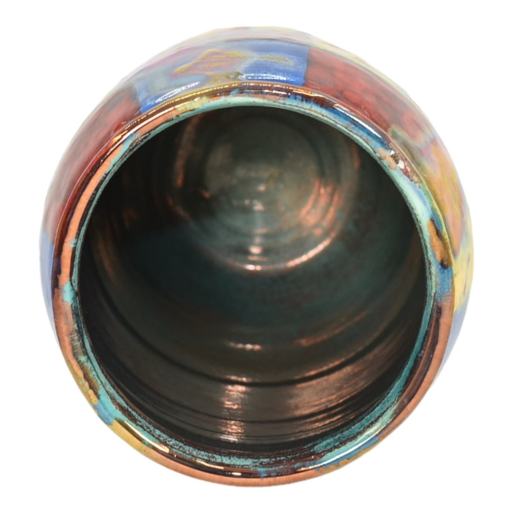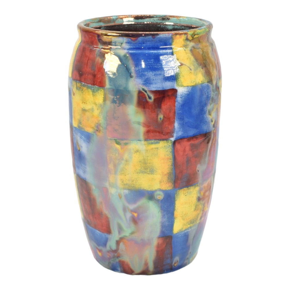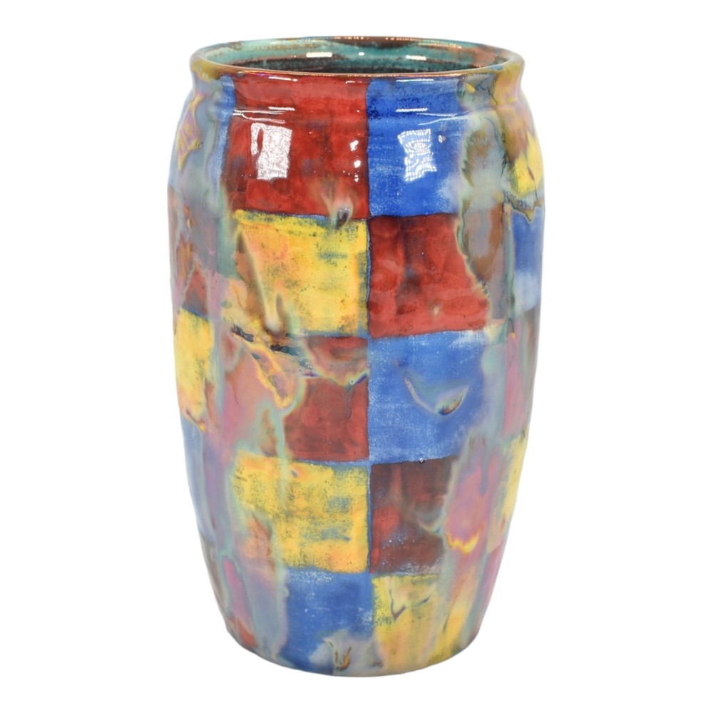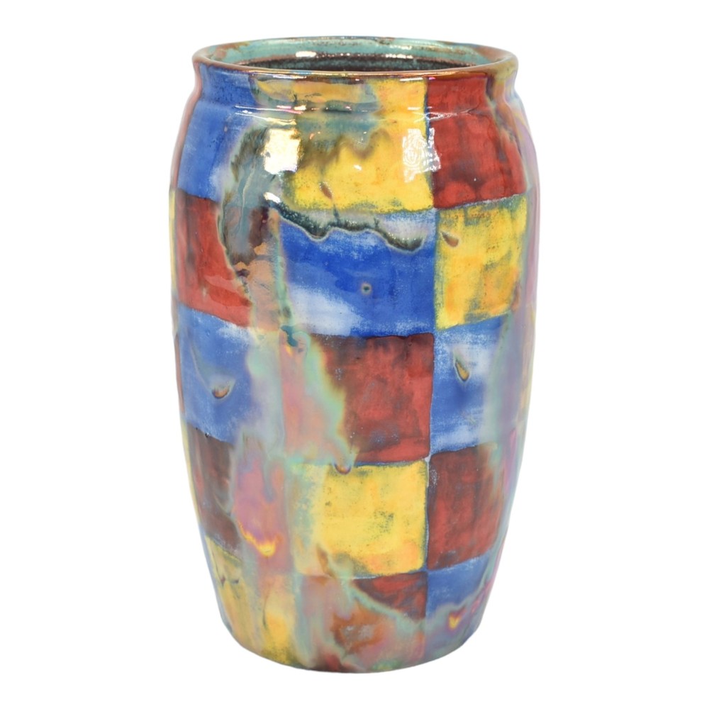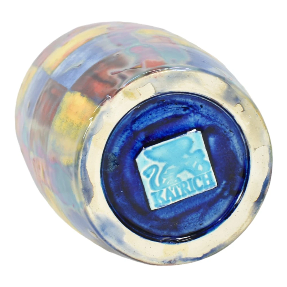 Katrich Studio Art Pottery Hand Painted Squares Ceramic Vase 1253 Katrich Studio Art Pottery Hand Painted Squares Ceramic Vase 1253 Pretty hand painted, colorful squares vase by Paul Katrich. Excellent original condition. No chips, cracks, damage or repair of any kind. Tiny factory glaze burst near rim. Bottom marked with Katrich and logo. Vase is 6 1/4" tall and 3 1/2" wide. Click here to shop our entire inventory of over 2500 pieces of art pottery. Complete satisfaction is always guaranteed. We deal only in art pottery and specialize in large estate collections. If you have pottery to sell, please contact us . We are actively buying entire collections and individual pieces.