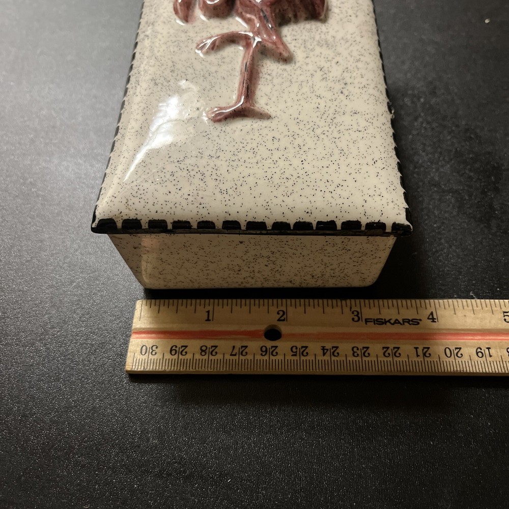 This one of a kind Kaylee Hollywood Ceramic Studio Square Container with Flamingo Lid is a must-have for collectors and lovers of flamingos. Its flamingo lid adds a touch of fun and whimsy to your kitchen decor. This item is a great addition to any collection and is sure to be a conversation starter.