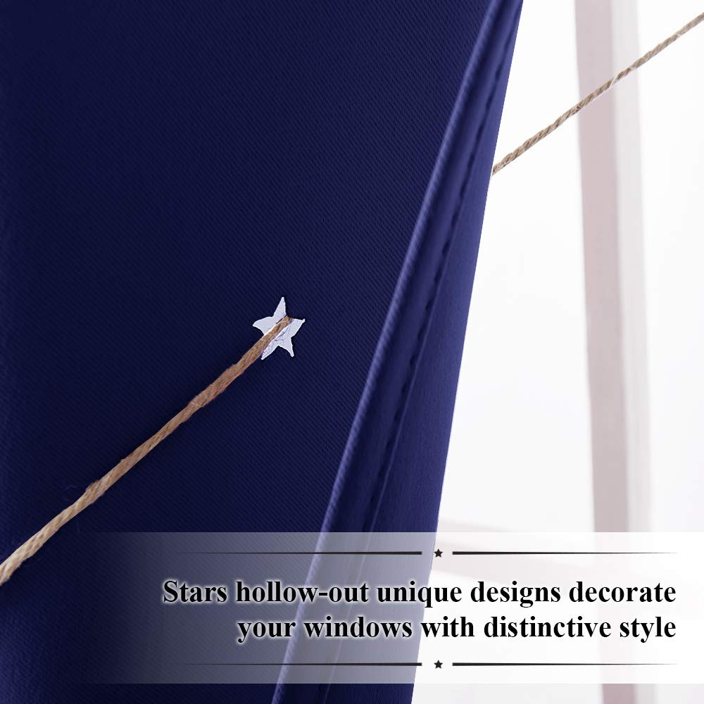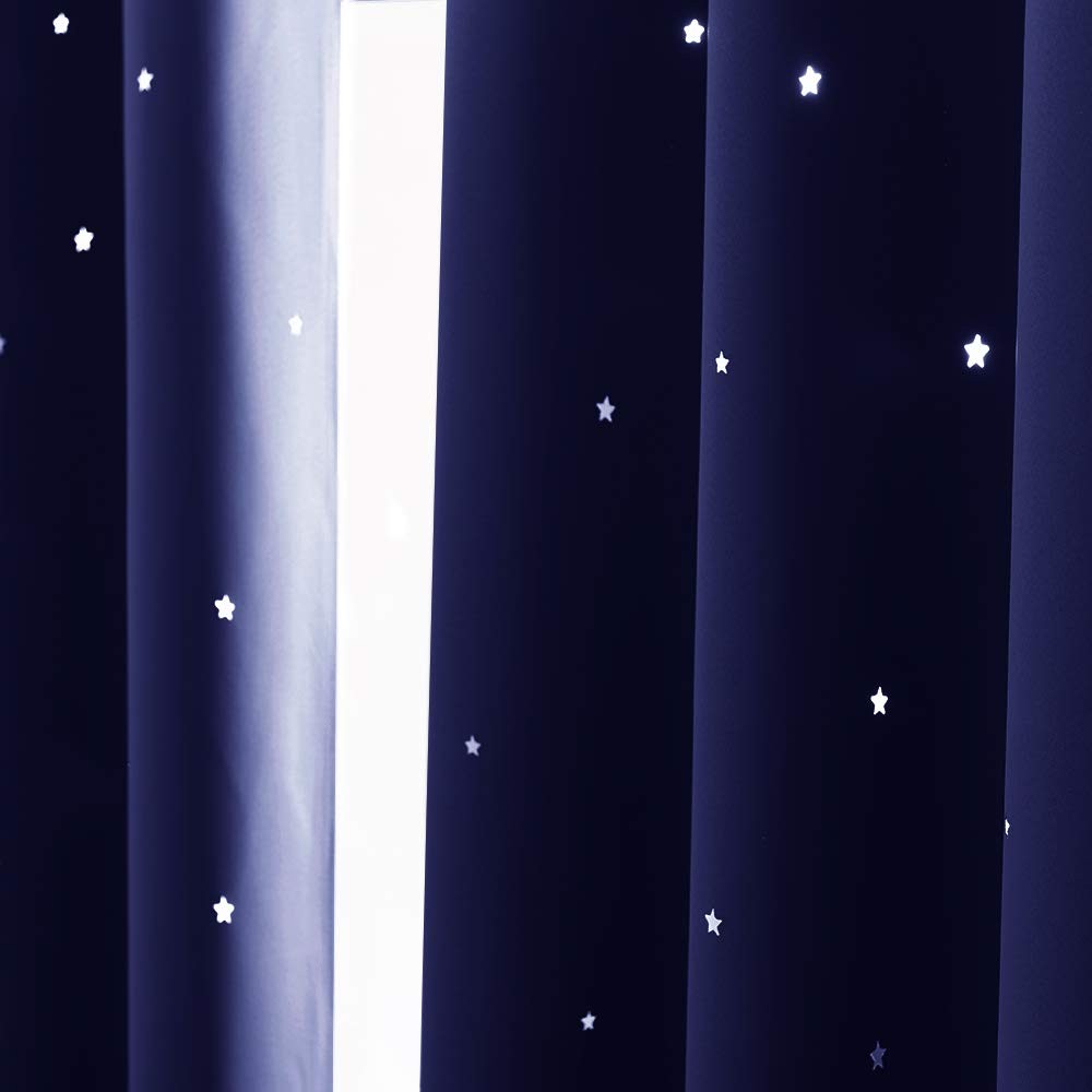 Can you imagine to see a starry sky in your room? Here's a way you can! TWINKLE CURTAIN is such a magic drape. FIT NICELY: Sold as 2 panels, measuring 52" wide. 54", 63", 84",95" length available for your different size window. 1.6 inches diameter silver color grommets promise the curtains are easy to be installed and slide. These designs of hollow stars decorate your windows to a distinctive style. When the light comes through the star shape holes, the following scenery will be pretty close to magic! The stars twinkle in your room! PERFORMANCE: By using the triple weave textured blackout fabric, the curtains keep the most light and UV rays out. The tiny star-shaped cut holes applied thoroughly throughout each panel allows just enough outside light in. So kids will never suffer the fear in the dark. Star cut curtains to let a small amount of light during nap time for kids. Meanwhile, provides absolute privacy for your indoor life. BUDGET WISE: The star cut out blackout curtains are good insulators of summer heat and winter chill. Lower your energy bill. Curtains are made to last. Machine washable in cold water, tumble dry. Quick ironing or steam clean when needed. Decorating your windows with these Hollow Stars Insulated Blackout Curtains will make your room a big difference. The stars of varying sizes add an unexpected twinkle and charming appeal to your space, while the blackout feature ensures that you get the best night's sleep. If you are trying to find the best gift for your lovely little ones, if you want to provide space-themed room to your kids, if you want to make your child feel like that they are camping "under the stars" in their rooms, this curtain is your best choice. NOTE : Due to different screen displays, the color of the actual item may vary slightly from the above images. UNIQUE DESIGN: Hollow stars design cuts the light entering the room into the star shapes. The stars twinkle with the changing light throughout the day. This special design will add more dreamy sense for your kids' room. BEST GIFT: Design for children, the fabrics have NO chemical coatings or foil printing. provides a safe window decoration for your sweet little cuties. Blackout fabrics block the lightest promises you a nice sleep. BASE INFORMATION: 2 panels laser cutting out stars curtains per package. Each Blackout Curtain measures 52" wide x 63" long. The design of silver grommet (1.6-inch inner diameter) makes the curtains easy to install and slide. WIDELY USE: The starry shapes makes all the difference. These curtains fit many room decor themes well. Such as space theme, forest theme, ocean theme, adventure theme, princess theme, romantic theme or other themes. EASY MAINTENANCE: Machine or hand washable in cold water. Tumble dry or naturally dry. No bleaching. Low-temperature ironing can easily remove the crinkles. Measure your pole and window size before you choosing sizes.