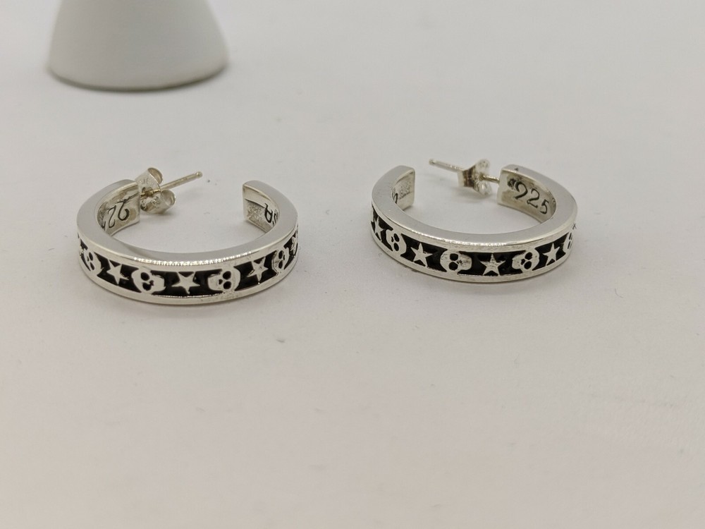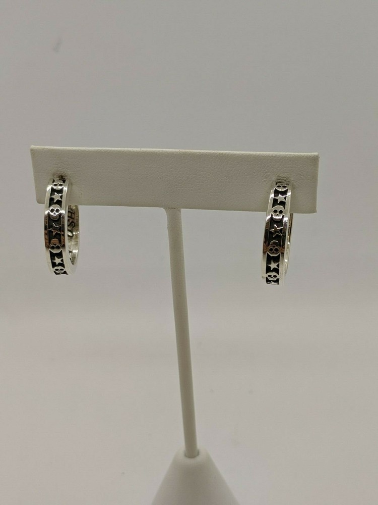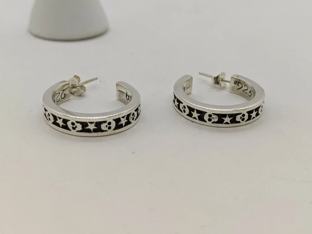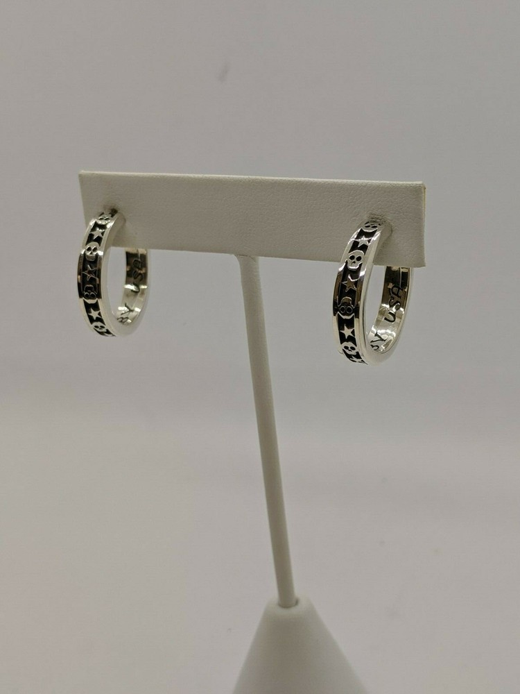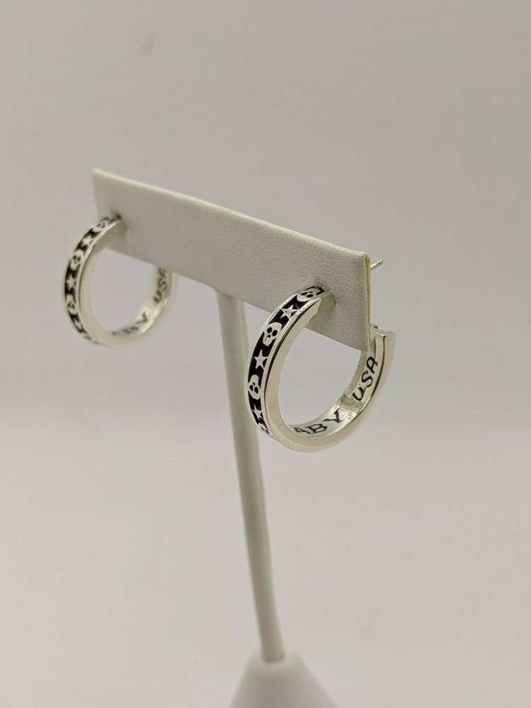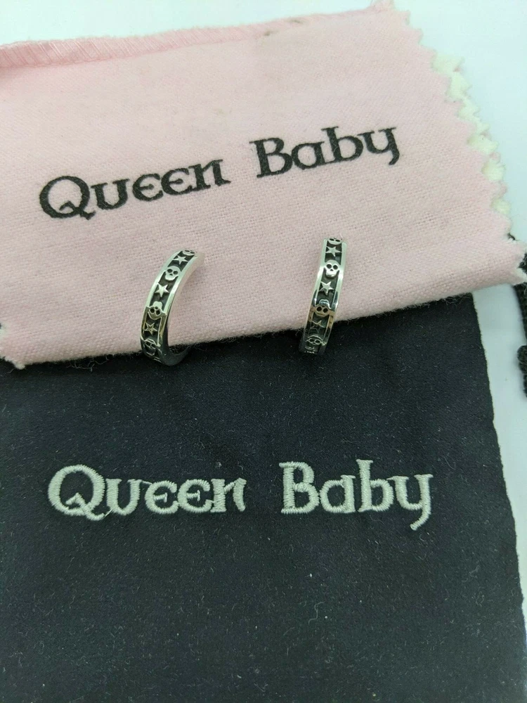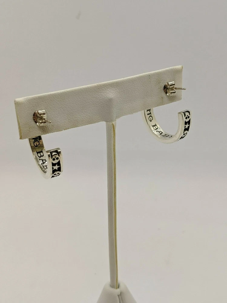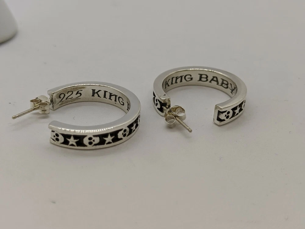 Welcome to my e B a y Store King Baby Studio Sterling Silver Queen Baby Skull & Stars Hoop Earrings Width - 24mm Total Weight - 10.8 grams Professionally Polished & Looks Brand New Pouch & Cloth Included Bid With Confidence Feel Free to ask any questions before bidding please If you would like additional pictures please send me a message Check out my other listings for more great deals! 100% Authentic or your Money Back Guarantee!! Free Shipping on All Items!