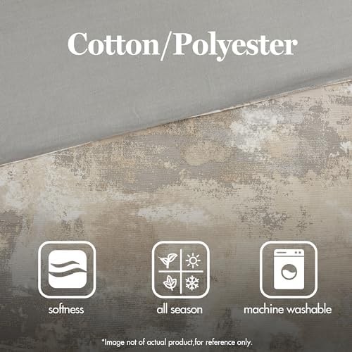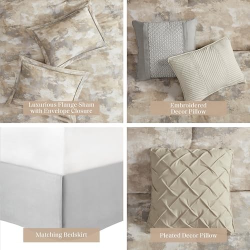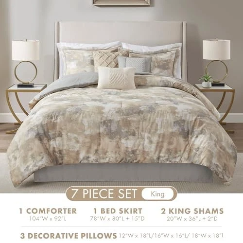 Exquisite Design - This luxurious bedding set showcases an abstract print in shades of gray, taupe, and cream on a cotton-rich ottoman weave, with a solid gray reverse, creating a glamorous and sophisticated look Bedding Refresh Ensemble - Elevate your space with this luxurious ensemble, featuring flange shams with an envelope closure. The set includes a solid gray bedskirt and three decorative pillows with intricate embroidery, delivering elegant finishing touches Bedding Makeover Set - Elevate your space with this luxurious ensemble, showcasing flange shams with an envelope closure. The bed set includes a solid gray bedskirt and three decorative pillows adorned with embroideries, adding exquisite finishing touches King Comforter Set - 1 King Comforter: 104"W x 92"L, 2 King Shams:20"W x 36"L + 2"D (2), 1 Bed Skirt:78"W x 80"L + 15"D, 1 Decorative Pillow:18"W x 18"L, 1 Decorative Pillow:16"W x 16"L, 1 Decorative Pillow:12"W x 18"L Easy Care - Machine washable. Use large capacity washer and dryer for best results. Cold/delicate cycle, low/no heat dry. Comes in compressed d & smaller packaging reducing carbon footprint. To remove wrinkle, use fabric steamer and fluff up as needed