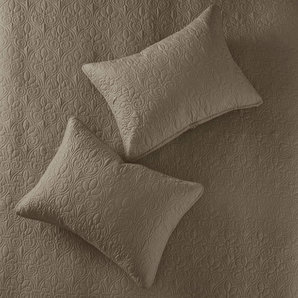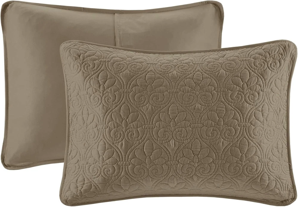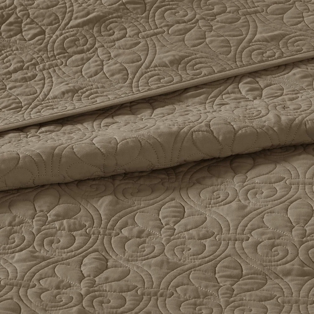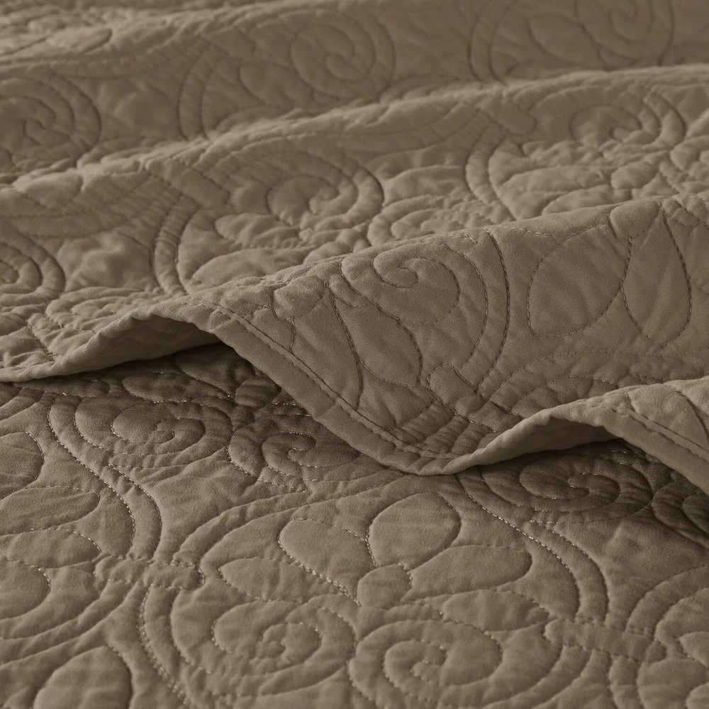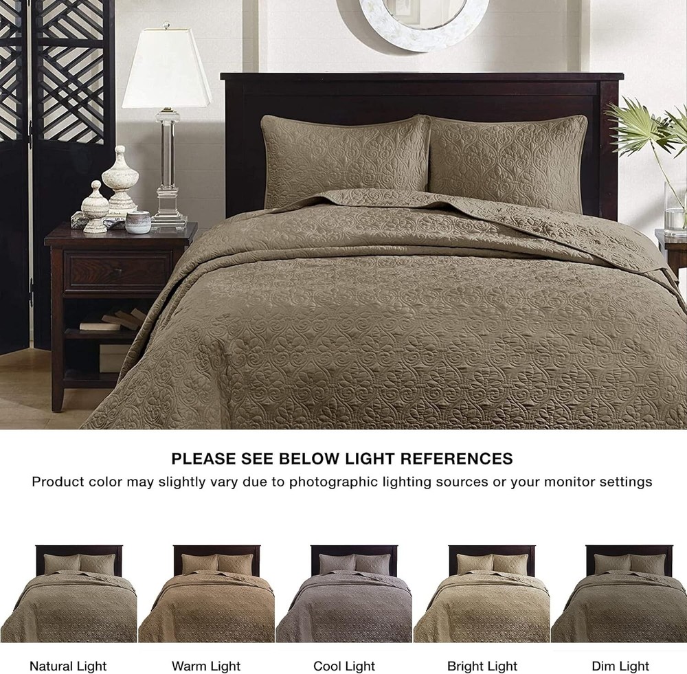 King Size Bedding Mocha Brown Oversized Bedspread Quilt 3 Pc Set 102 x 118" New This King Size Bedding is a cozy textured bedspread that creates a warm cottage haven. Its mocha brown hue radiates earthy rustic charm. Reversible with a solid design, it offers versatile cozy style. Soft microfiber and cotton fill ensure fresh, lasting comfort. Additional Product Features: - Includes one 120"W x 118"L bedspread and two 20"W x 36"L shams - Polyester microfiber with 90% cotton/10% olefin fill for softness - Features classic quilted stitch pattern with solid reverse - Mocha color enhances casual or traditional decor - Machine washable with antimicrobial treatment for lasting freshness - Oversized for high-depth mattresses, ideal for adult bedrooms - Pre-washed for enhanced comfort and year-round use Transform your bedroom with rustic warmth—grab this King Size Bedding today!
