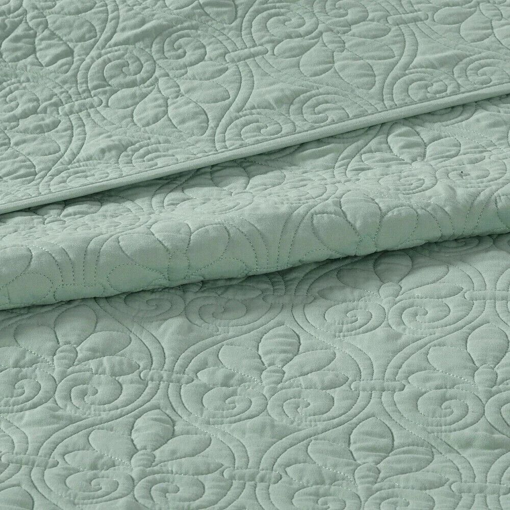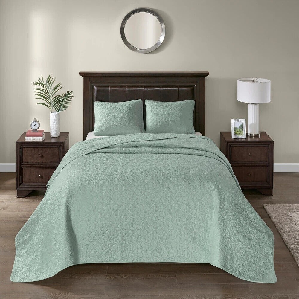 King Size Bedding Oversized Bedspread Quilt Set Green Blue Hues 3 Piece 120x118 This King Size Bedding is a cozy textured bedspread that creates a tranquil cottage retreat. Its seafoam green-blue hue exudes soothing coastal elegance. Reversible with a solid design, it offers versatile serene style. Soft microfiber and cotton fill ensure fresh, lasting comfort. Additional Product Features: - Includes one 120"W x 118"L bedspread and two 20"W x 36"L shams - Polyester microfiber with 90% cotton/10% olefin fill for softness - Features classic quilted stitch pattern with solid reverse - Seafoam color enhances casual or traditional decor - Machine washable with antimicrobial treatment for lasting freshness - Oversized for high-depth mattresses, ideal for adult bedrooms - Pre-washed for enhanced comfort and year-round use Color: Seafoam (is described as a Soft Green tending towards Blue by previous customers) Transform your bedroom with coastal charm—grab this King Size Bedding today!