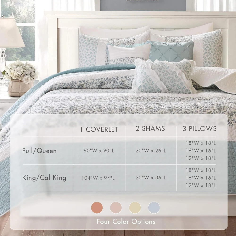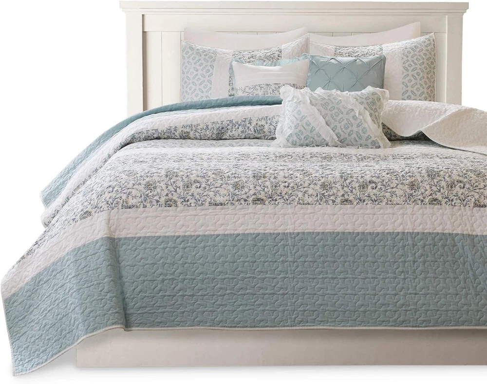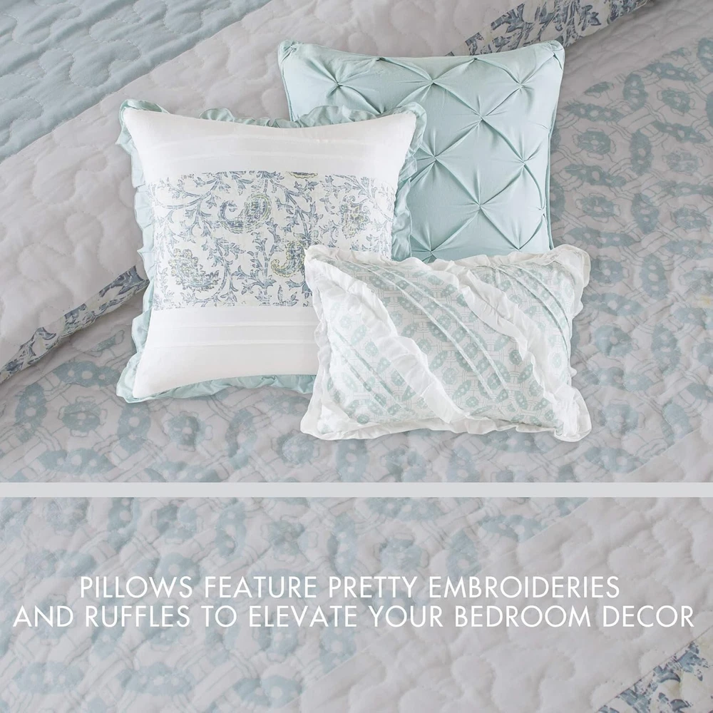 King Size Bedding Quilt Set Modern Farm French Country Shabby Chic Coverlet 6Pc This King Size Bedding Quilt Set will imbue your bedroom with the perfect blend of French County and Shabby Chic style. This sumptuous 6-piece quilt/coverlet set features serene colors and touchable texture that coalesce in an elegant and attractive look that delivers a comfortable sleep space. Additional Product Features: Includes 1 quilt/coverlet, 2 matching shams, 3 decorative pillows 100-percent cotton face Filling is made of 90-percent cotton/10-percent other fiber Bluish Green Hues and paisley pattern Machine washable King Quilt/Coverlet is 104 inches wide x 94 inches long King shams are 20 inches wide x 36 inches long Decorative pillow is 16 inches wide x 16 inches long Decorative pillow is 12 inches wide x 18 inches long Decorative pillow is 18 inches wide x 18 inches long The digital images we display have the most accurate color possible. However, due to differences in computer monitors, we cannot be responsible for variations in color between the actual product and your screen. Add charm and comfort to your sleep experience with this King Size Bedding