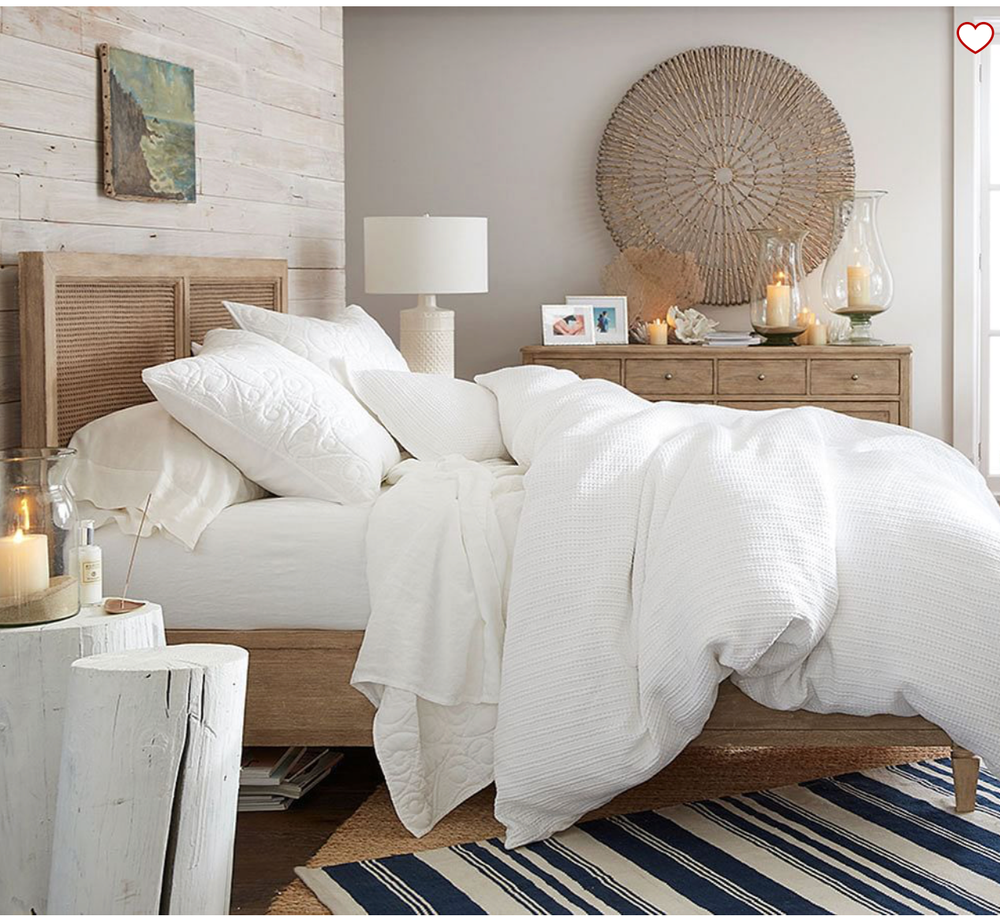 Add classic layers to your bedroom with this pre owned lightly used Pottery Barn King Size Duvet Cover Set. The set includes a king cotton duvet cover and 2 euro shams in a beautiful honeycomb design, perfect for adding a touch of sophistication to your space. The white color complements any decor, making it a great choice for any bedroom.