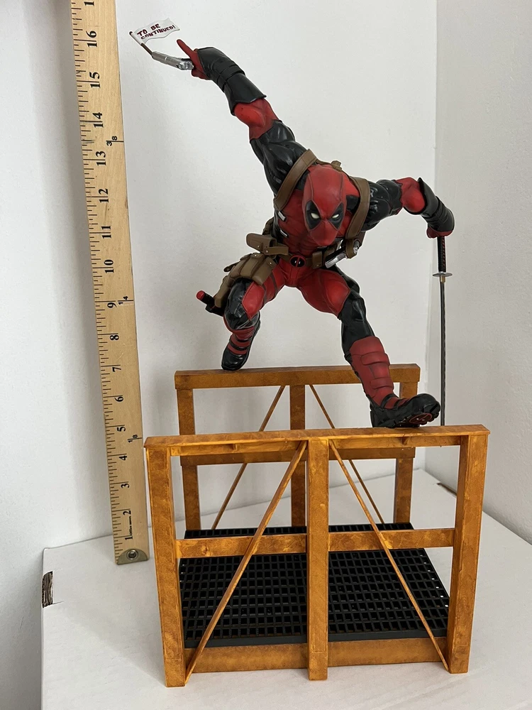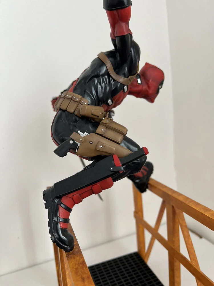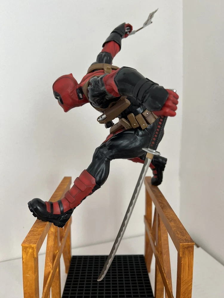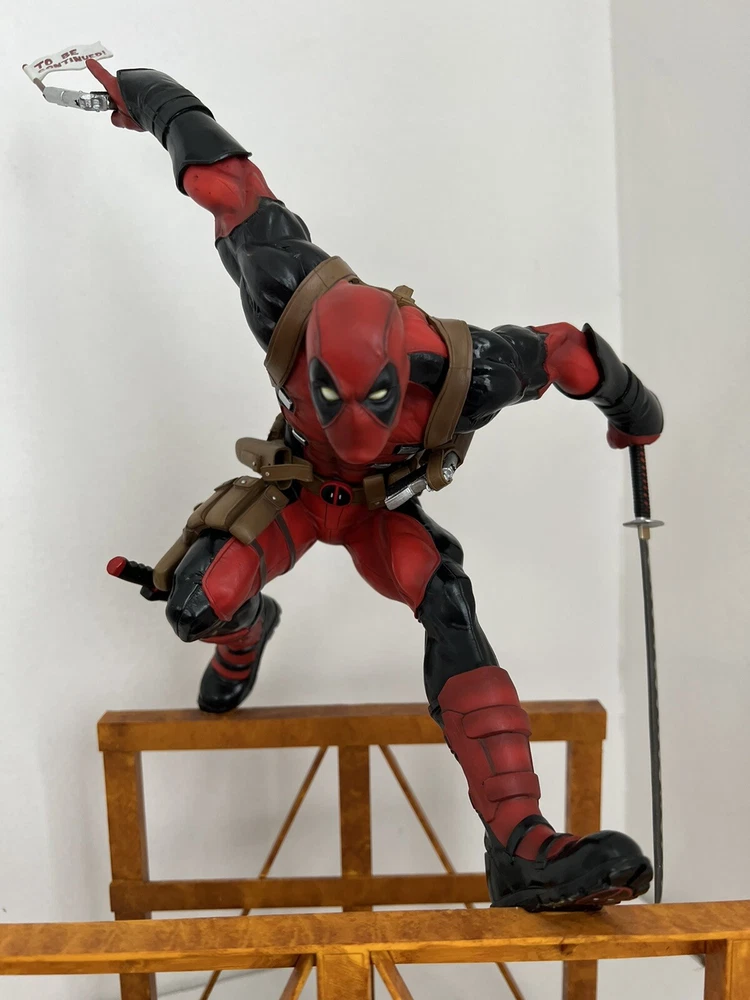 Hello selling Kotobukiya Marvel Now Deadpool/Wolverine: Deadpool ArtFX Statue Figure 16in tall. In pretty good condition but please zoom in pictures to distinguish condition yourself. Not sure if anything is missing, what you see in pictures is what you’ll be receiving. Comes without original box. Shipping from san francisco, CA but local pickups welcomed.
