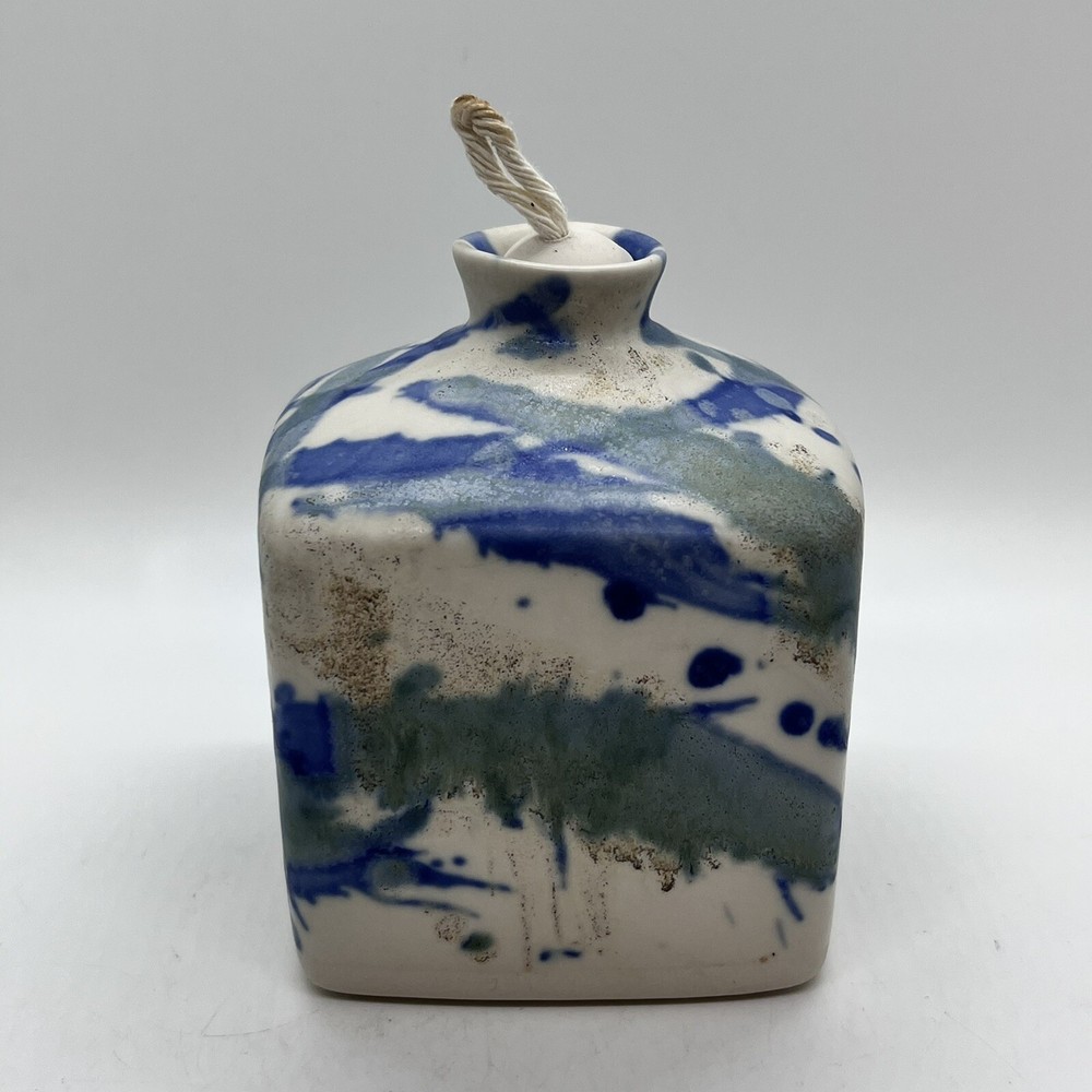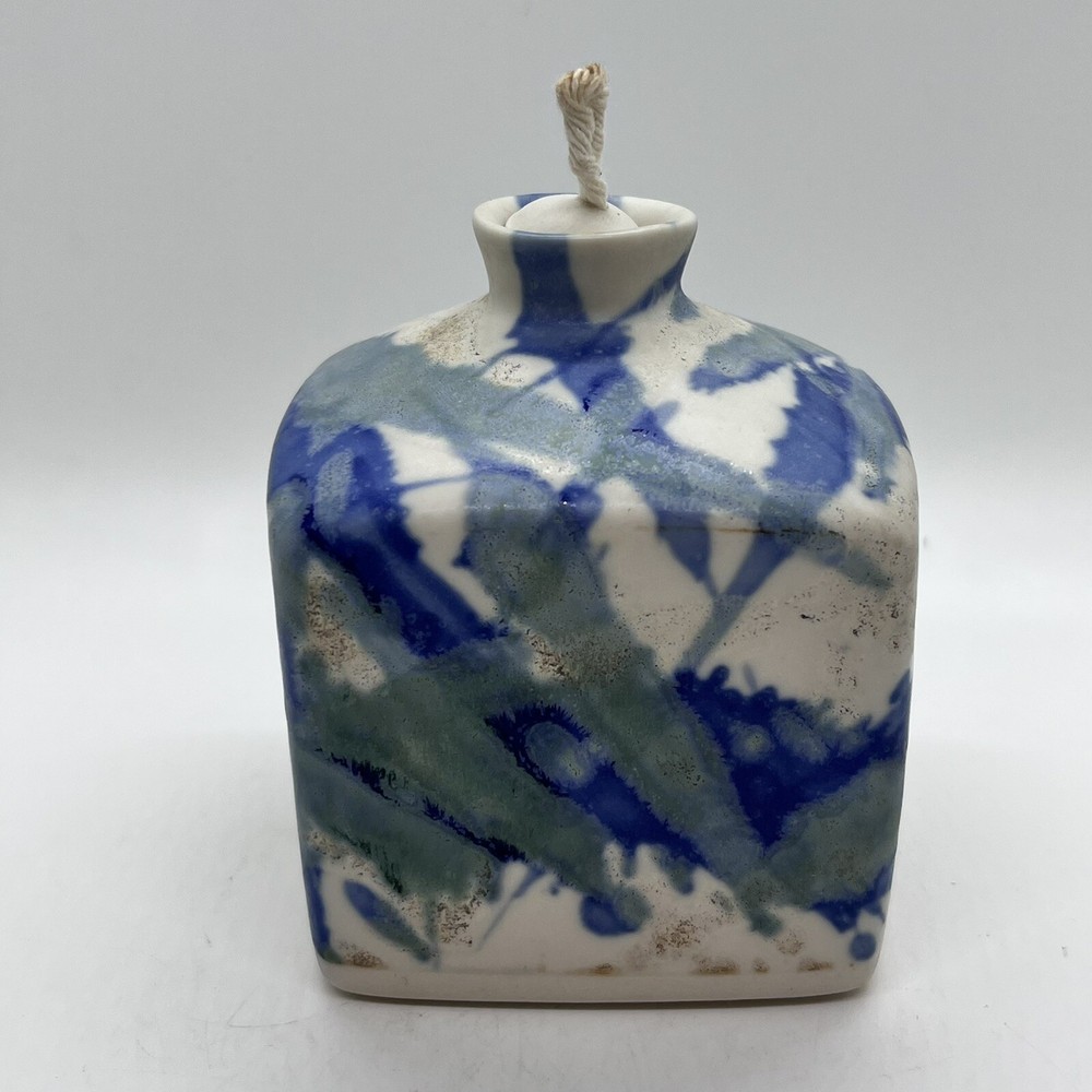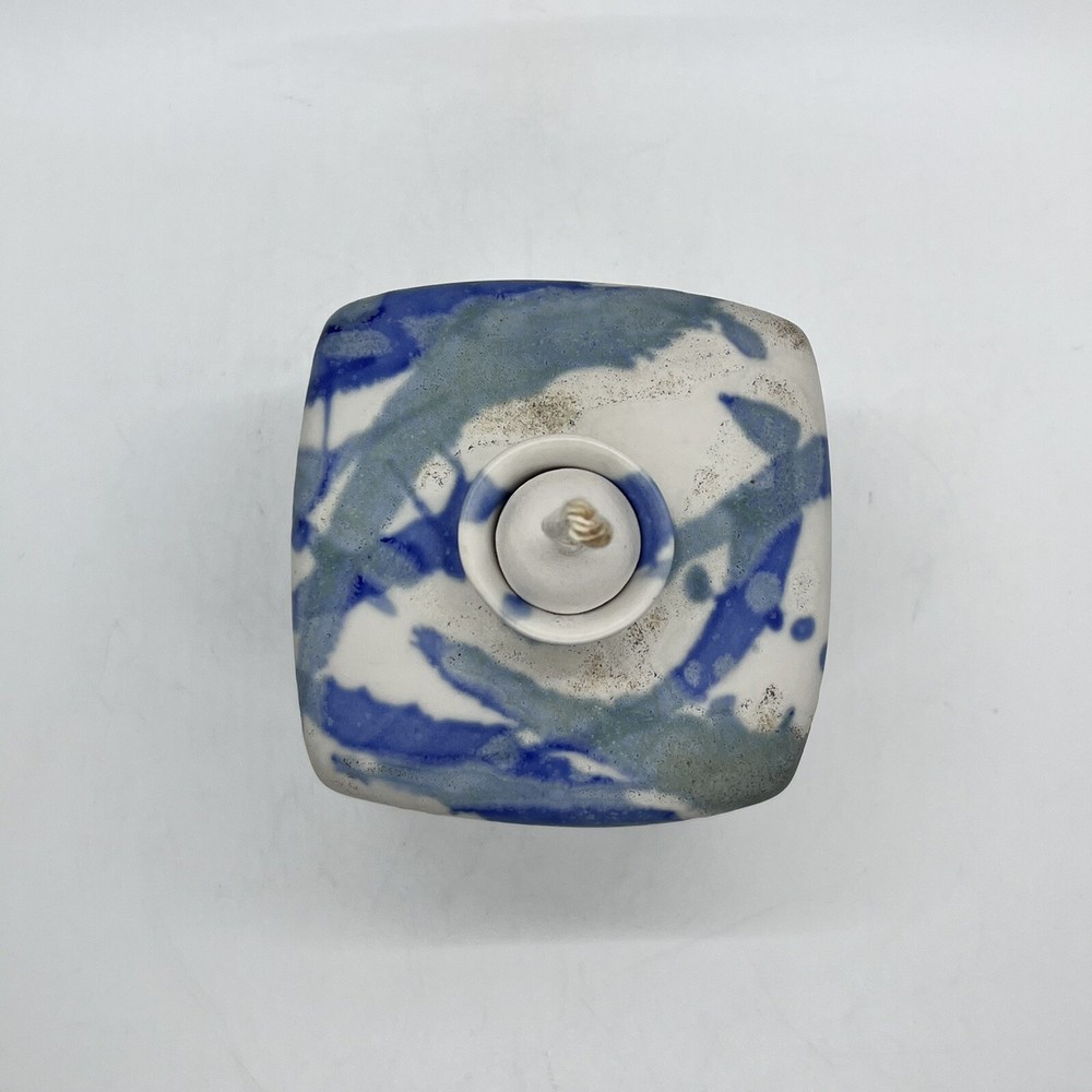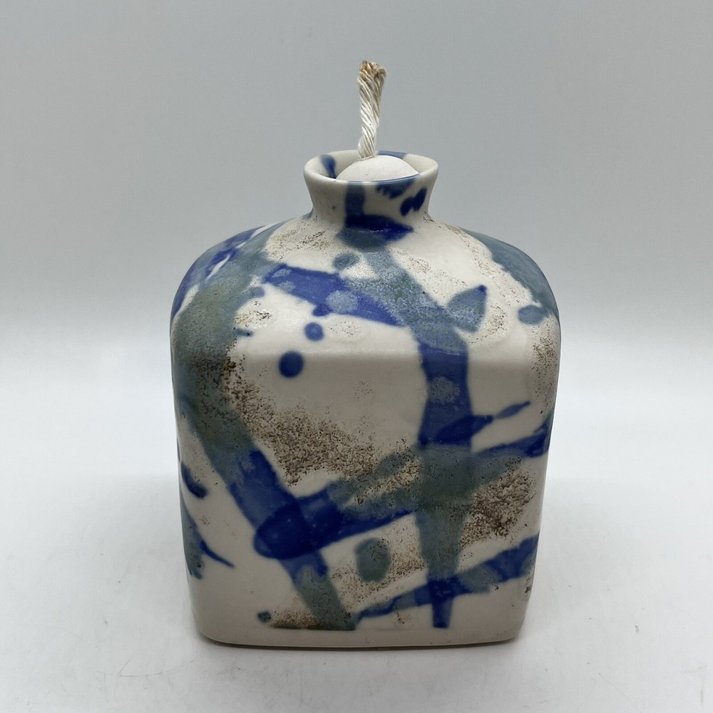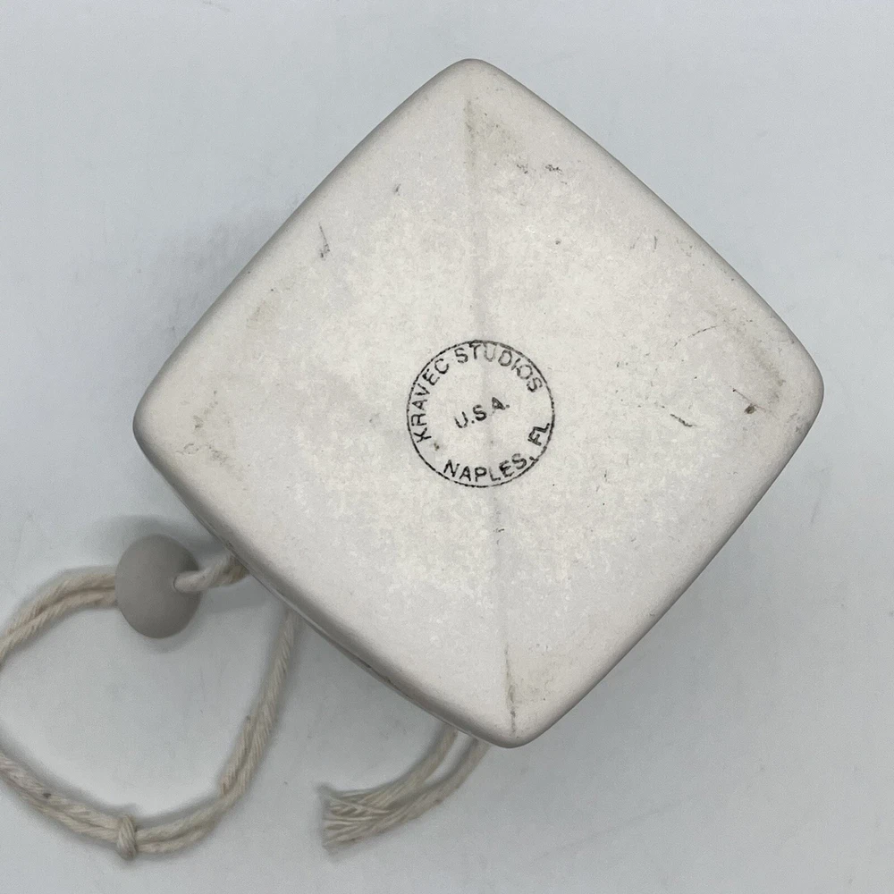 This Kravec Studios blue glazed ceramic square oil lamp bud vase is a unique addition to any mid-century modern decor. Handmade in Naples, Florida, this vintage original features an abstract pattern with a color that adds a pop of blue to any room. The 3" length and width make it a perfect size for a small space, while the 4.25" height adds a touch of elegance. The Kravec Studios oil lamp bud vase is a production technique that uses art pottery to create a one-of-a-kind piece. The United States-made vase is a licensed reproduction that showcases the brand's studio theme. The vase is made of ceramic material and is perfect for those who love vintage original pieces.