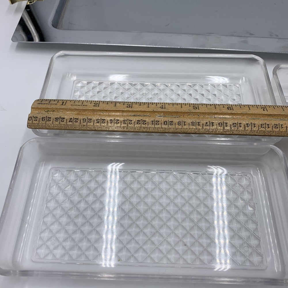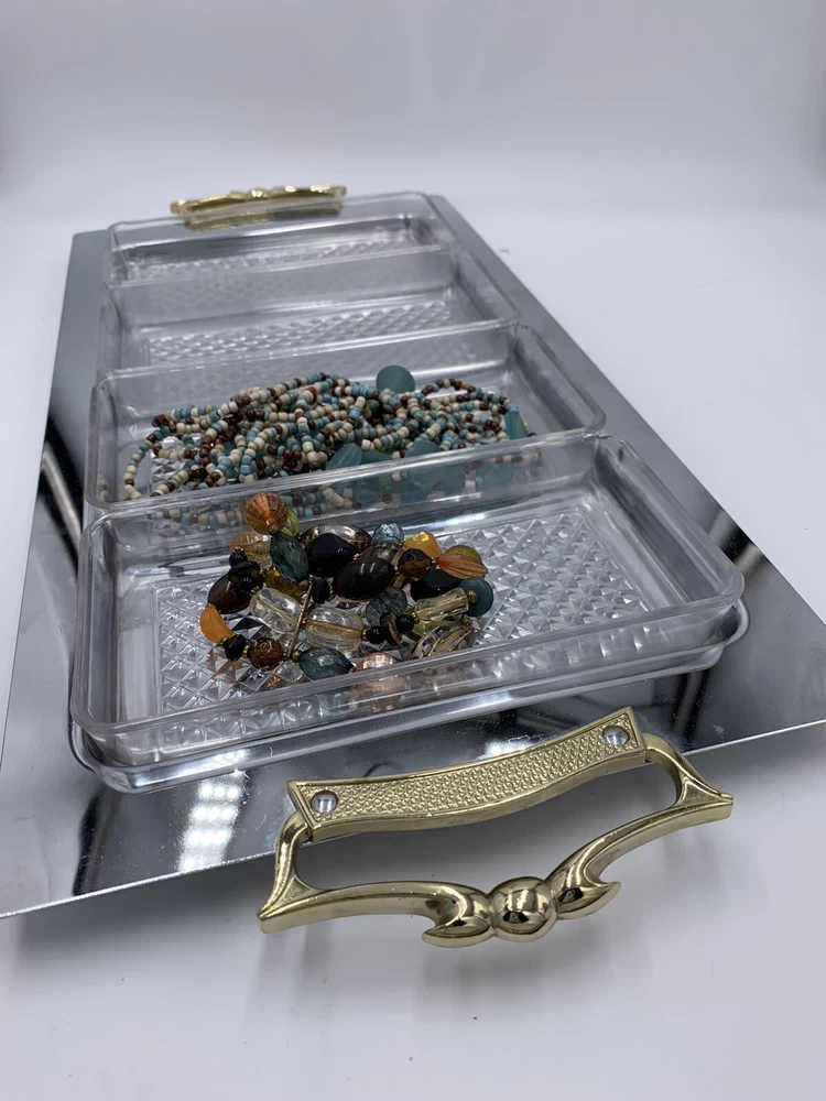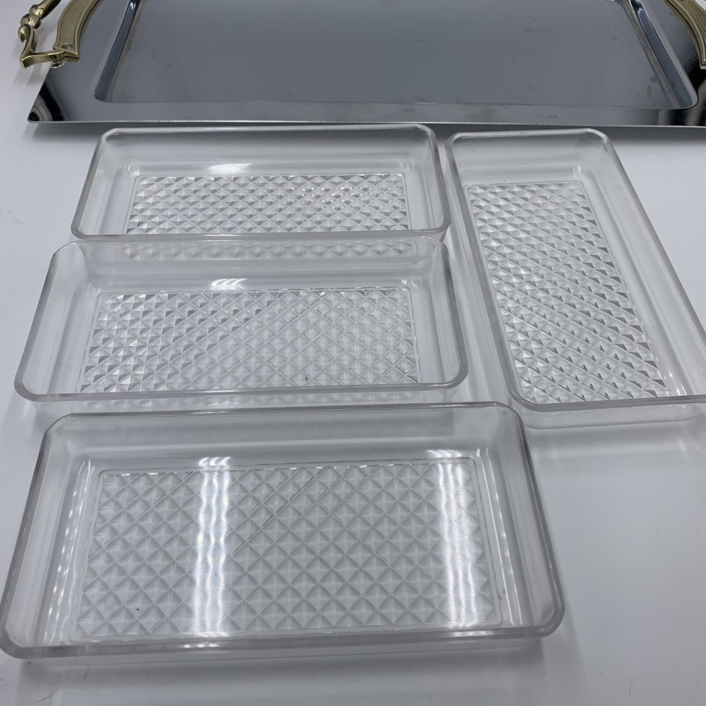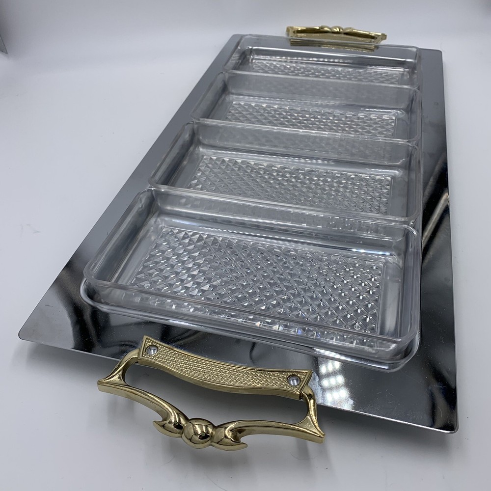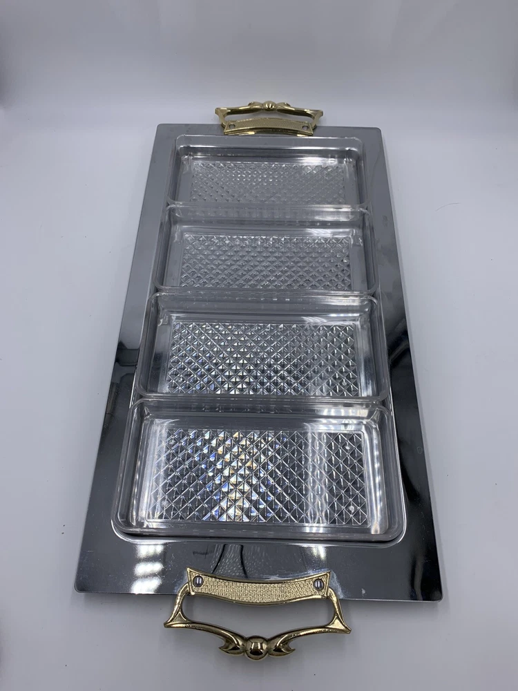 Kromex Tray w 4 Acrylic Dividers Condiment Horderves approximately 20 X 9 Silver Gold Vanity. Fantastic multi functional piece. Could be used at parties for dips, hordervse, cookies, veggies, or used as a vanity tray or to separate pieces while crafting. In very good Condition, very minimal scratches on the front, scratches to the back, all the trays are in good condition with nothing broken. Please look over pictures and feel free to ask questions