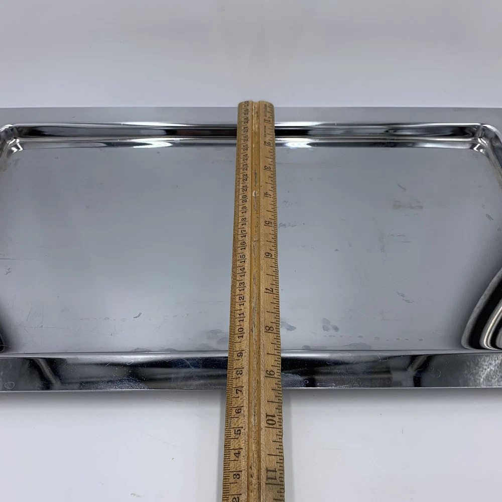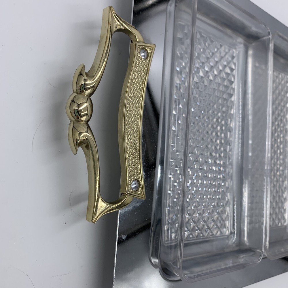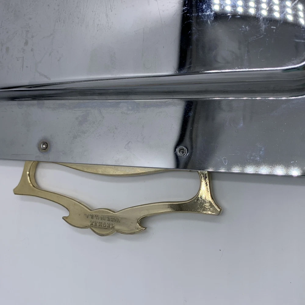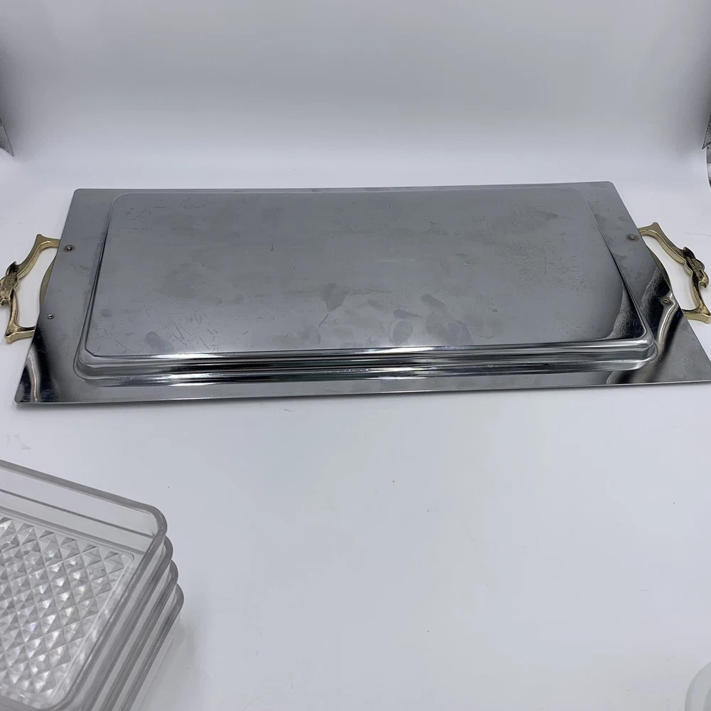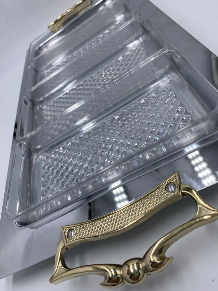 Kromex Tray w 4 Acrylic Dividers Condiment Horderves approximately 20 X 9 Silver Gold Vanity. Fantastic multi functional piece. Could be used at parties for dips, hordervse, cookies, veggies, or used as a vanity tray or to separate pieces while crafting. In very good Condition, very minimal scratches on the front, scratches to the back, all the trays are in good condition with nothing broken. Please look over pictures and feel free to ask questions