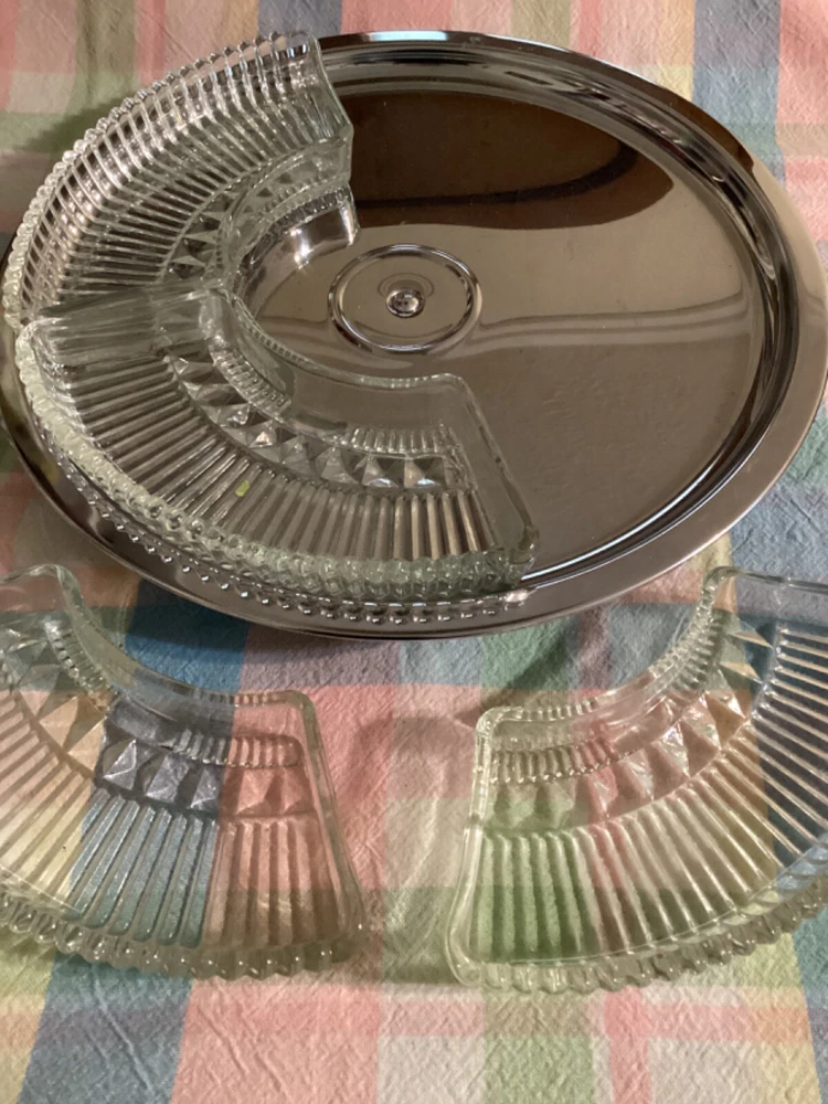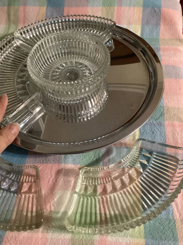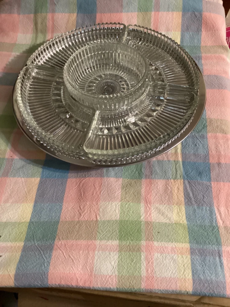 Add a touch of vintage charm to your dining table with this Kromex cut glass dip set. The large round lazy Susan, measuring 14 inches in diameter, is the perfect addition to any dinner party or gathering. Crafted with high-quality glass and chrome materials, this set is built to last and impress. The ribbed pattern and chrome-plated finish give this dip set a unique and elegant look that is sure to catch the eye of your guests. Whether you're serving up your favorite dips or simply displaying it as a decorative piece, this Kromex vintage cut glass dip set is sure to be a cherished addition to your kitchen and home collection.