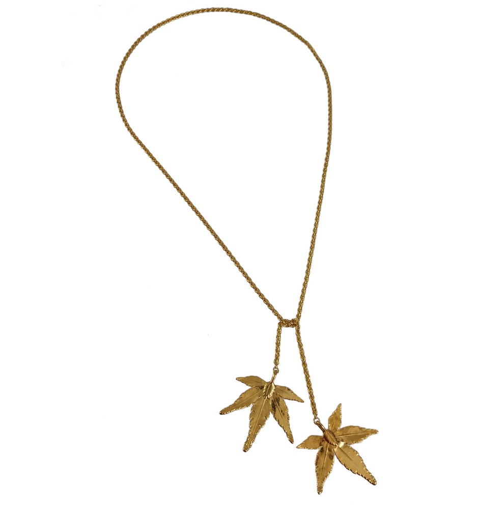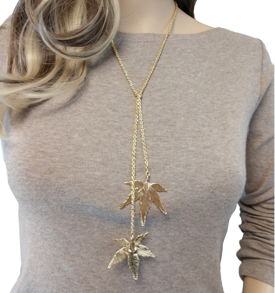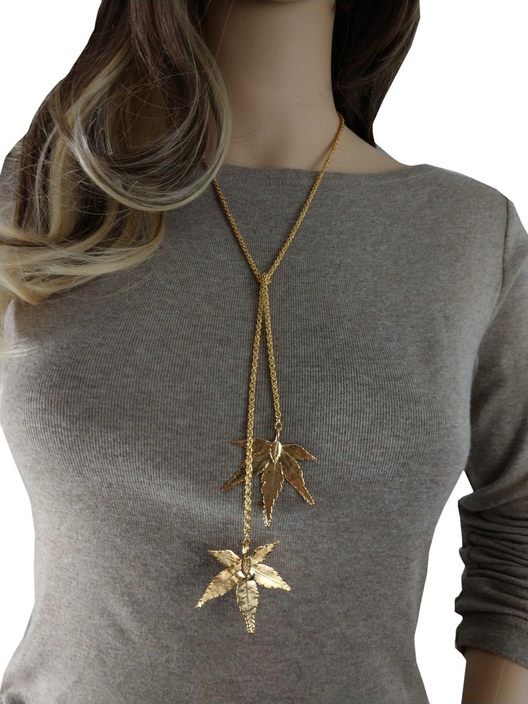 Treat yourself to this charming lariat necklace. It features a hand dipped genuine leaf form to create this wonderful piece. These pendants are natural leaves and they vary in size and exact design as natural items do. The pendants are approximately 1.75" long on a 30" rope chain. This can be beautifully worn a variety of ways. It also makes for the perfect gift to a loved one or yourself.