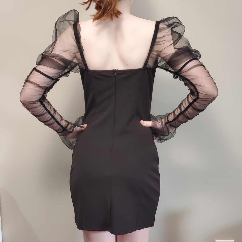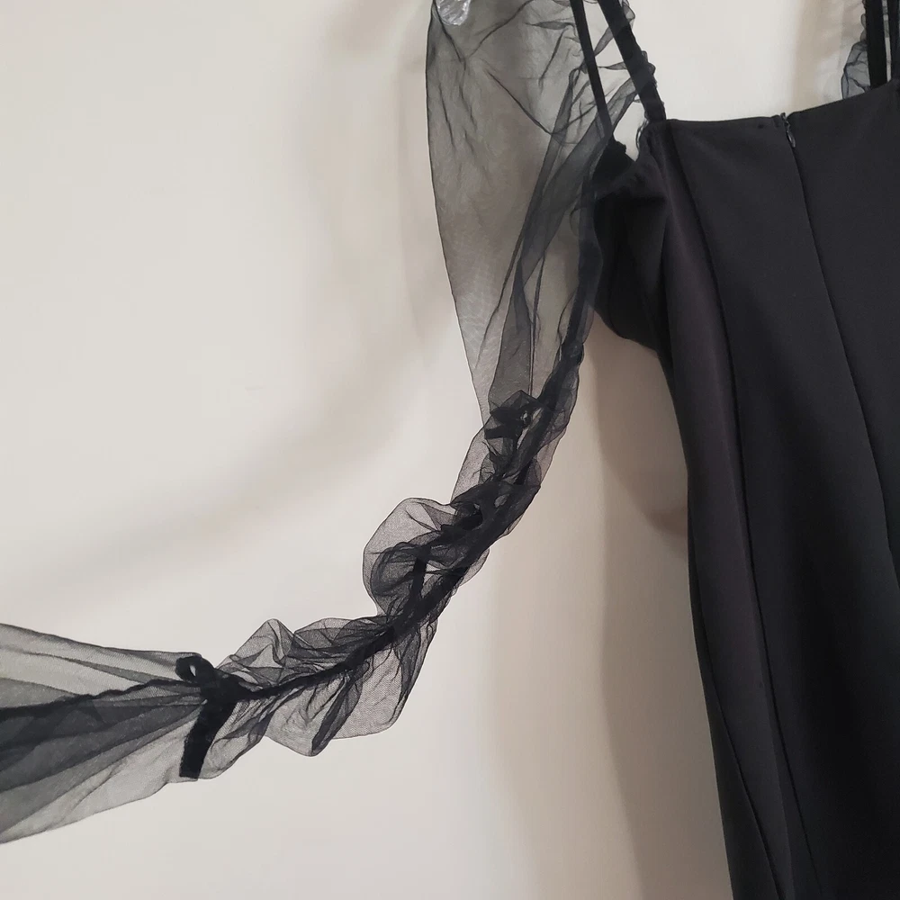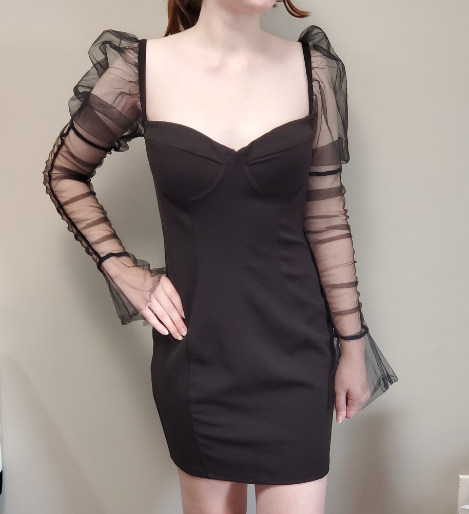 This dress is a total showstopper! The mesh sleeves add a gothic edge while the bodycon fit hugs perfectly. Super flattering and comfortable—feels like it was made just for me. The quality is amazing, looks brand new, and arrived super fast. Perfect for nights out or special events. Absolutely love it!