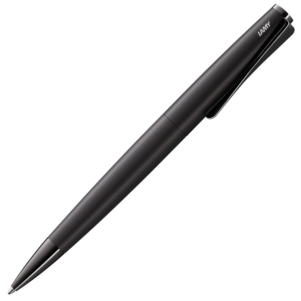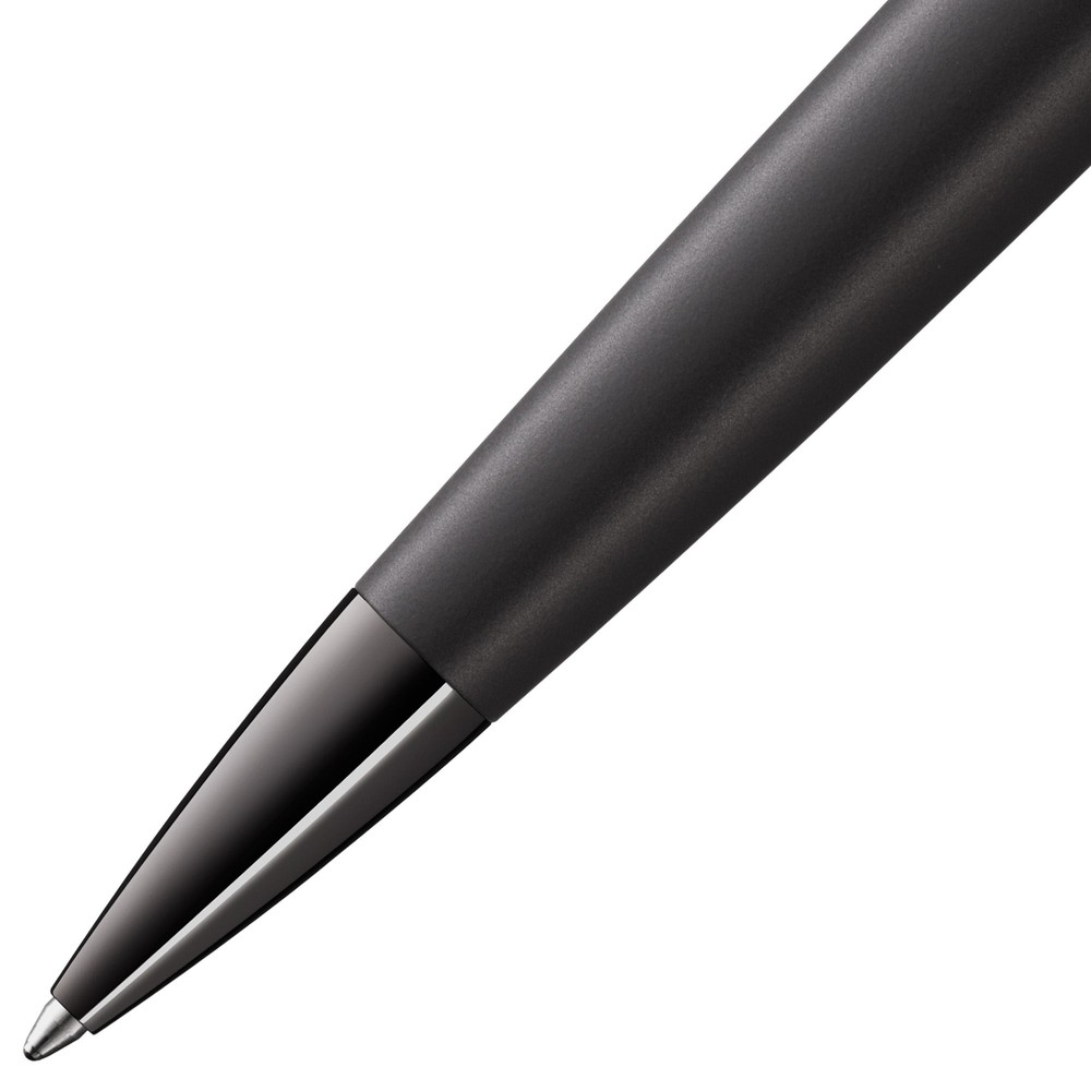 Timeless perfection. The LAMY studio convinces with timeless elegance and a universal design. The bulgy cylindrical shape of its all-metal body results seamlessly from the individual housing parts and is deliberately kept minimalist. The gentle curvature and harmonious proportions make the clip the trademark of the LAMY studio: it contrasts the matter-of-fact basic shape with an innovative design accent and creates a unique overall appearance. The LAMY studio is assembled by hand at the LAMY craftsman's workshop in Heidelberg. In regularly released special editions, it reinvents itself again and again and thus should not be missing on any desk - whether as a premium writing instrument suitable for everyday use or as a collector's item. Ballpoint pen / twist-action mechanism / matt black lacquer finish / steel propeller-shaped clip, black / with giant refill LAMY M 16 M black