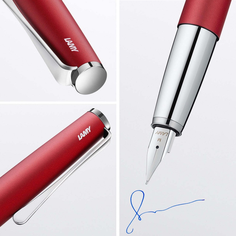 The LAMY studio convinces with timeless elegance and a universal design. The bulgy cylindrical shape of its all-metal body results seamlessly from the individual housing parts and is deliberately kept minimalist. The gentle curvature and harmonious proportions make the clip the trademark of the LAMY studio: it contrasts the matter-of-fact basic shape with an innovative design accent and creates a unique overall appearance. The LAMY studio is assembled by hand at the LAMY craftsman's workshop in Heidelberg. In regularly released special editions, it reinvents itself again and again and thus should not be missing on any desk - whether as a premium writing instrument suitable for everyday use or as a collector's item. Fountain pen / matt red lacquer finish / steel propeller-shaped clip / steel nib, polished / with ink cartridge LAMY T 10 blue / can be used with converter LAMY Z 27