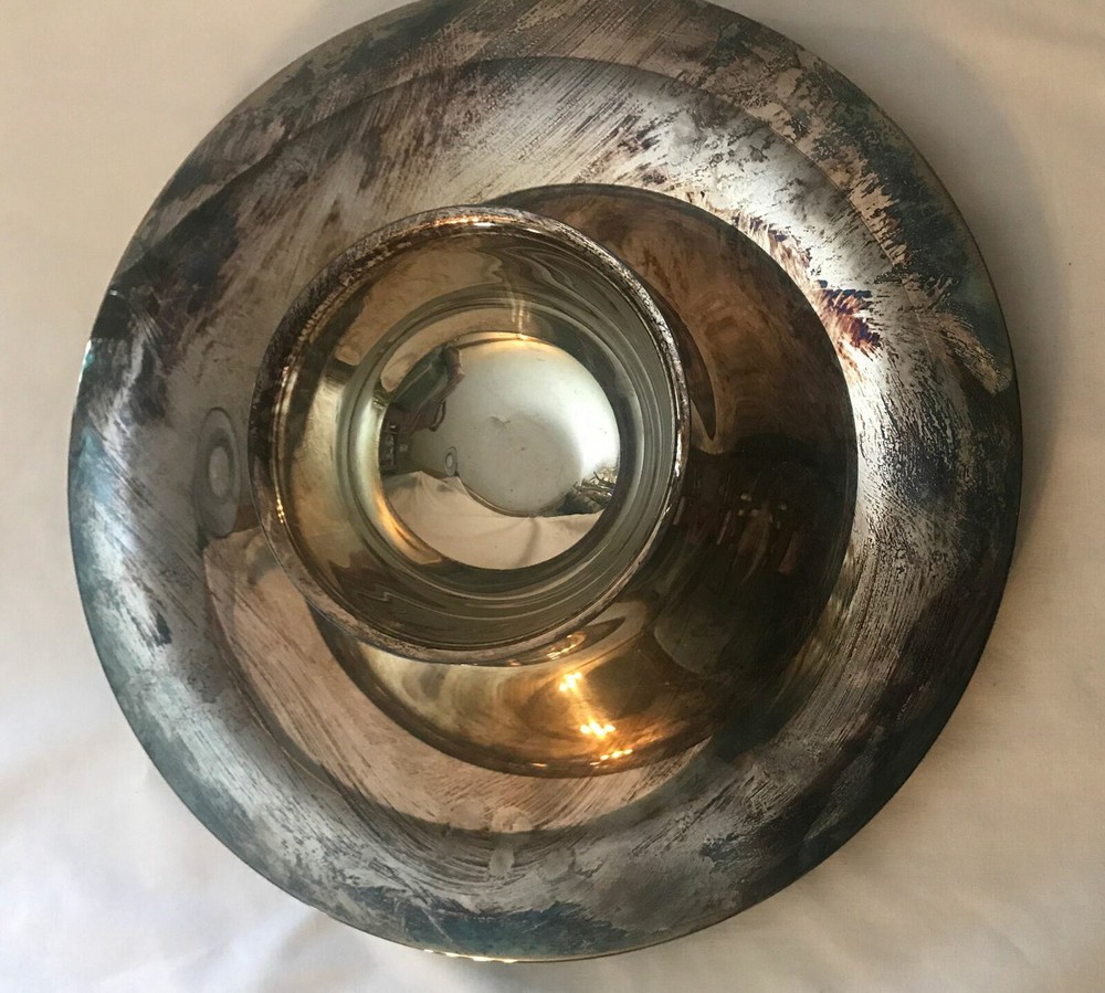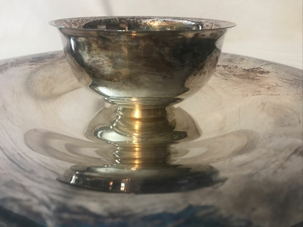 Has tarnish and needs polished, in good shape 12 inches across attached bowl is 5 inches wide and and a half inches deep. I don't know the maker. More Great Stuff Listing Weekly! Be sure to add me to your FAVORITES LIST and check out my VINTAGE STORE! THANK YOU for looking! I ship within 24 hours of payment! Please pay promptly. If you need to make other arrangements to pay later than 7 days, please just keep the communication open and email me thru Ebay. I combine shipping! Track Page Views With Auctiva's FREE Counter Listing and template services provided by inkFrog