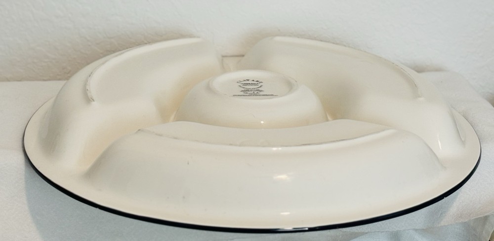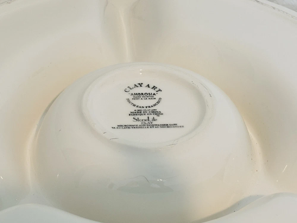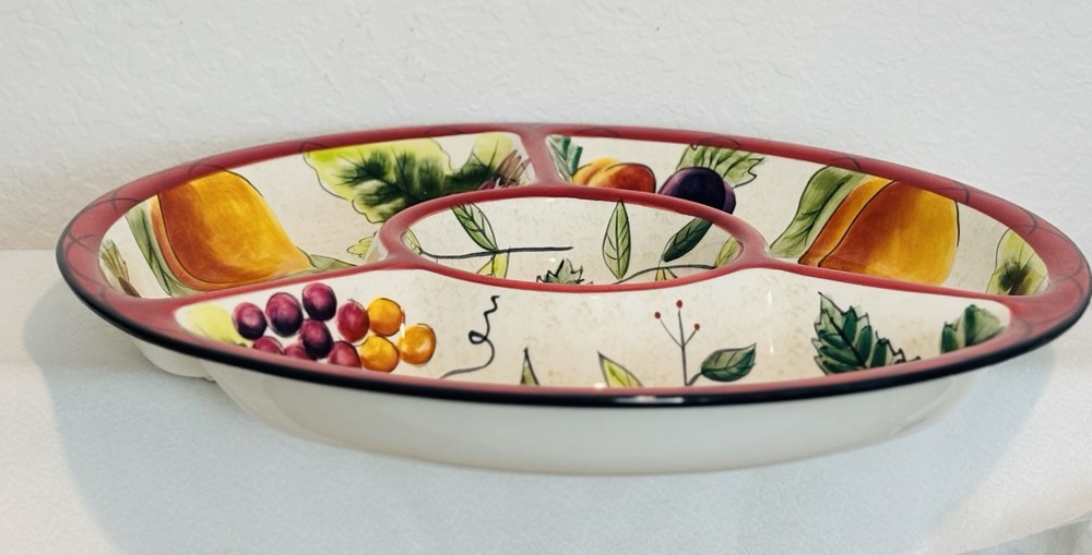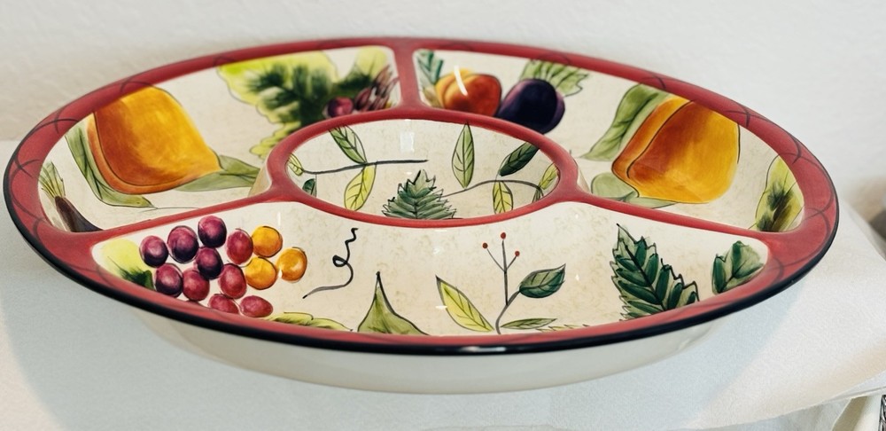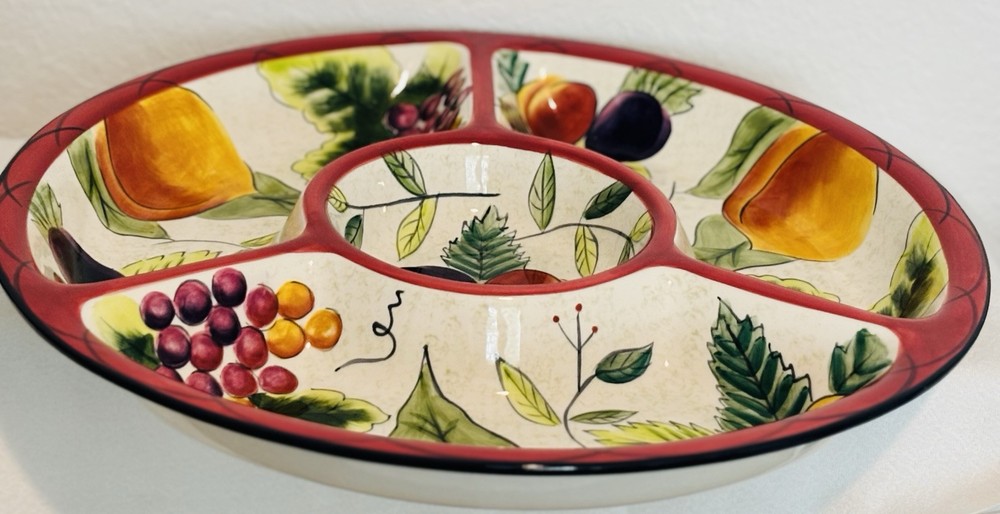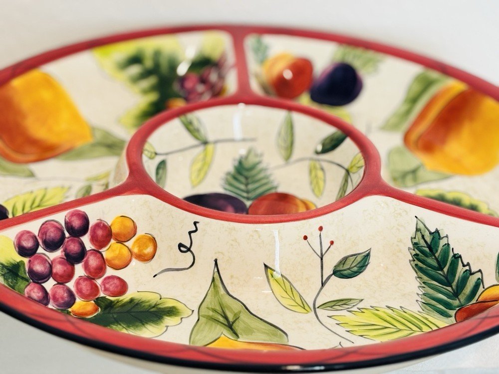 A large serving platter by Clay Art from 2001, designed for serving veggies, fruit, and dips. The platter is sectioned and features a vibrant multicolor Ambrosia design. Made of clay, this round platter is perfect for both practical use and decorative display.