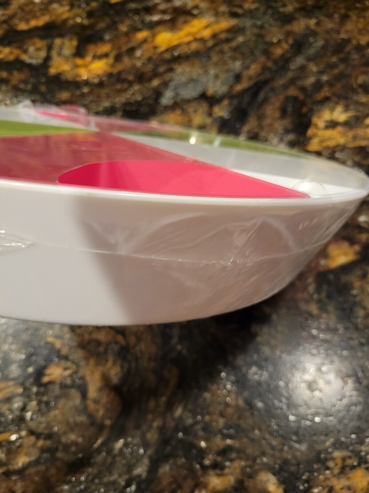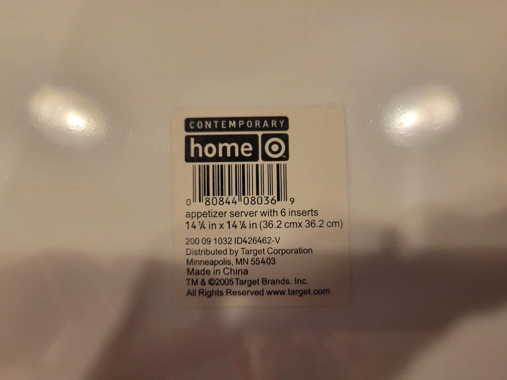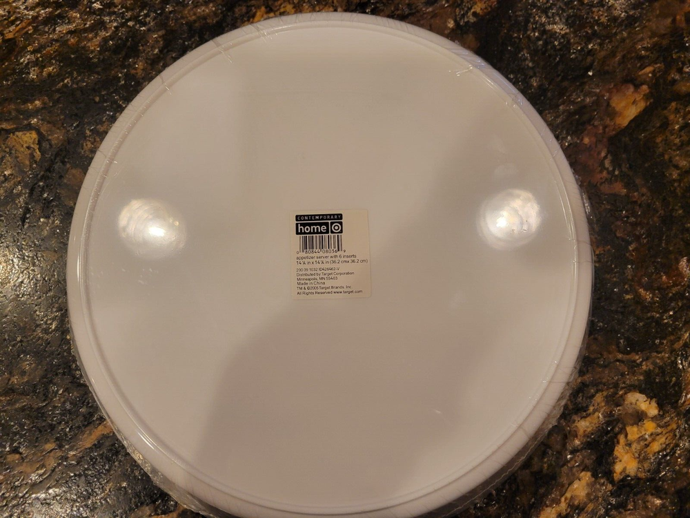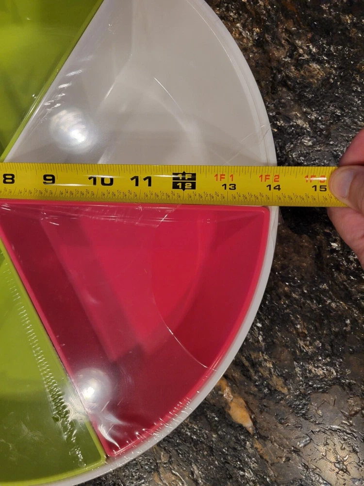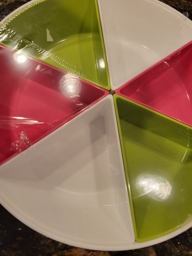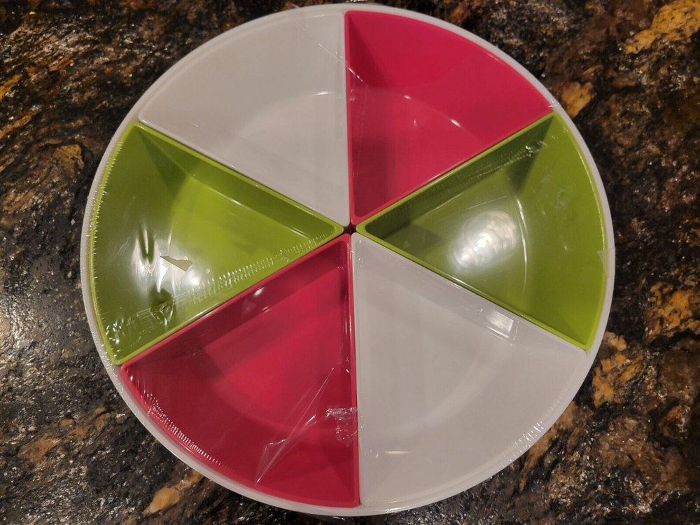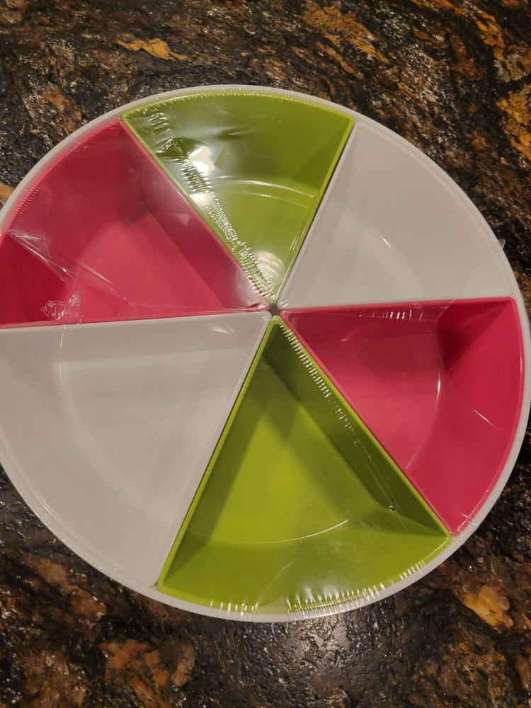 NEW LARGE 6 DEEP DIVIDED APPETIZER VEGETABLE FRUIT CHIP AND DIP SERVING TRAY WITH INSERTS Perfect for keeping your food and snacks organized. With 6 divided compartments, it's great for parties or everyday use. Made of durable plastic, this round tray is 14" in diameter and has 6 compartment to hold your favorite topping, fruits, vegetables, chips, and dips. These are really nice.