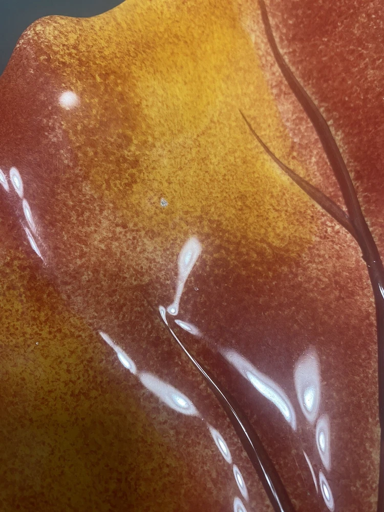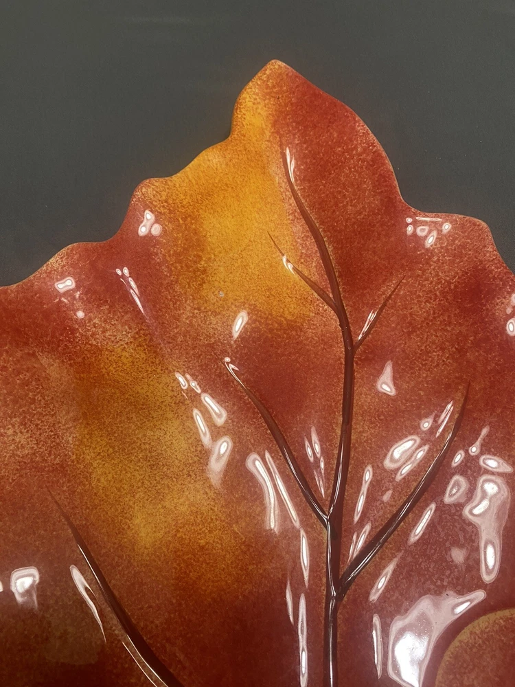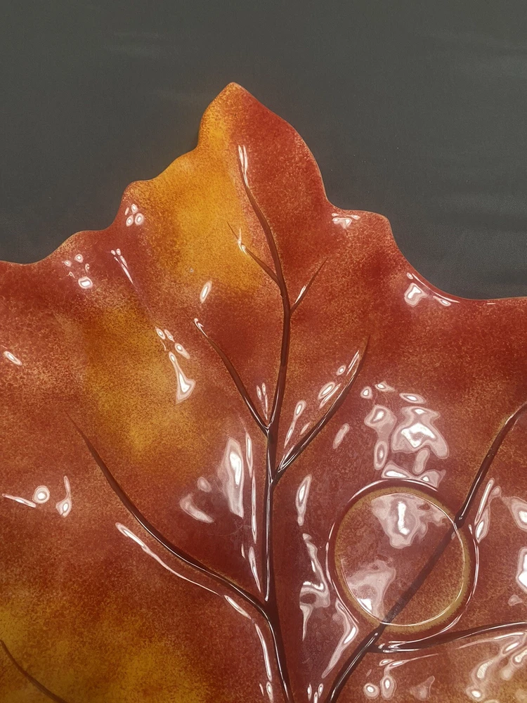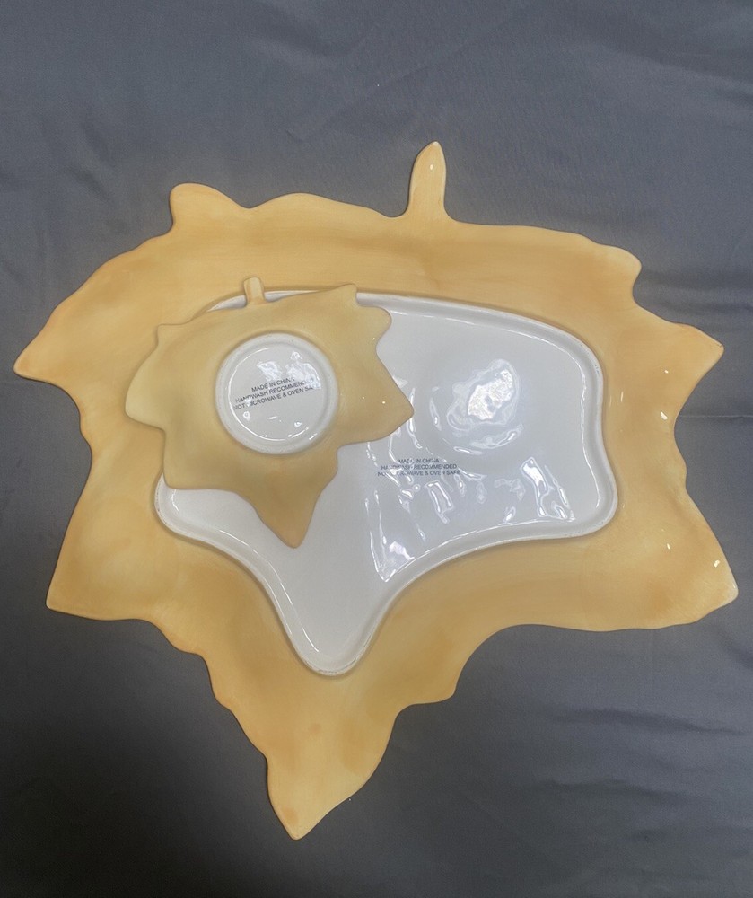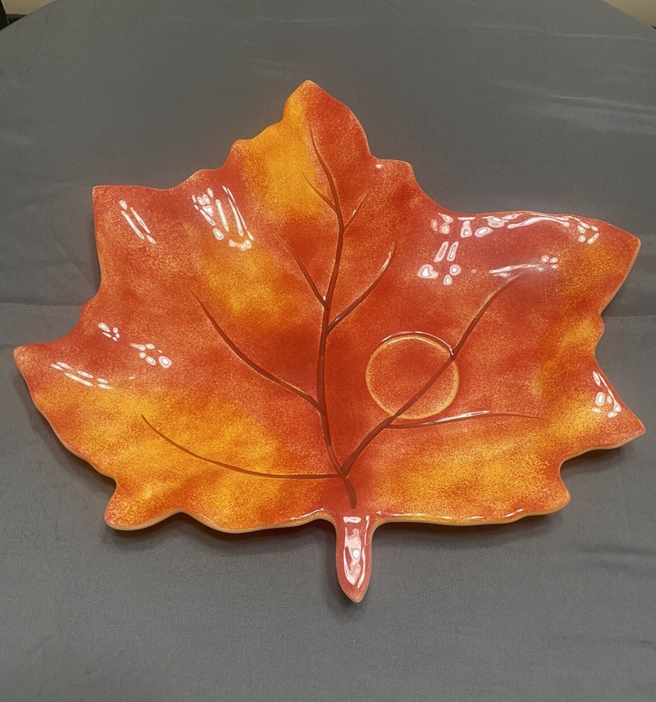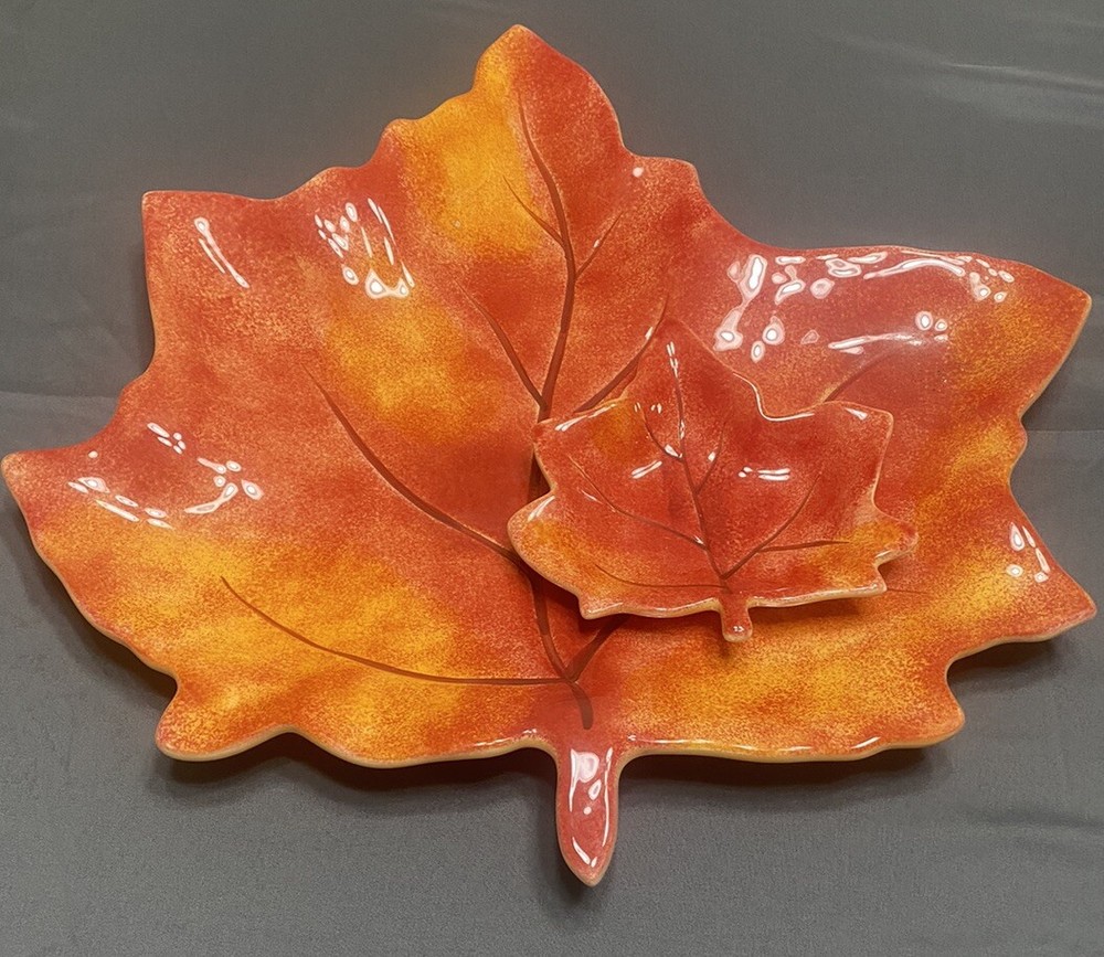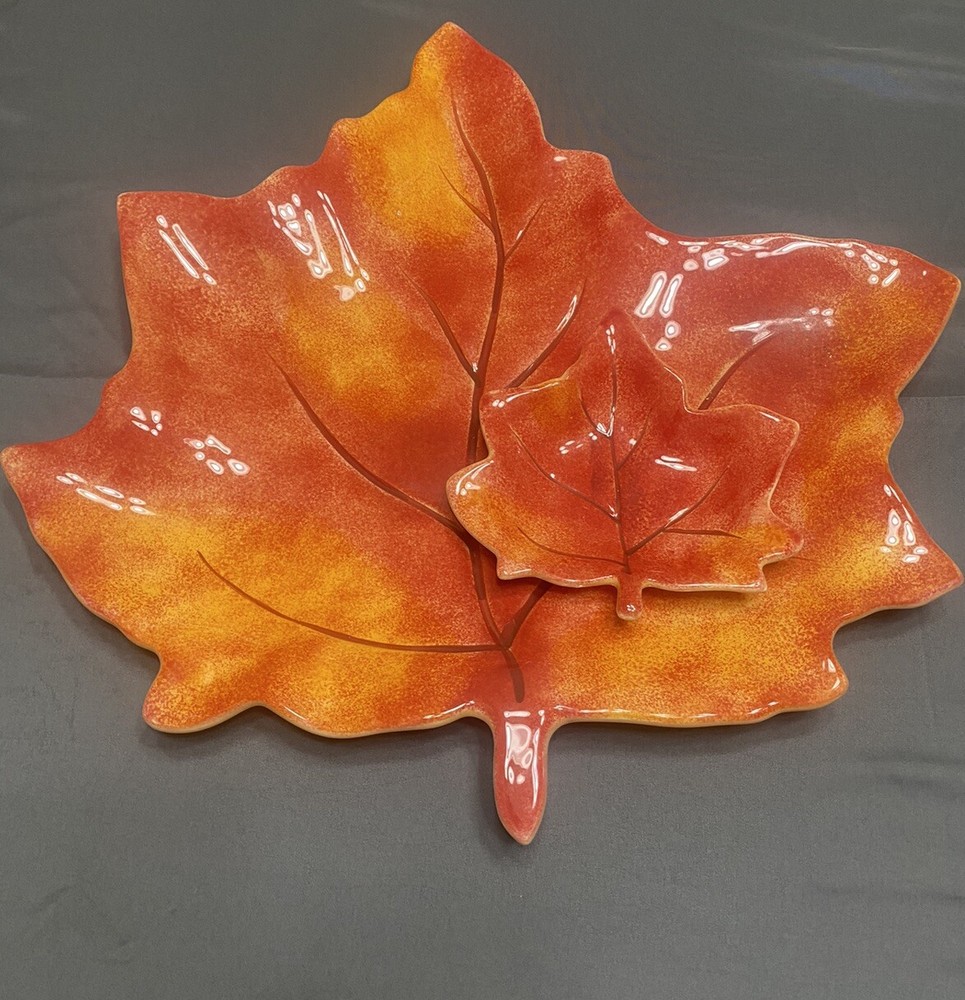 This large leaf tray is perfect for any autumn or fall party. The tray features a beautiful orange color that will complement any holiday decor. Made of ceramic material, this tray is durable and can hold chips, dips, and other small appetizers. It's a great addition to any collection of holiday collectibles and is perfect for Thanksgiving celebrations. The tray is not only functional but also decorative, adding a touch of autumn charm to any table. Get ready to impress your guests with this unique and stylish tray. Larger tray is approximately 17” at its widest points. Smaller tray (dip tray) is approximately 6” at its widest points ** Photos 8-10 show a very small blemish on the Larger Leaf 🍁. Barely noticeable but unfortunately it IS there…still a very beautiful, unique piece!**