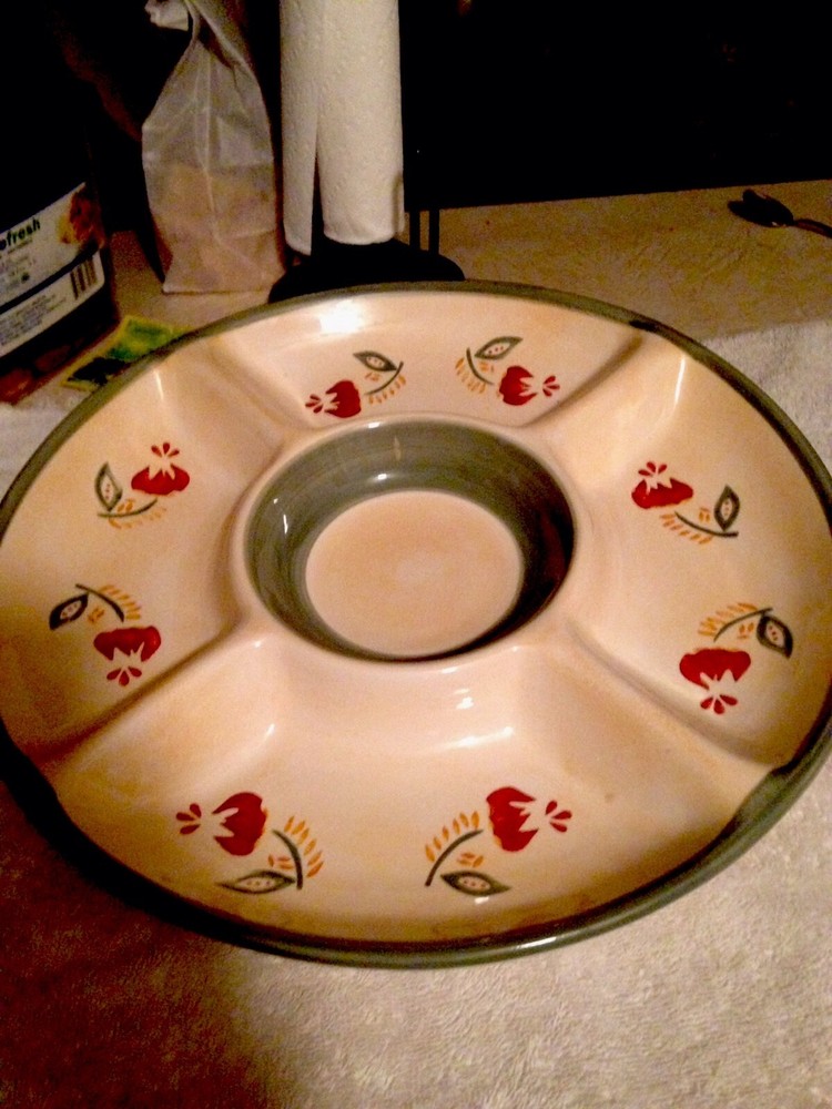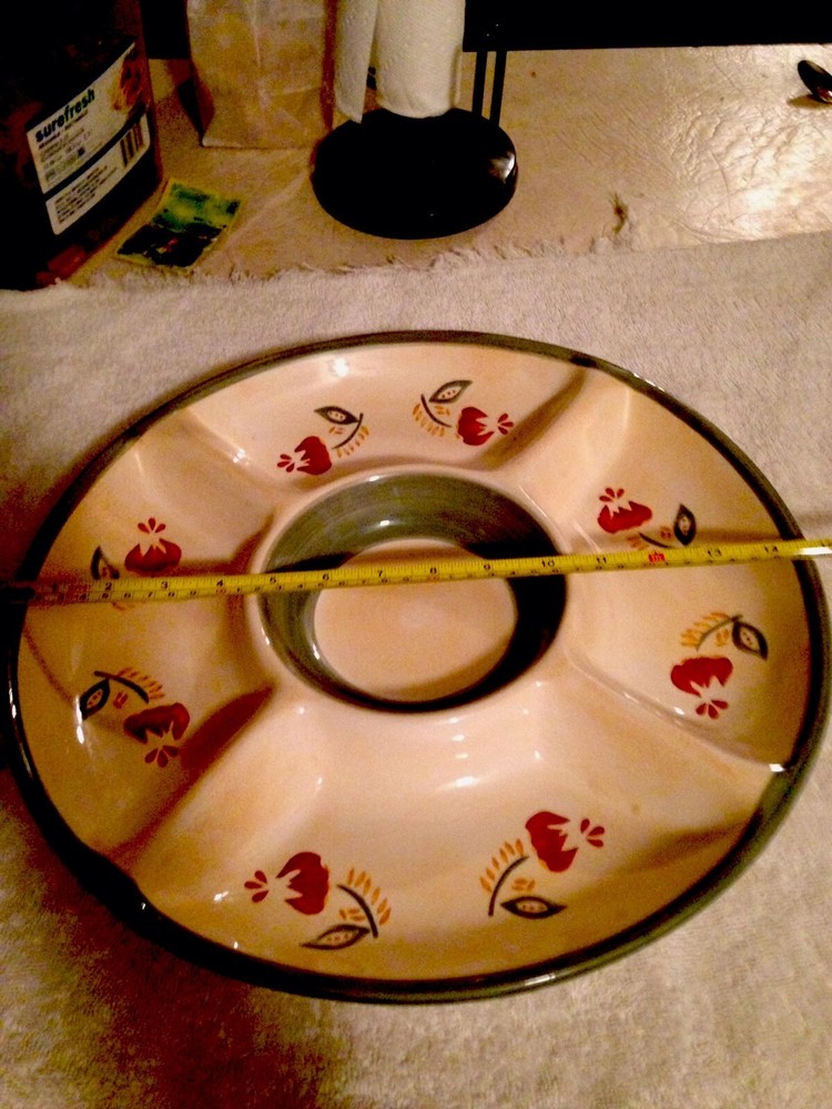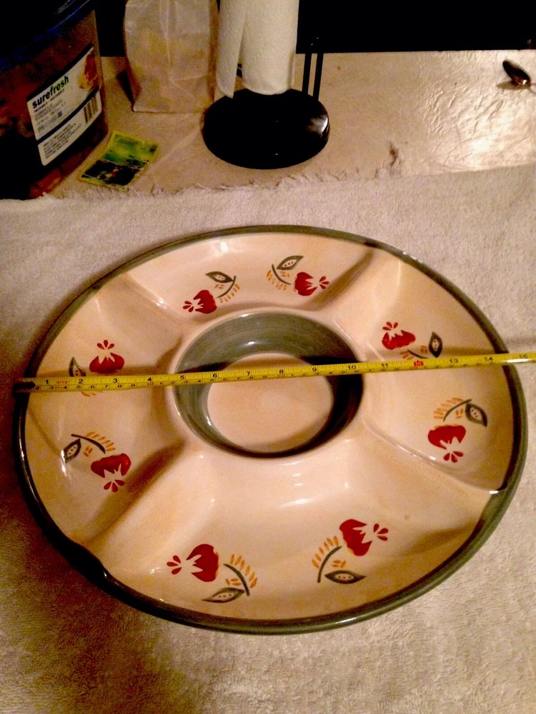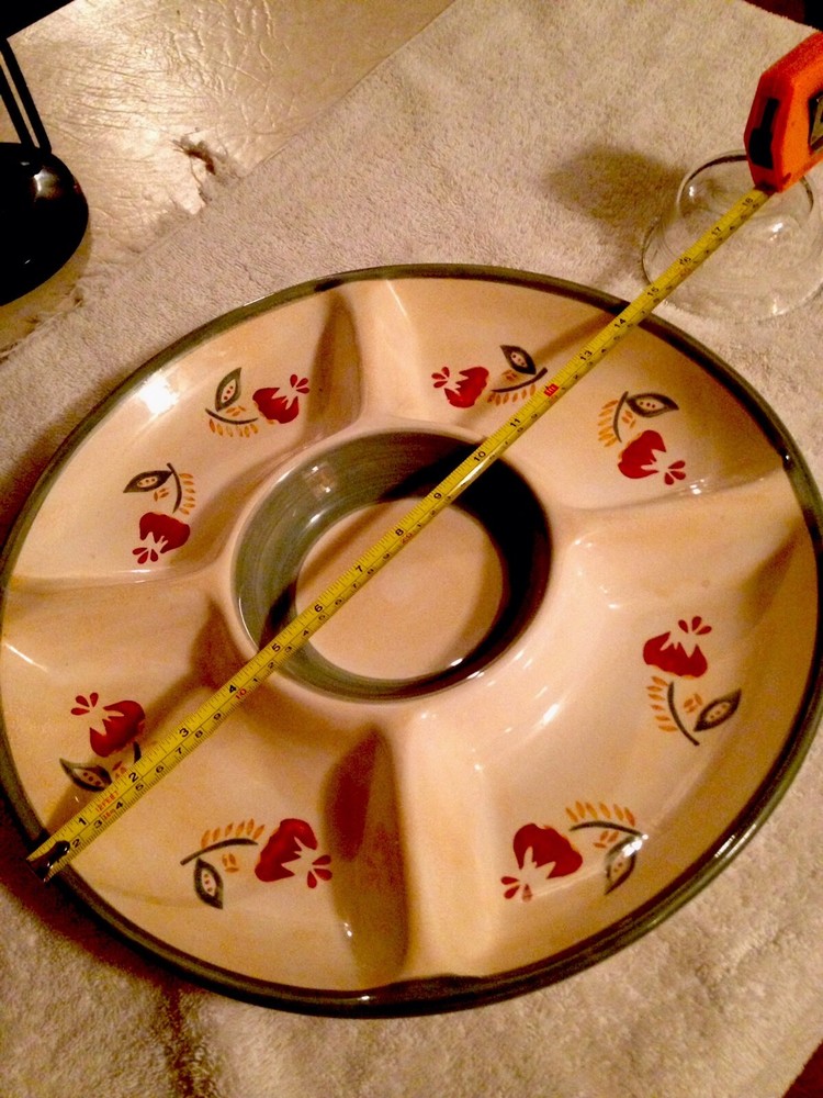 This chip and dip platter measures 14.75". The center bowl measures 6". -Tan base With Green Trim inside inner bowl and outer rim with a Red and Green Floral design along the 4 sections. This bowl has never been used. There are no chips, cracks, or scratches. ANY QUESTIONS PLEASE ASK ME I WILL RESPOND QUICKLY. I am always striving for a five-star feedback. My goal is to make you happy with your purchase. So, if for any reason you are unhappy, please contact me before leaving any negative feedback. ---- Check out my Store for more Great Items ----- Your browser does not support JavaScript. To view this page, enable JavaScript if it is disabled or upgrade your browser.