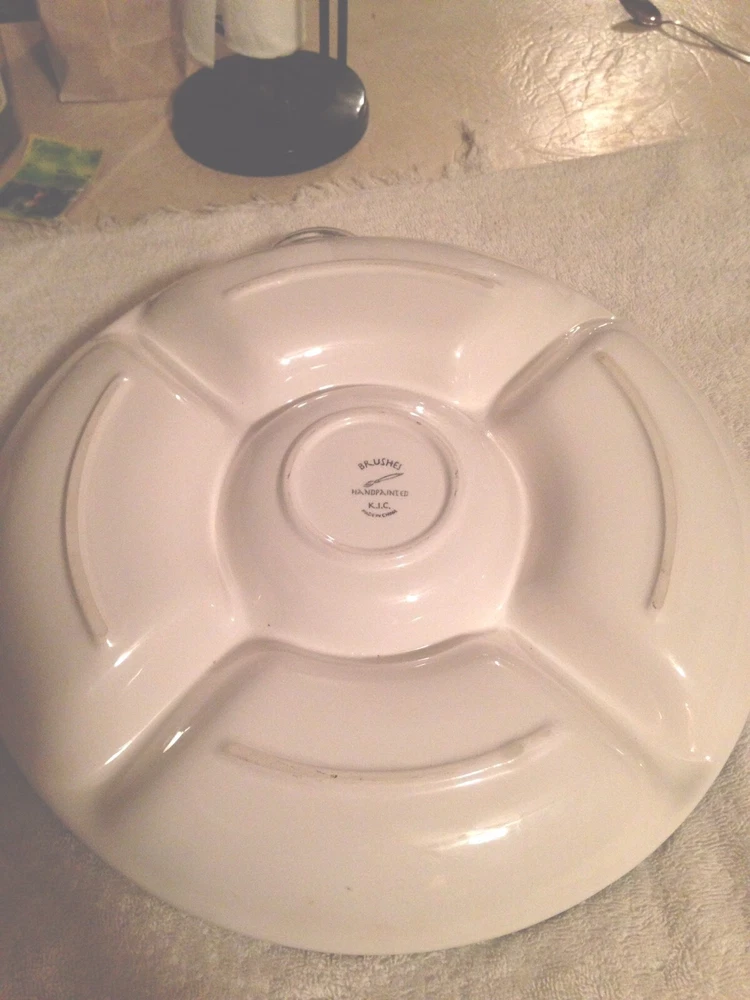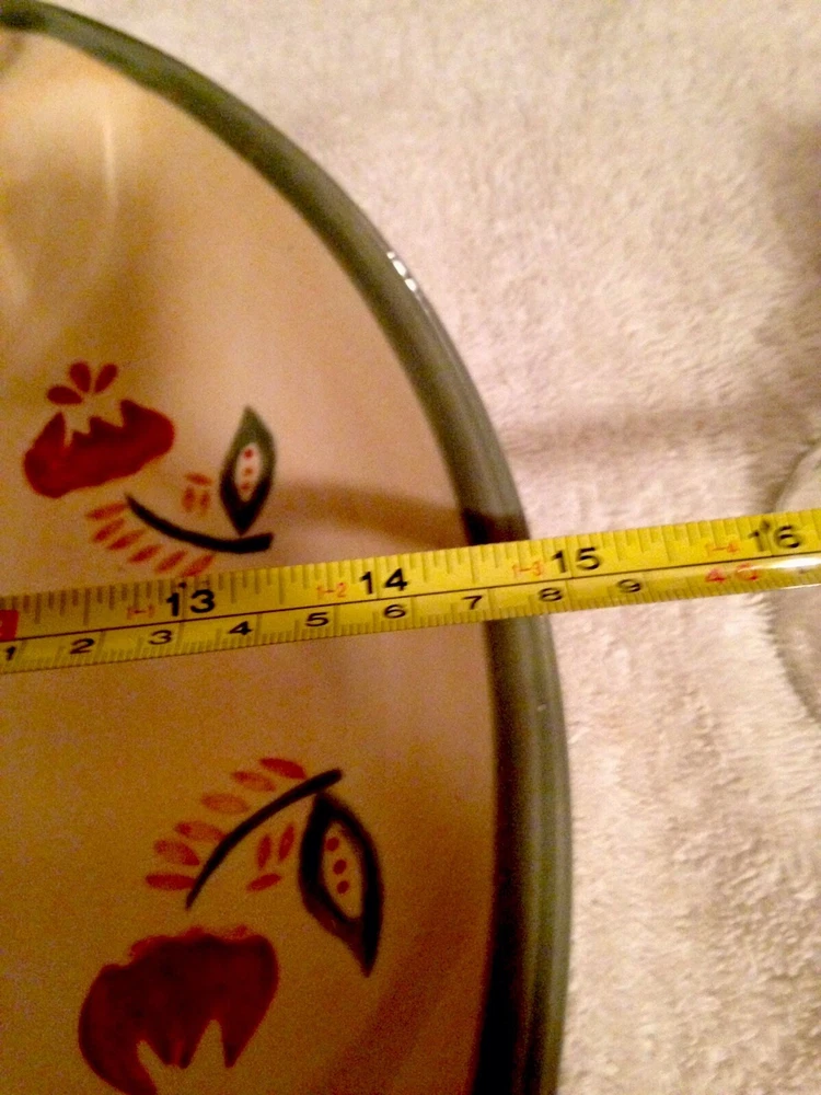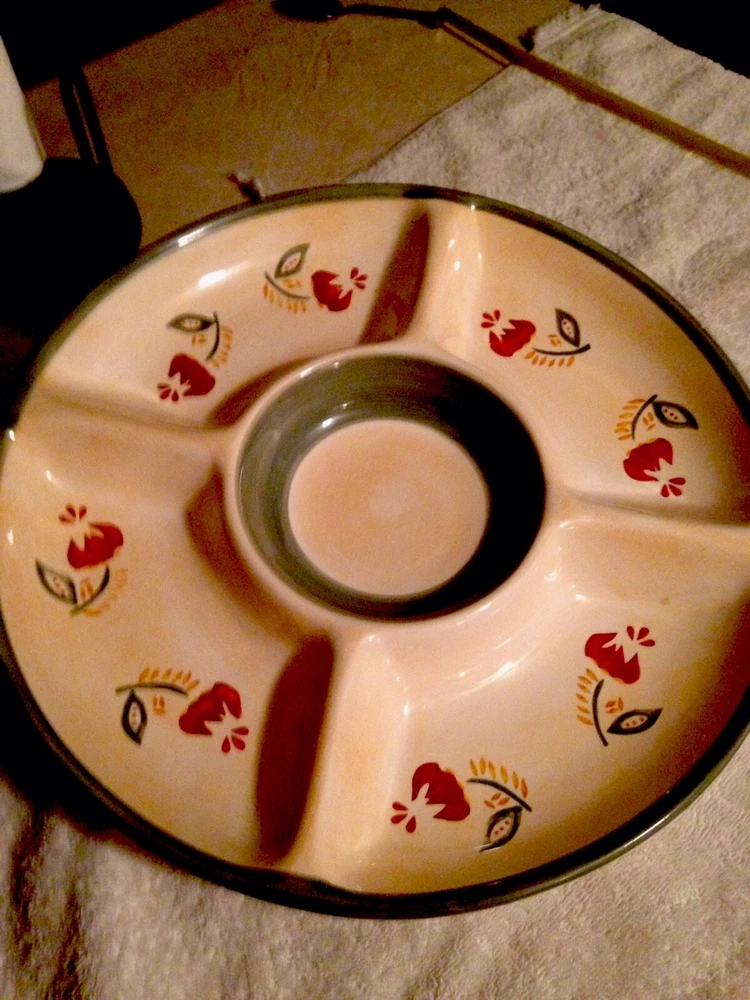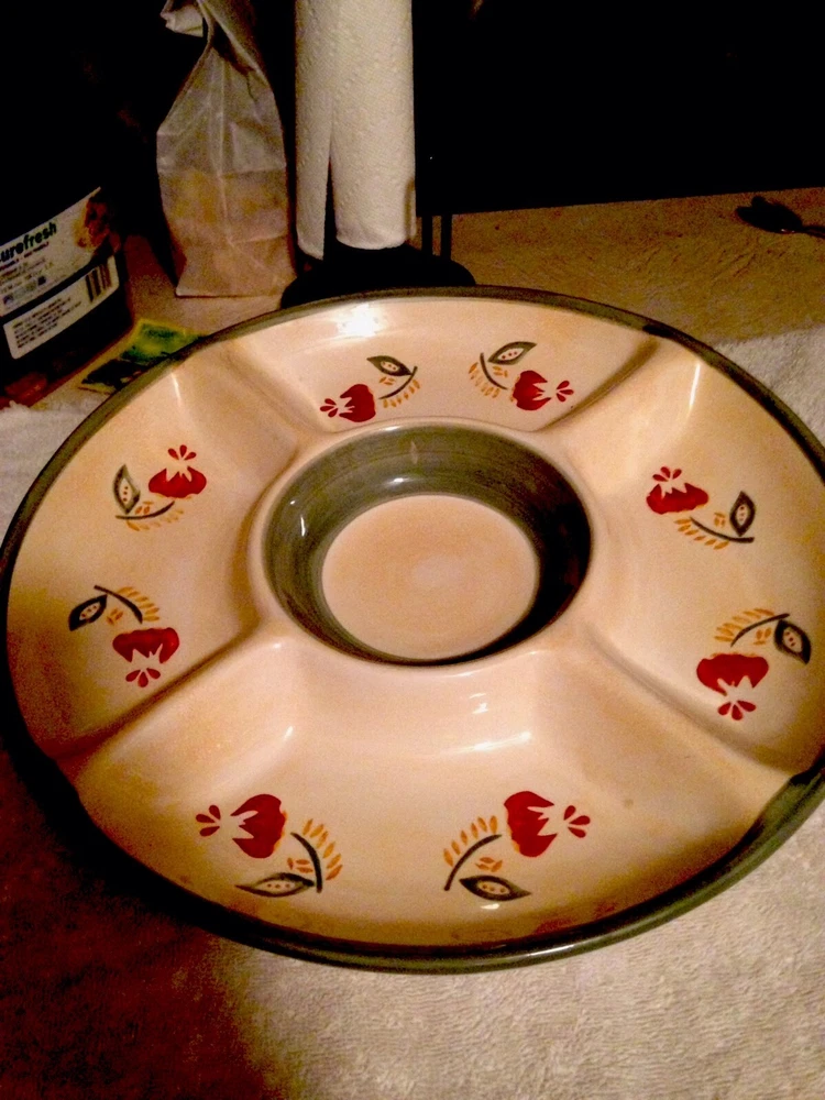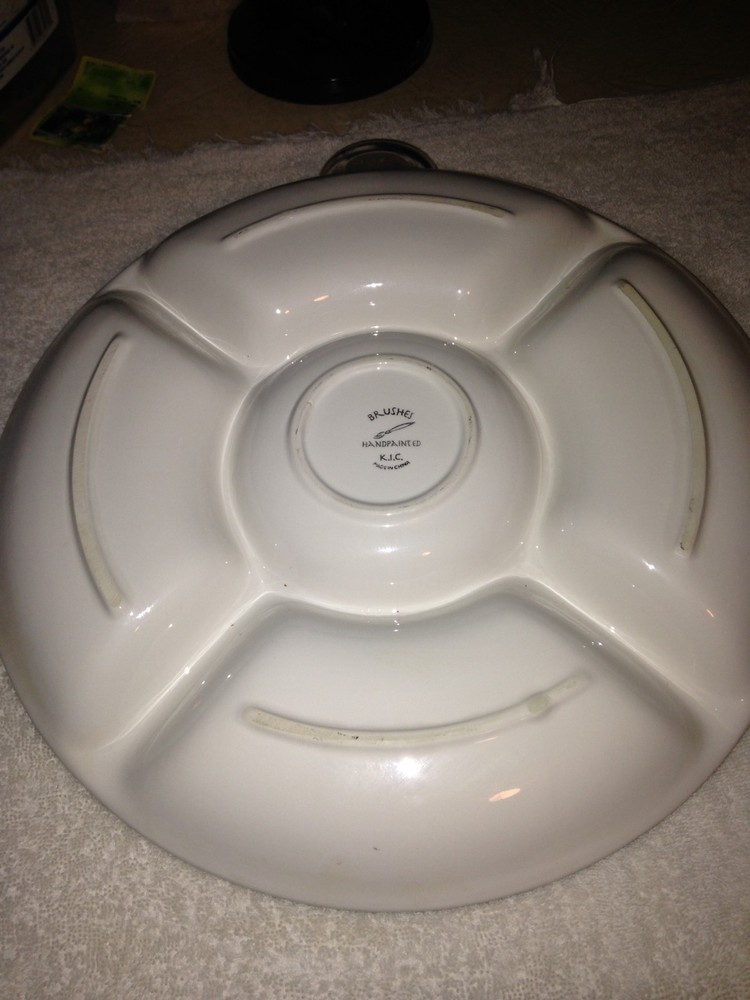 This chip and dip platter measures 14.75". The center bowl measures 6". -Tan base With Green Trim inside inner bowl and outer rim with a Red and Green Floral design along the 4 sections. This bowl has never been used. There are no chips, cracks, or scratches. ANY QUESTIONS PLEASE ASK ME I WILL RESPOND QUICKLY. I am always striving for a five-star feedback. My goal is to make you happy with your purchase. So, if for any reason you are unhappy, please contact me before leaving any negative feedback. ---- Check out my Store for more Great Items ----- Your browser does not support JavaScript. To view this page, enable JavaScript if it is disabled or upgrade your browser.