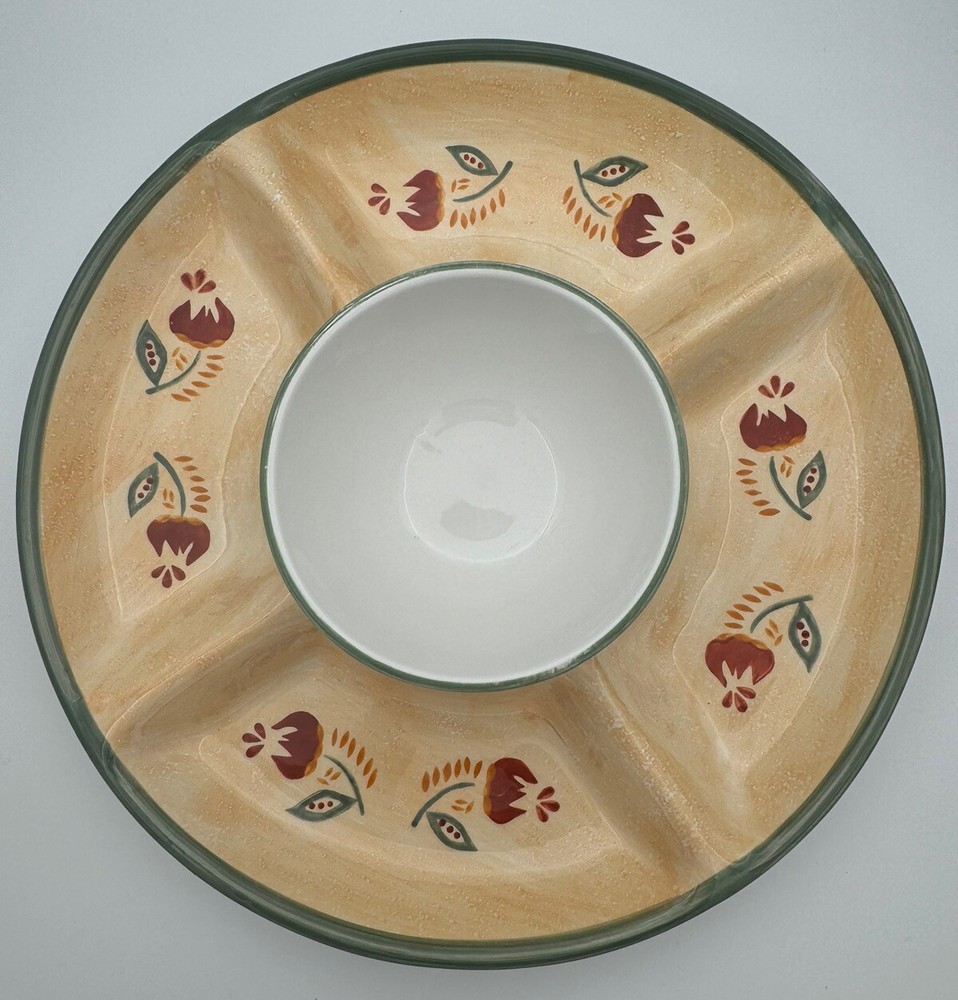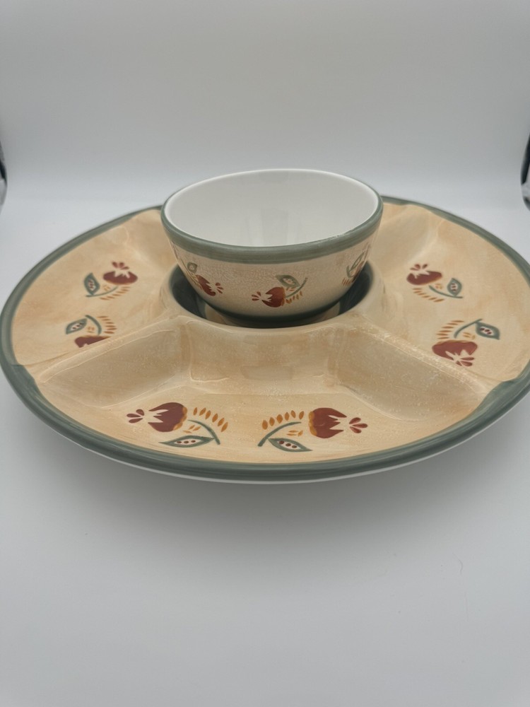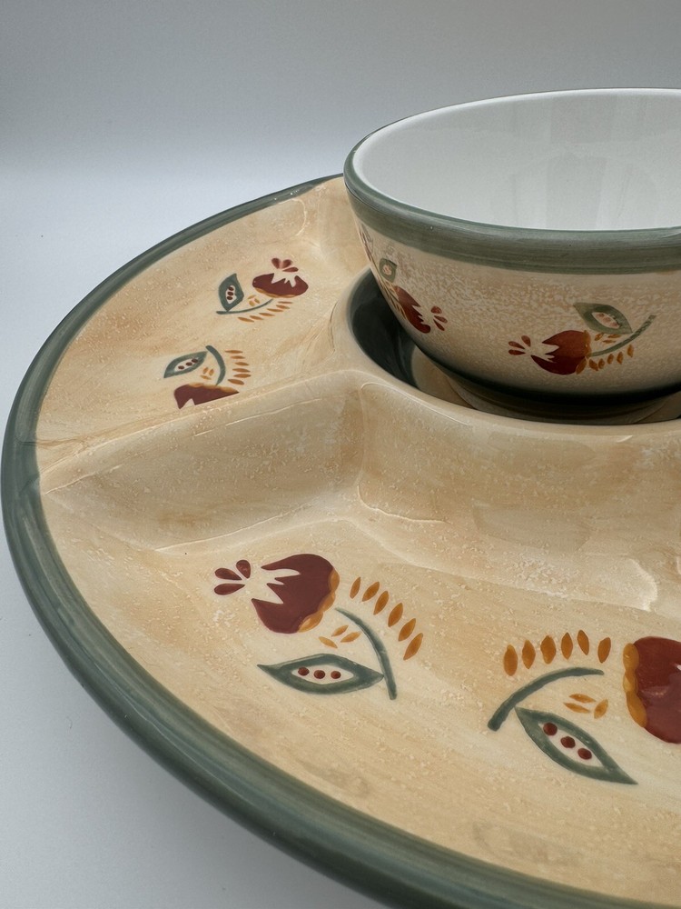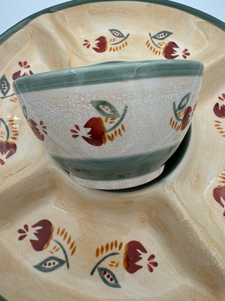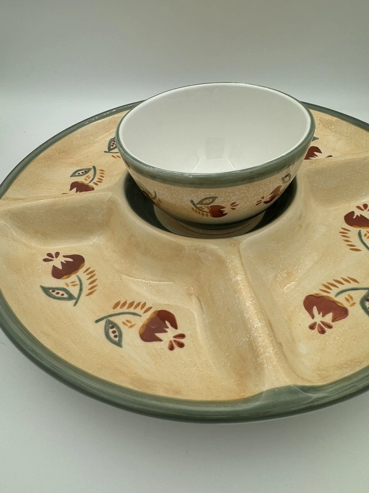Large Tuscany Spice Veggies and Dip Serving Tray by Brushes HandPainted K.I.C The Chip/Veggie and Dip tray measures 14.75” in diameter Center bowl is approximately 6” in diameter Folk Art / Country Style Piece! Great condition - no chips or cracks Some wear/discoloration is visible on the bottom of the piece - this is common in many pottery items and is from normal use. This is clearly pictured in the listing!