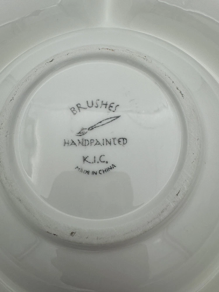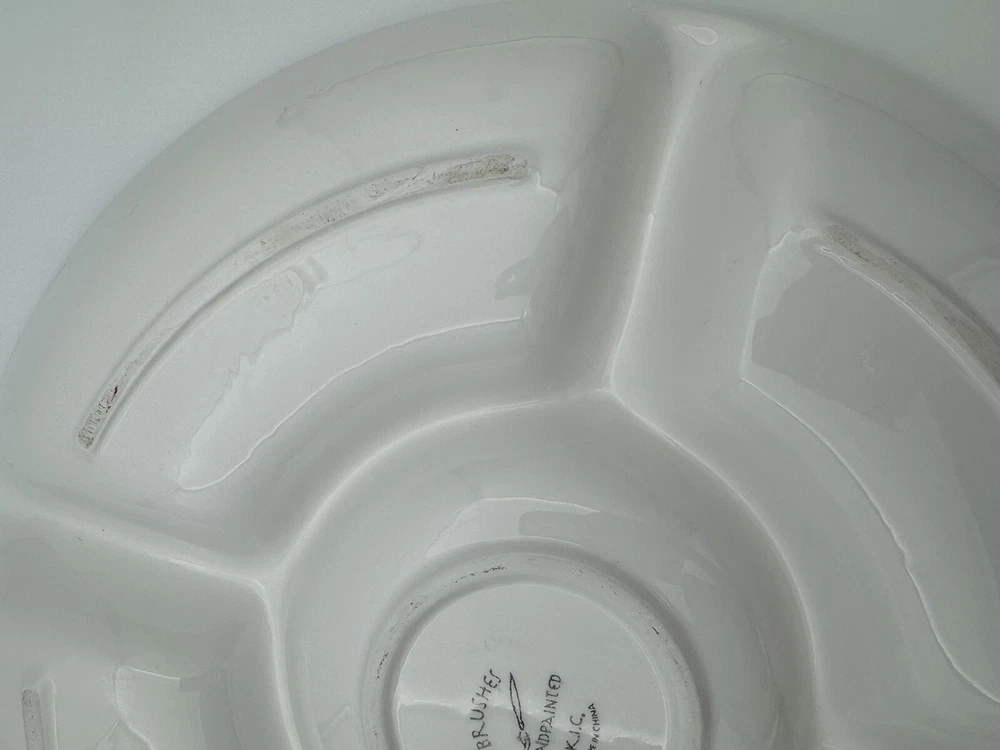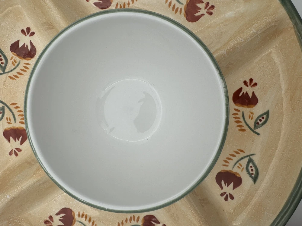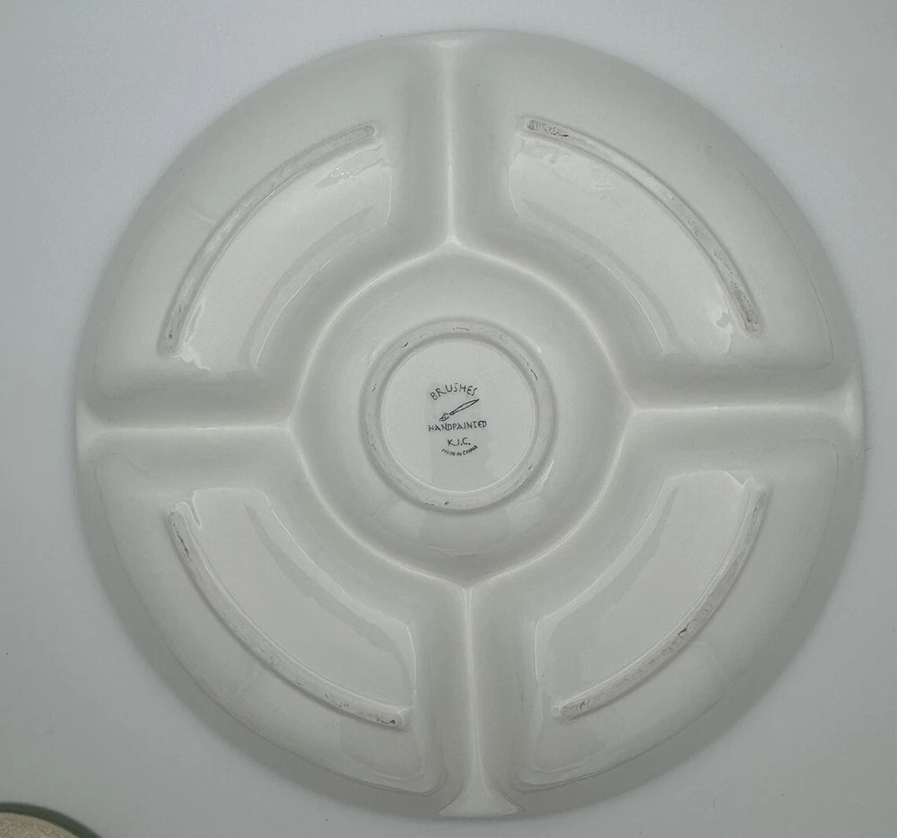 Large Tuscany Spice Veggies and Dip Serving Tray by Brushes HandPainted K.I.C The Chip/Veggie and Dip tray measures 14.75” in diameter Center bowl is approximately 6” in diameter Folk Art / Country Style Piece! Great condition - no chips or cracks Some wear/discoloration is visible on the bottom of the piece - this is common in many pottery items and is from normal use. This is clearly pictured in the listing!