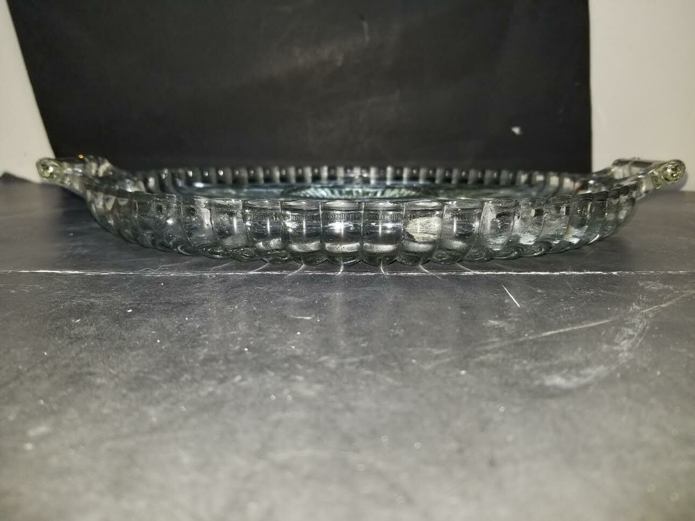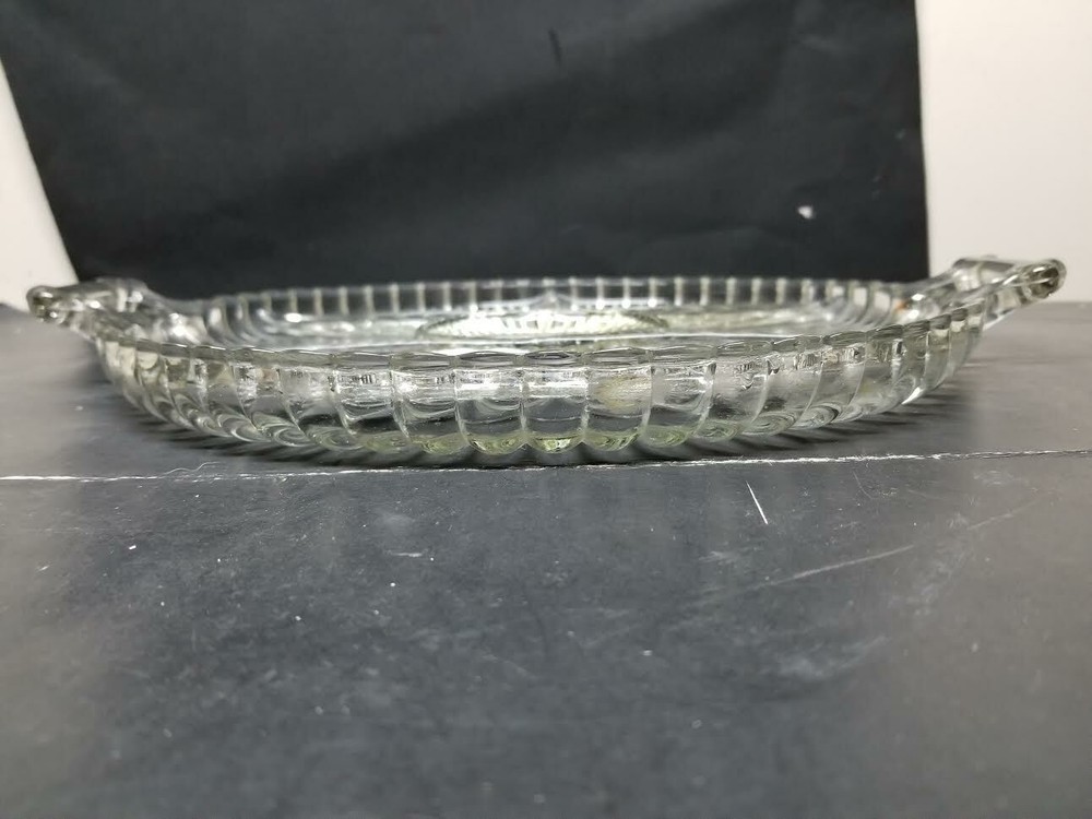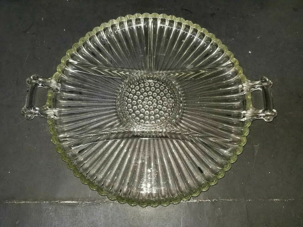 VTG JEANETTE GLASS NATIONAL CLEAR DIVIDED DISH PLATE PLATTER TRAY VEGGIE DIP W/HANDLES 15" handle to handle in very good condition. Has ribbed pattern with scalloped edge. and is 1 1/8" deep. 5 divisions plus the center for dip. Heavy piece!