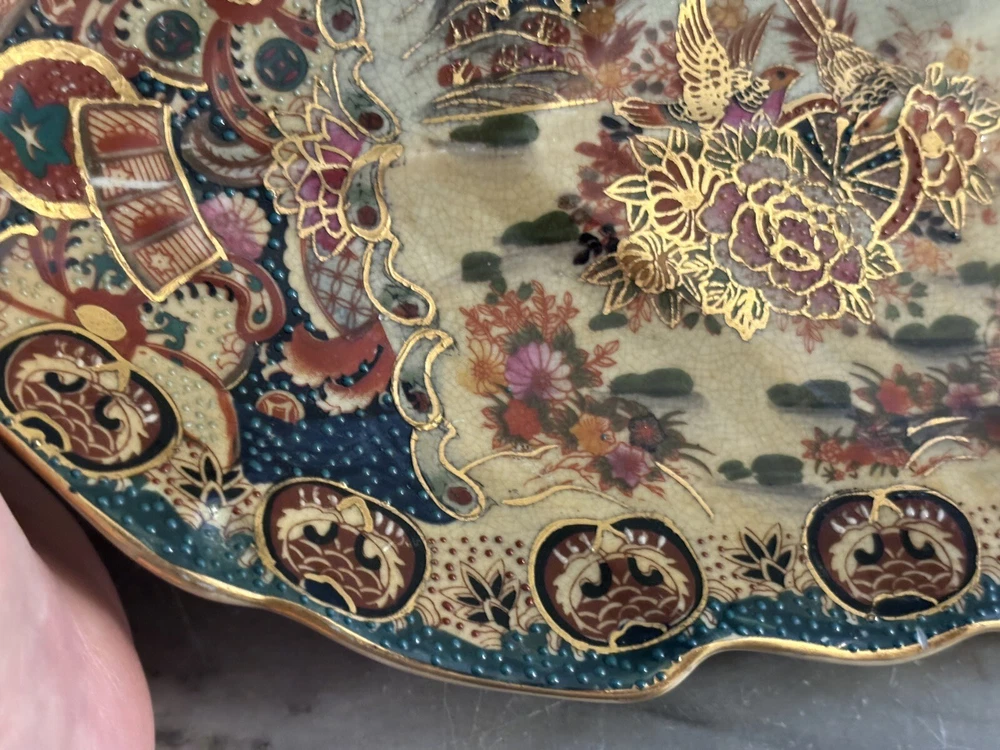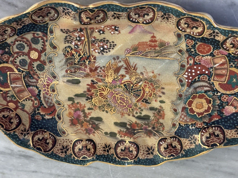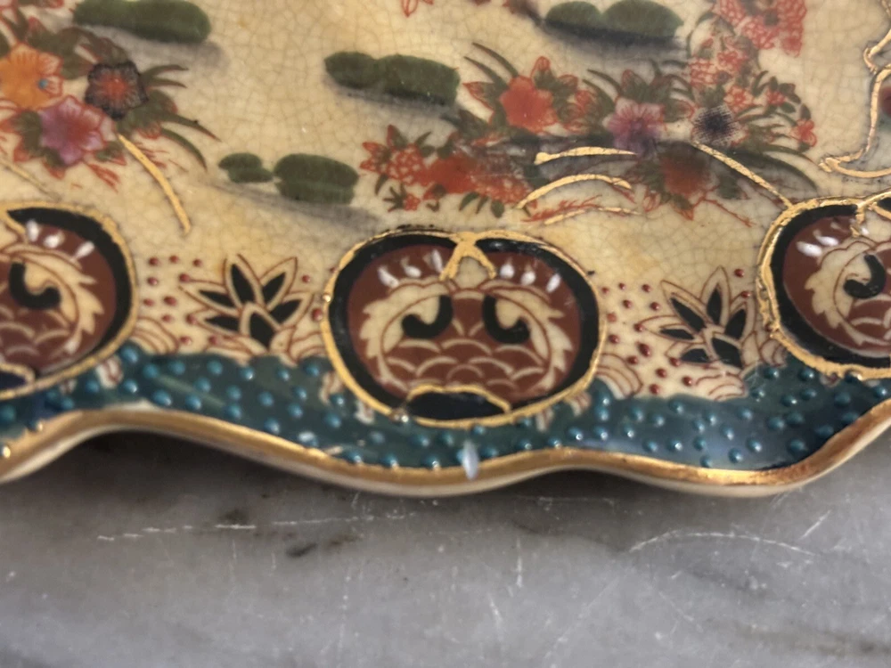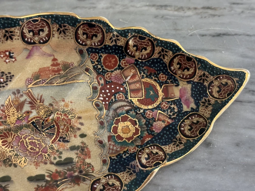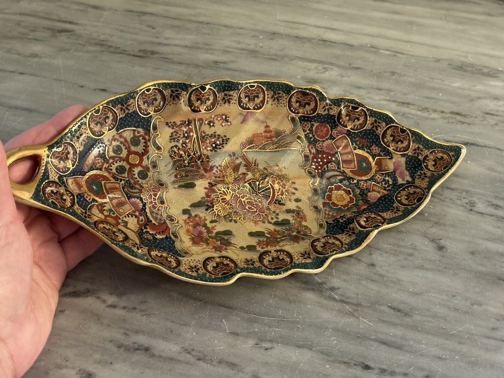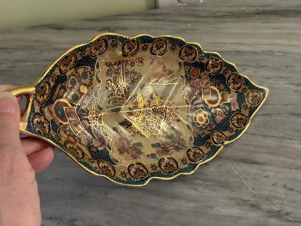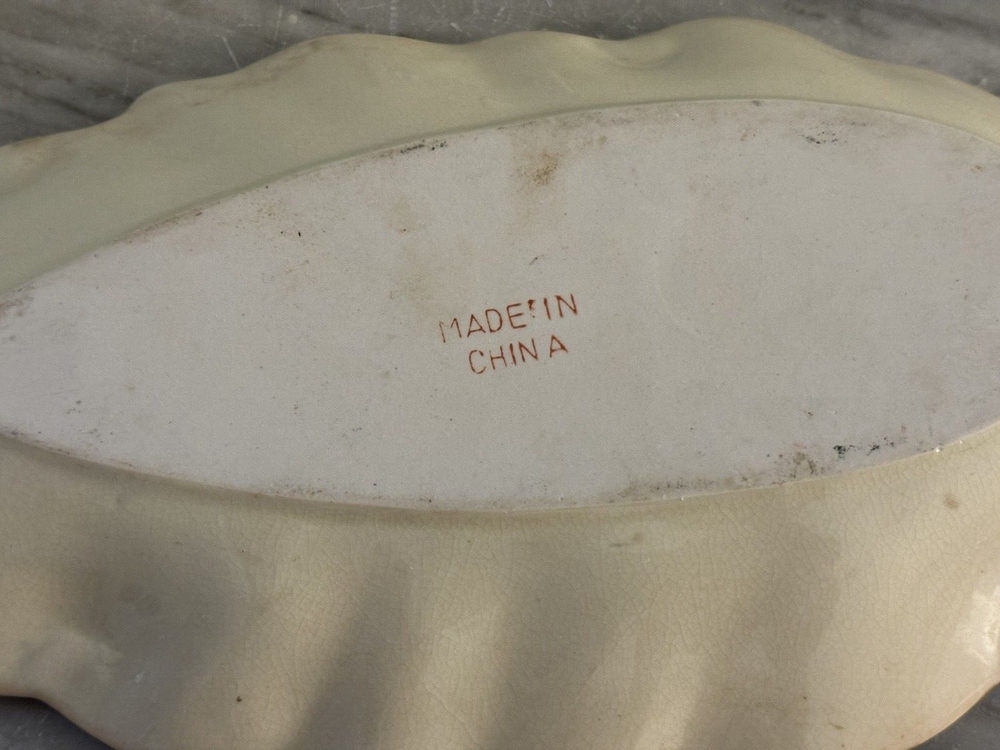 This exquisite leaf-shaped accent dish with raised details is a perfect addition to any home decor. The dish is made of high-quality porcelain material and features an ornate design. The multicolor dish is perfect for adding a touch of elegance to your dinnerware collection. Crafted with intricate details, this leaf-shaped dish is a unique piece that is sure to impress. The dish is manufactured in China using art pottery techniques. It comes with a single compartment and is perfect for displaying decorative items or serving your favorite snacks. Add this beautiful accent dish to your collection today! MEASURES APPROX 11.75" LONG AND APPROX 5.25" WIDE. TINY CHIP ALONG EDGE SEE LAST PHOTO