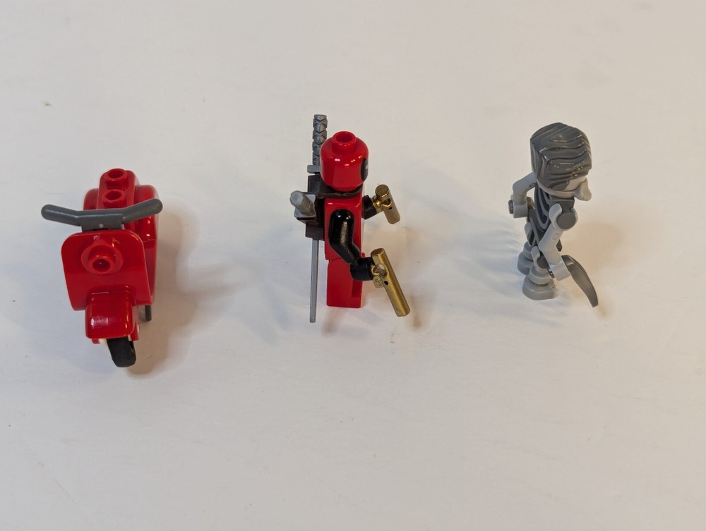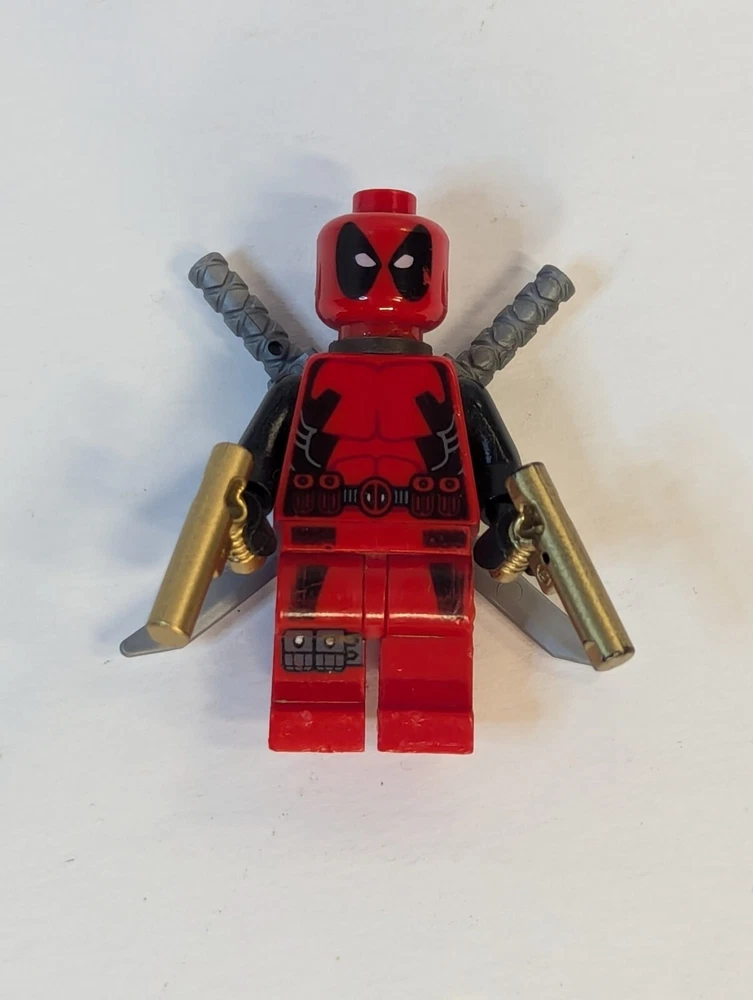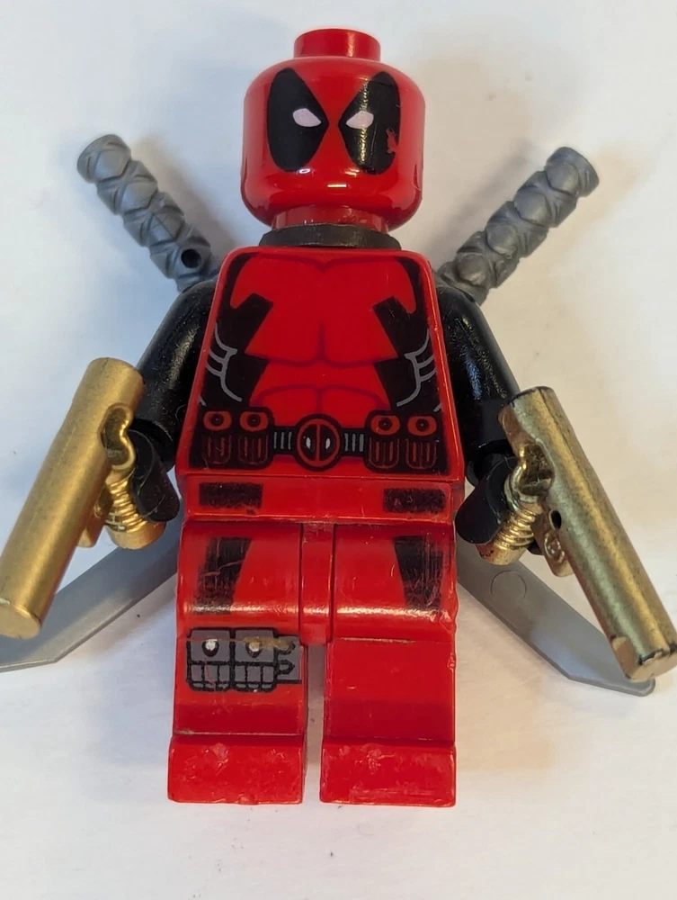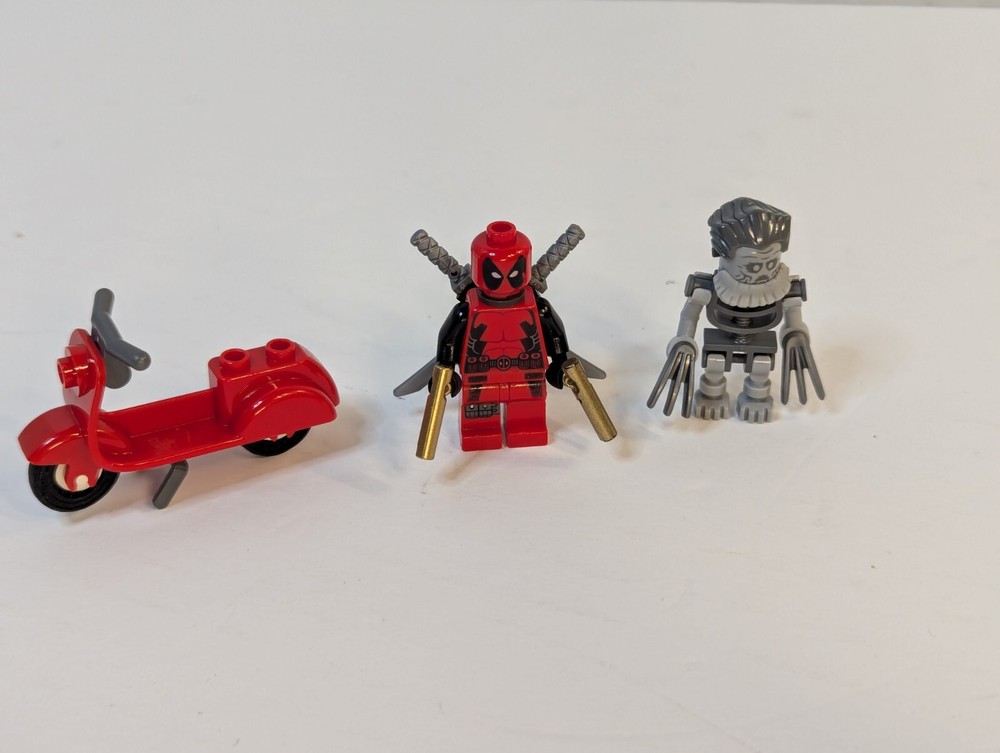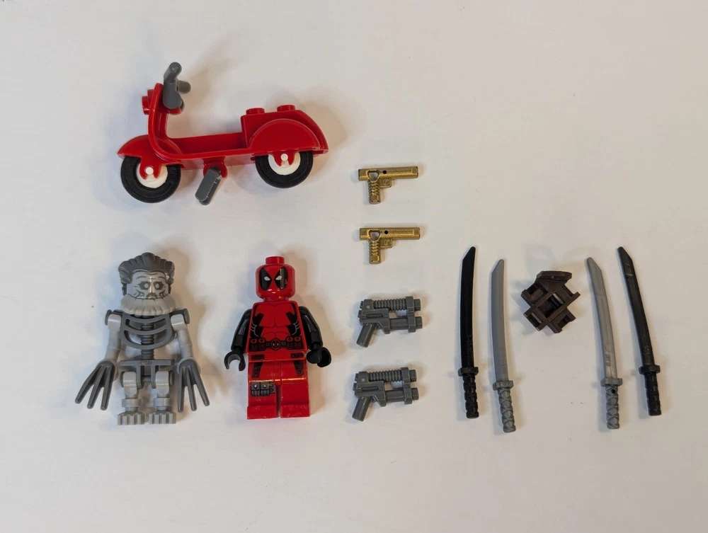 Pre-owned Lego Deadpool Minifigure from set 6866 with golden guns,silver swords, red Vespa motor scooter , original set accurate pistols and black swords and dead Logan's adamantium skeleton MOC. All genuine Lego . Deadpool himself has some damage. Legs are loose and graphics are faded, his head has a chip missing from the black part of his mask Please feel free to contact me with any questions Thanks for looking BANANA FOR SCALE NOT FOR SALE 🤓 PERSONAL NOTES Why am I asking so much money? Because even LEGO Gold plated 50 cal. Desert Eagles aren't cheap