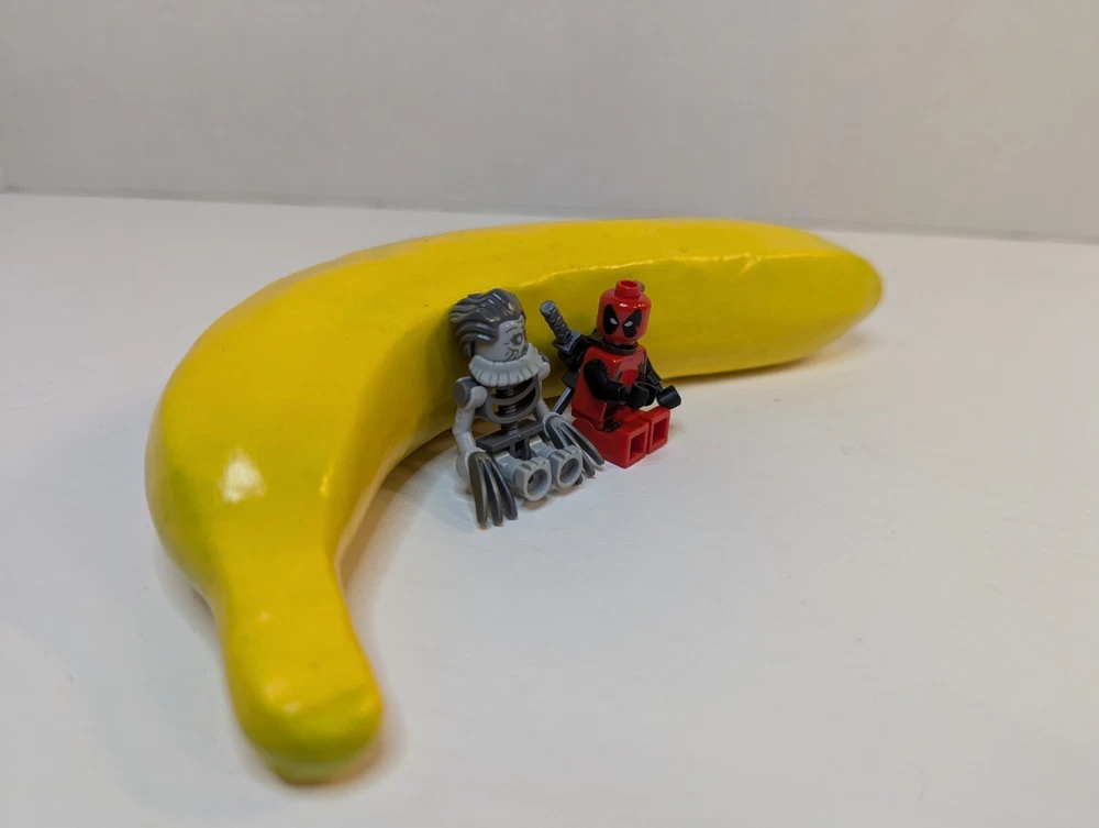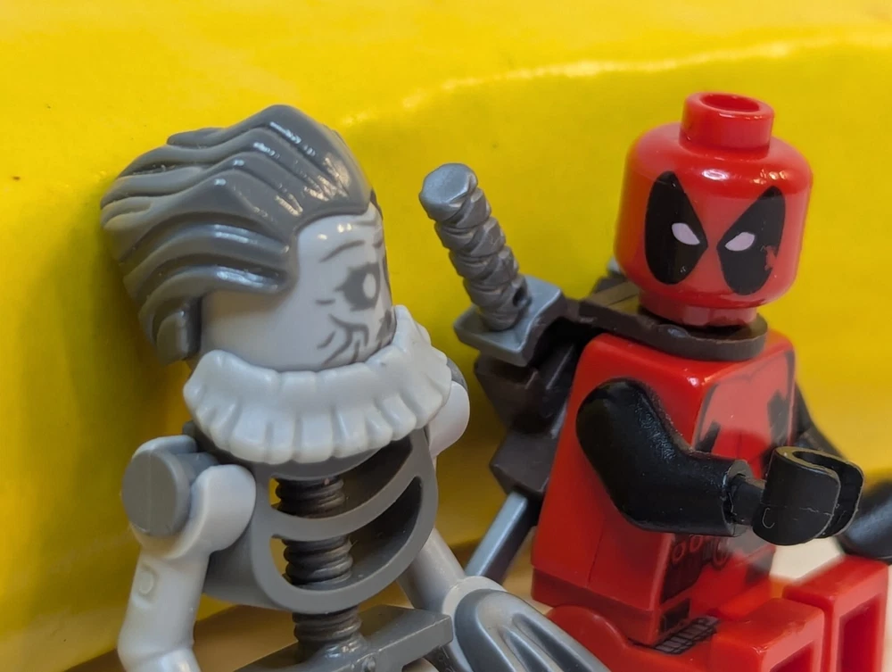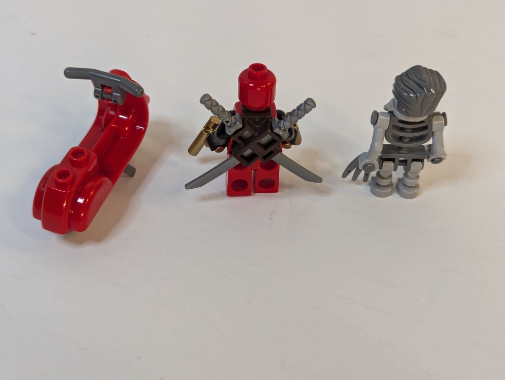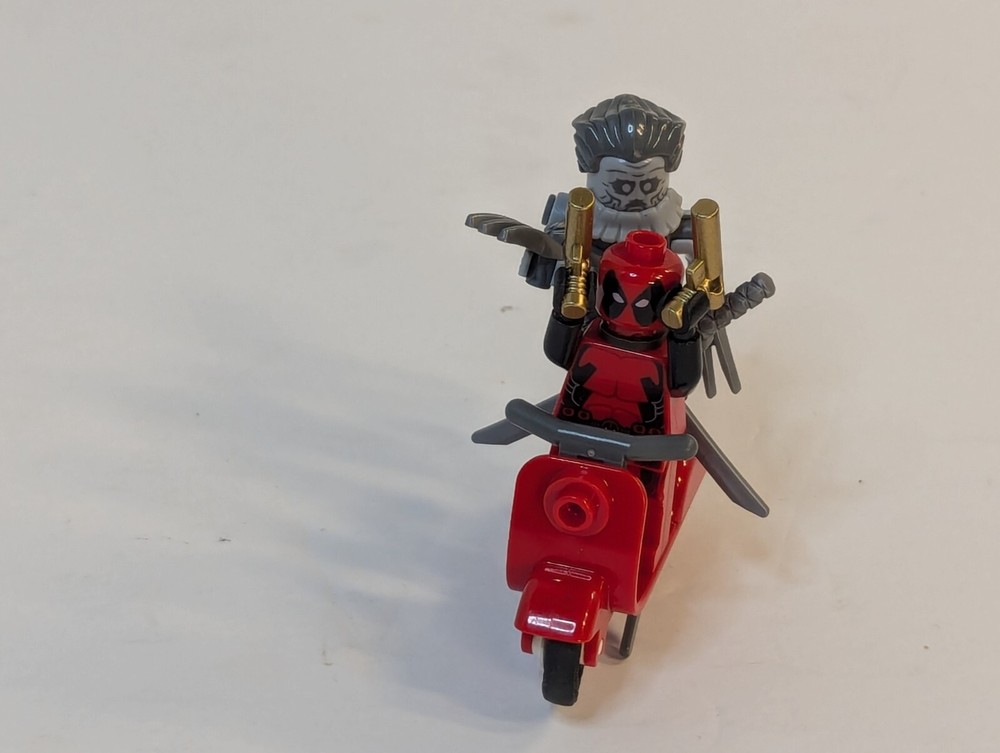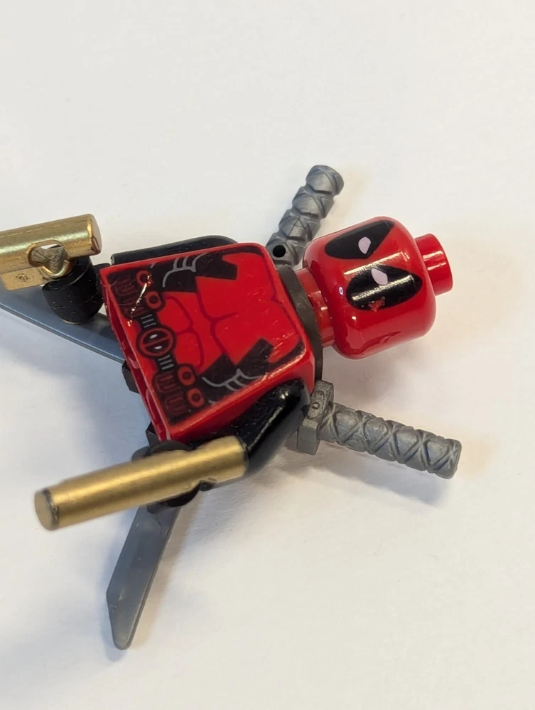 Pre-owned Lego Deadpool Minifigure from set 6866 with golden guns,silver swords, red Vespa motor scooter , original set accurate pistols and black swords and dead Logan's adamantium skeleton MOC. All genuine Lego . Deadpool himself has some damage. Legs are loose and graphics are faded, his head has a chip missing from the black part of his mask Please feel free to contact me with any questions Thanks for looking BANANA FOR SCALE NOT FOR SALE 🤓 PERSONAL NOTES Why am I asking so much money? Because even LEGO Gold plated 50 cal. Desert Eagles aren't cheap