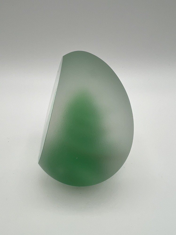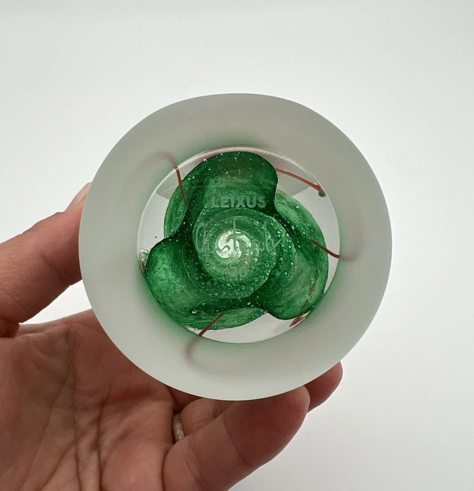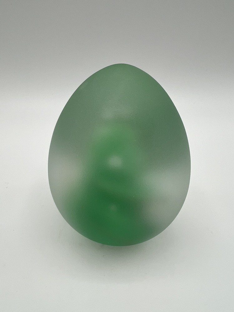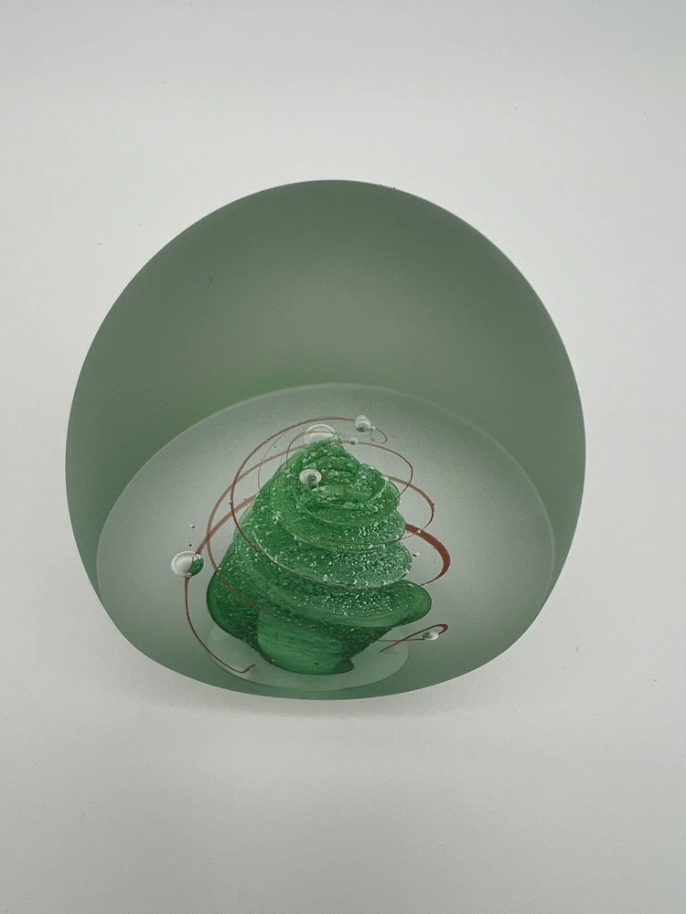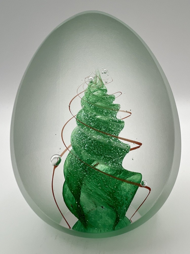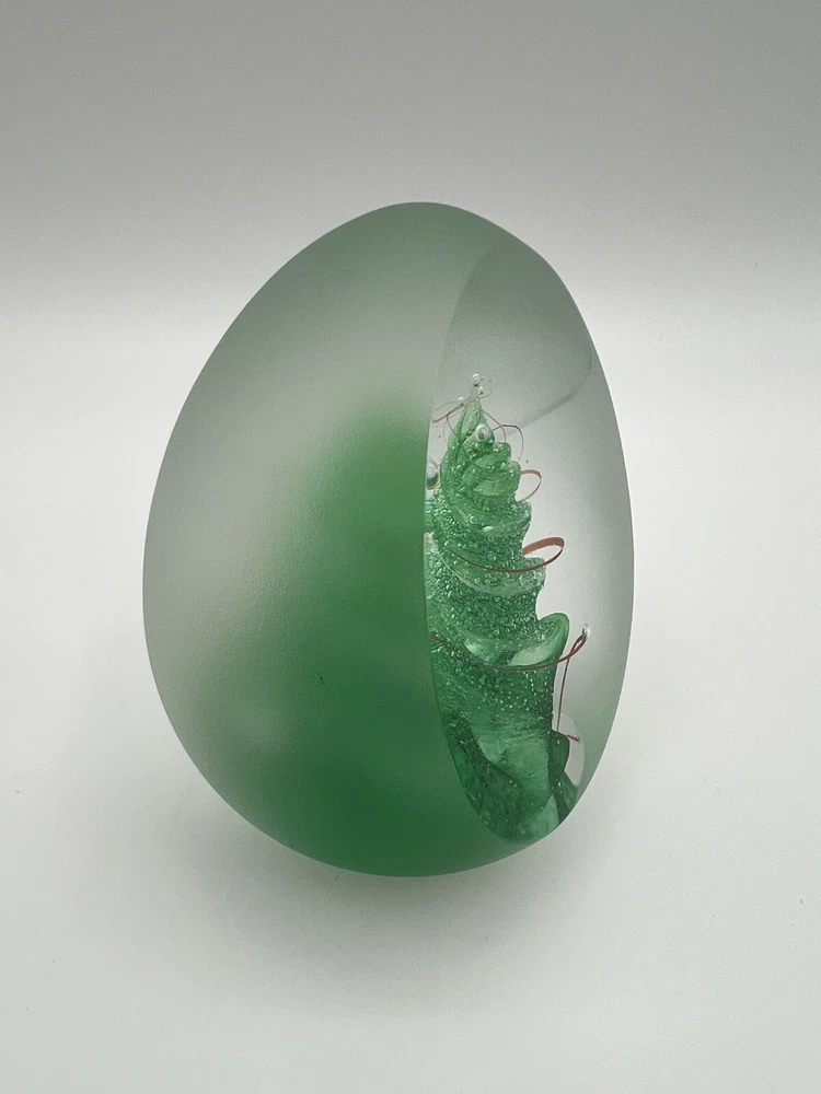 Beautiful simplistic LEIXUS Egg Shaped Paperweight w Green Swirl Tree Design ~ Artist Signed. Measures approx. 3.5” tall. Paperweight is in excellent condition, no chips or cracks.