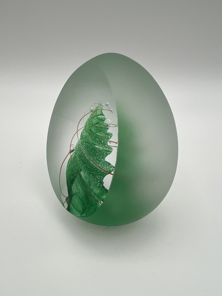 Beautiful simplistic LEIXUS Egg Shaped Paperweight w Green Swirl Tree Design ~ Artist Signed. Measures approx. 3.5” tall. Paperweight is in excellent condition, no chips or cracks....