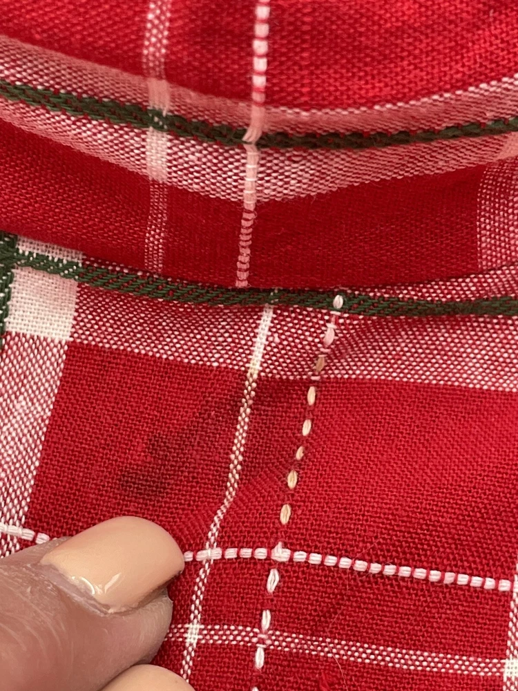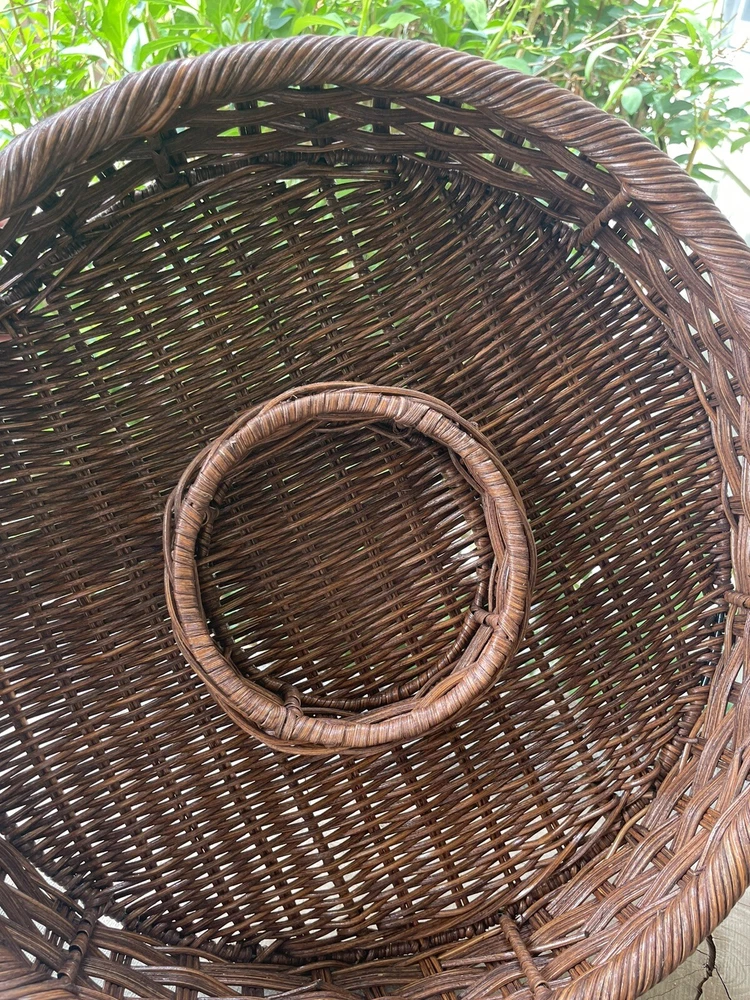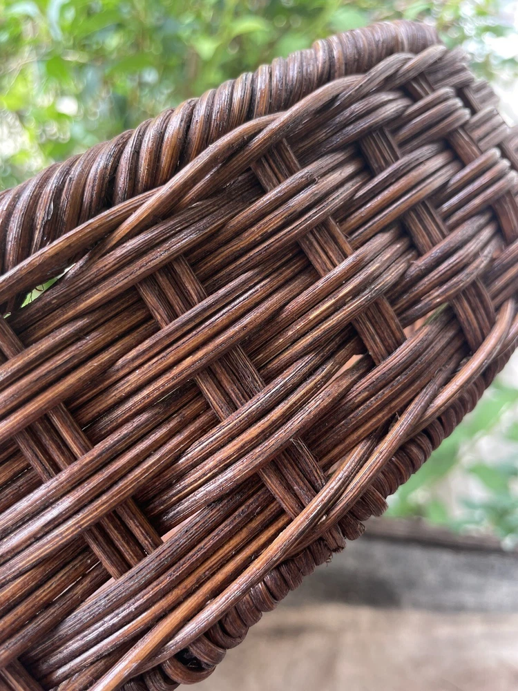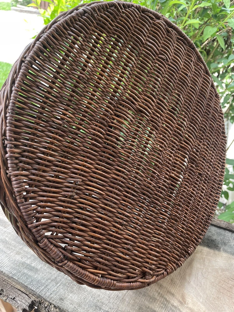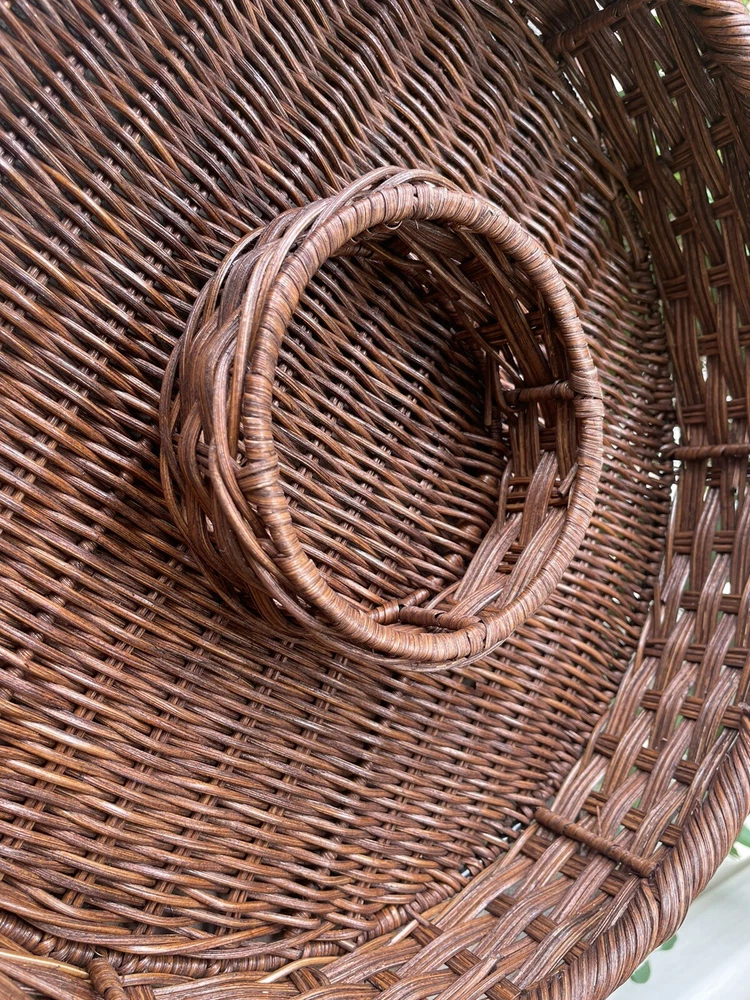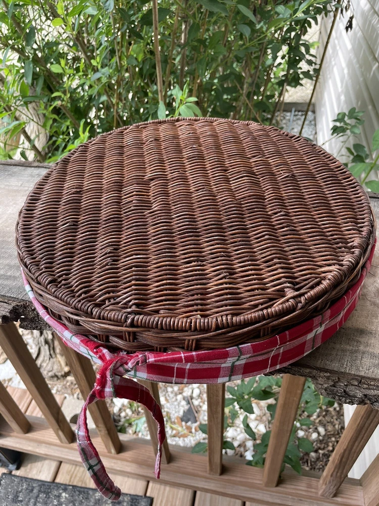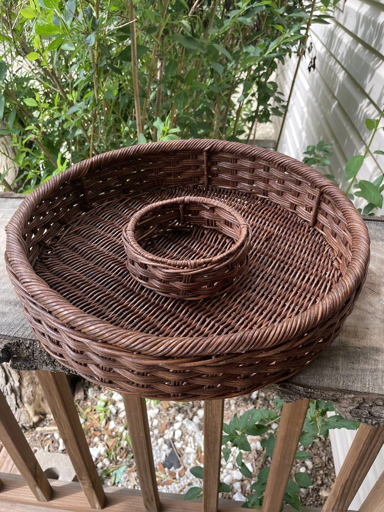 This large round wicker serving tray is perfect for any occasion, with a dark brown wood tone and a size of 14.5 inches in diameter. It features two compartments for easy filling and serving, and a removable red plaid lining for added style. The farmhouse style tray is ideal for cookouts and other gatherings, and its wicker material gives it a natural and rustic look. The tray is lightweight, weighing only 1 pound and 8 ounces, and has a width of 3.25 inches. It's easy to use and will make a great addition to any home. This chip and dip basket is an excellent choice for those who want to add some charm to their decor and serve their guests in style. This is a very nice serving basket in very good condition. Very sturdy heavy wicker no damage. The lining has one small stain as shown in photos. It has been washed, but the stain did not come out obviously . I do recommend that when you do wash the liner that you put it back on the basket damp , otherwise it is very difficult to get it back on. It does come to you from a smoke-free environment.