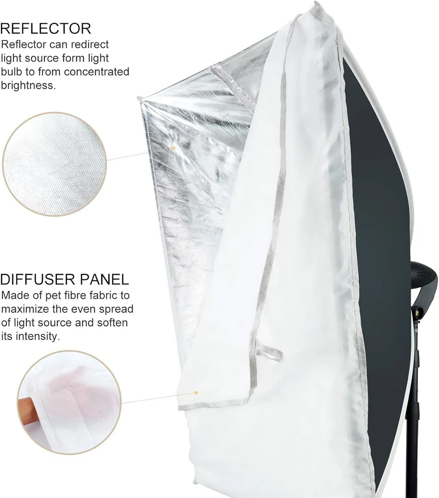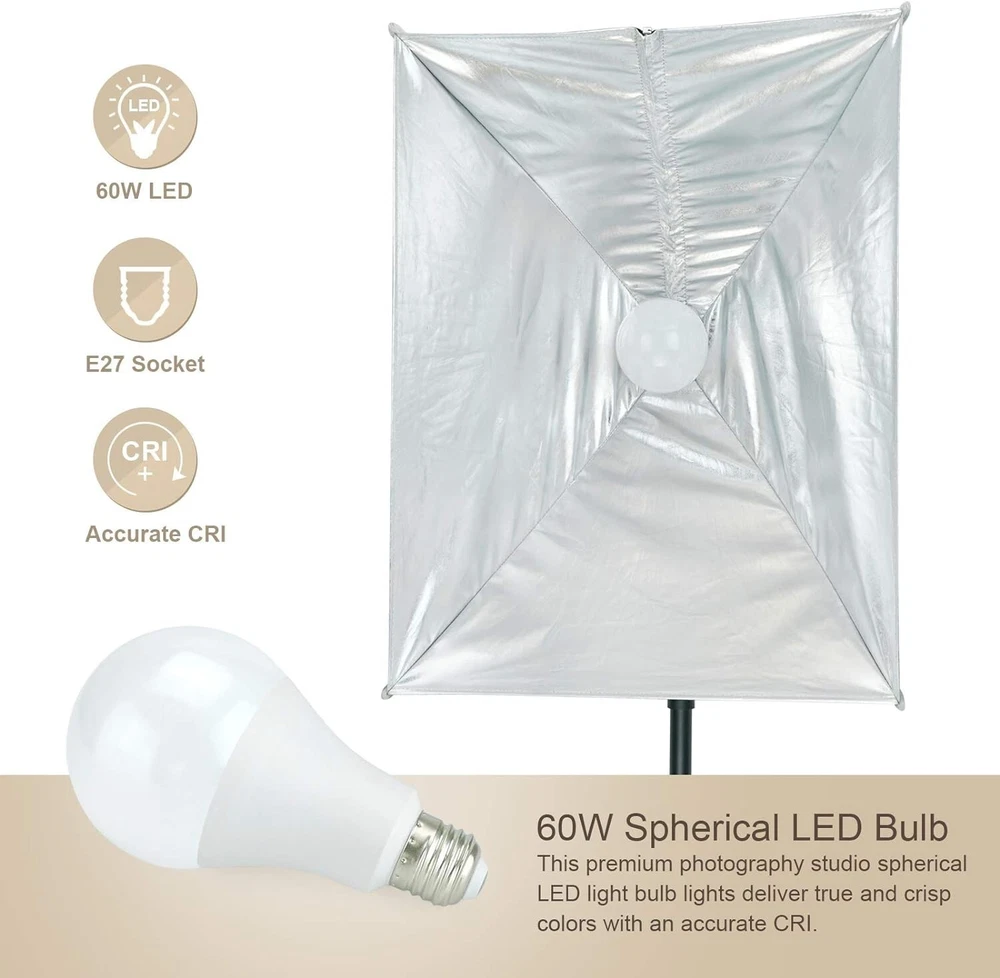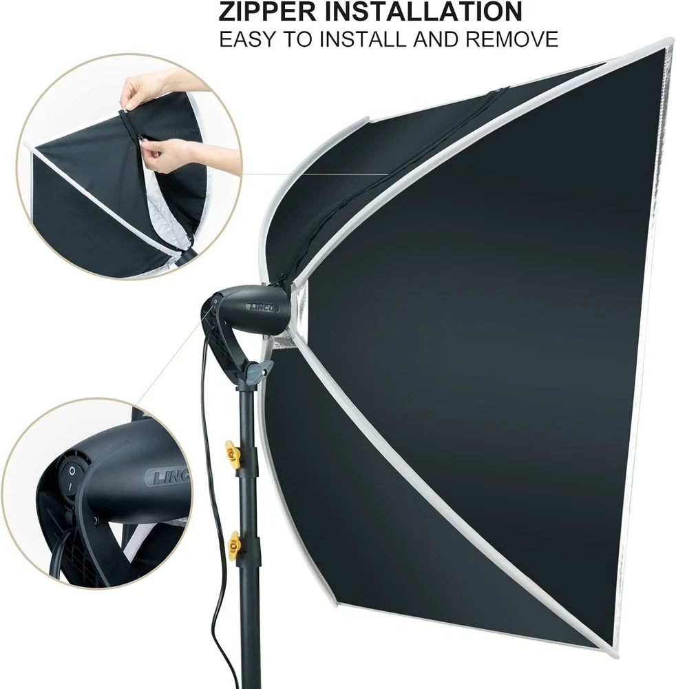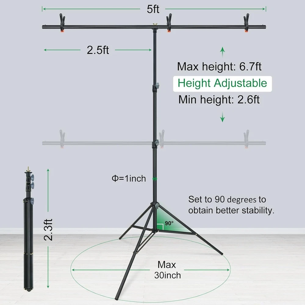 LINCO 5x6.7ft Portable T-Shaped Backdrop Stand Kit- With Green Screen This T-shaped green screen backdrop stand kit doesn't take up much space, you can use them for photography when studio space is limited, or pack them into a travel bag for easy portability. Easy to install and set up in minutes. or easy to disassemble and collect all the accessories and can be taken outside conveniently. Made of high quality matte steel material for durable and sturdy, and this support stand has an adjustable height telescopic mechanism. Green screen backdrop made of high density and opaque polyester fabric, less wrinkle and easier to restore than cotton material. If you find wrinkles, you can iron the green cloth to make the wrinkles disappear. Stains on the green screen background can be easily cleaned by dry cleaning or machine washing. Suitable for photo studio, product photography, wedding/party decoration, live streaming, etc. Washable and Ironable Green Screen Backdrop This green screen backdrop made from one piece of material and completely seamless, light weight and easy to fold. If there are stains on the green screen backdrop, it can be removed by hand or machine wash. If there are wrinkles, the surface can be ironed with a steam iron, but not dry ironed. Note: Bleach and caustic detergents are not allowed. Compact and Sturdy T-shaped Backdrop Stand This T-shaped backdrop suport stand is light-weight and stability, equipped with durable locking knob for firm support and added stability. Crossbar can hold the heavy backdrop well when it is fully installed, and making it a perfect compact backdrop suport stand. 2020-10 Carrying bag for lighting kit This carrying bag is made from strong and durable Oxford cloth with PA (420D). It’s extremely lightweight and foldable. This durable lighting carrying bag is great for transporting any combination of lights and accessories. Size: 31x8x7 inches (LxWxH). Color: Black. Lightweight and Easy to Carry. Durable premium material. Water Resistant (not waterproof). Designed for storing all light kit accessories. One-piece Design 20 x 27.6 inches ( 50x70 cm) Softbox with Light Stand, Just open 3 legs, adjust the height, rotate the softbox, attach light bulb, Then, turn the light on. All finished. Softbox Size: 20 x 27.6 in Stand Minimum Height:35in. Stand Maximum Height:77in. With zippered Softbox The newly designed zippered rotatable soft box, the integrated structure of the lamp head and the soft box, is installed with a zipper without complicated installation process, that can be easily carried. 60W Spherical LED Bulb That premium photography studio spherical LED light bulb lights deliver true and crisp colors with an accurate CRI. And day-light light bulb are daylight (white) balanced at 5000K, which allows the to be combined easily with ambient, window light for supplmental lighting. 60W spherical LED bulb. Standard screw-in base. 5000K Color Temperature. 60 Watts (800 lumens lighting output). Only use 8.5W energy. Designed for usage at 110V, 60 Hz. Silent and flickerless operation. Softbox Installation Custome r Service 8:30 a.m. to 4:30 p.m. Mon-Fri PST 📞562.404.0593 ✉️[email protected]