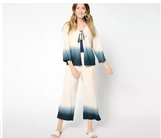 From everyday errands to vacation destinations, these delightful dip dye crop pants showcase your playful personality when you're out and about. From LOGO by Lori Goldstein®. Features: cropped length, dip dye design, flat front waistband with elastic back, side slits, side entry pockets Rise: at the waist Fit: relaxed fit; generously cut with maximum wearing ease Leg Shape: wide leg; widens fashionably from thigh to leg opening Inseam: missy/plus inseam 25" Content: 100% cotton Care: machine wash, tumble dry