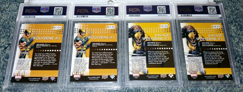 LOT of (4) 2013 UPPER DECK MARVEL NOW! CUTTING EDGE COVERS VARIATIONS #118JQ, #118SY, #127OC, & #127SY Wolverine #1 PSA 10 GEM MINT ~ You get ALL 4 Priced to Sell!!! Always the lowest Buy It Now on Ebay!!! If you're satisfied with your purchase, please remember to leave positive feedback... : )