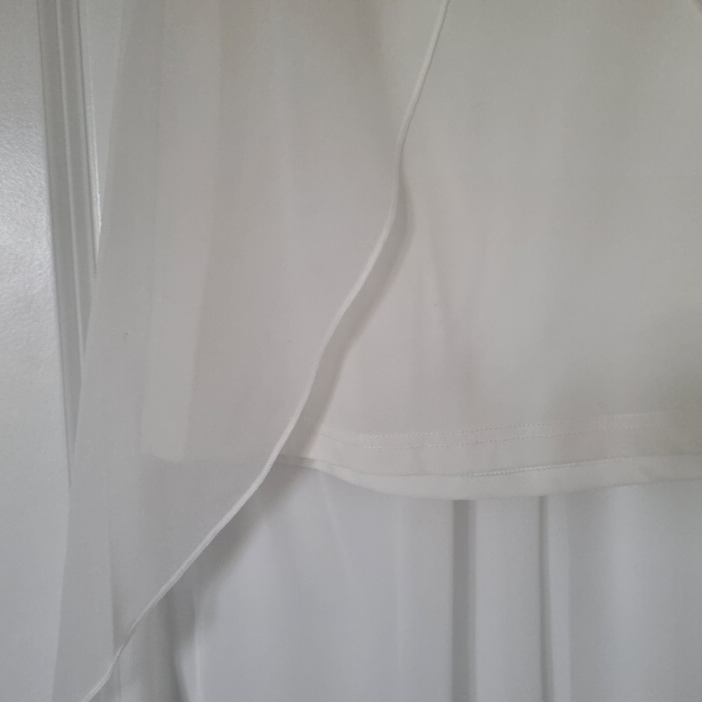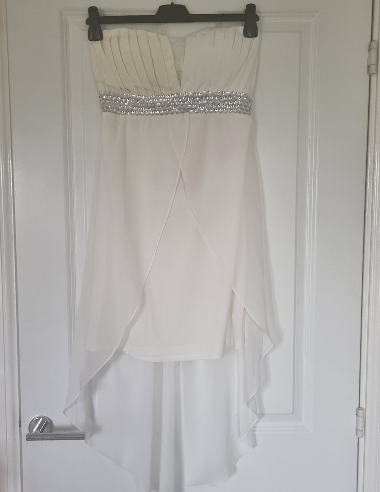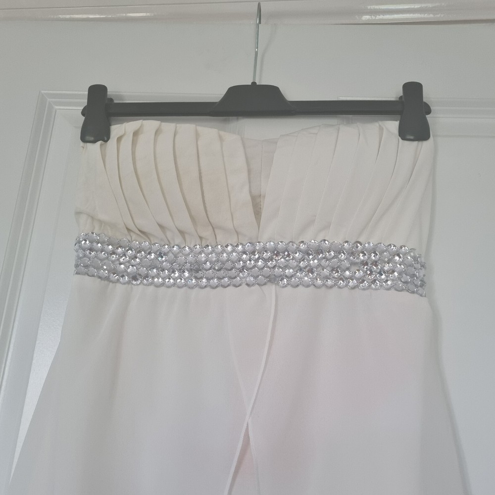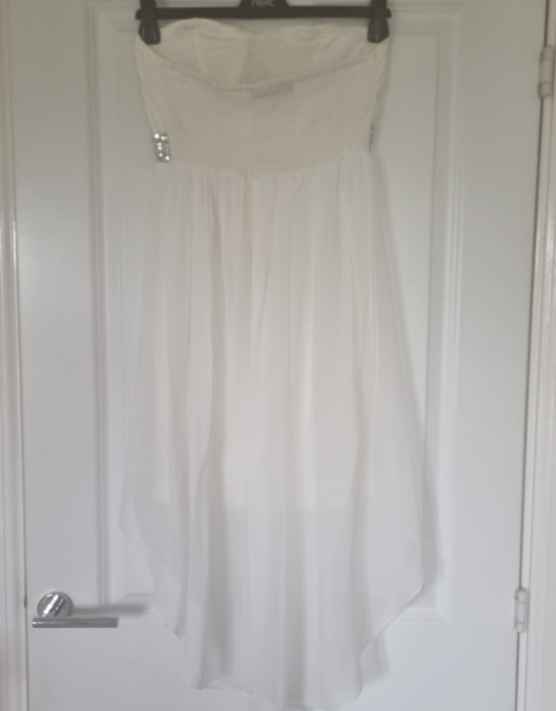 LOVELY WHITE SHEER PINTUCK BANDEAU SPARKLY EMBELLISHED FLOATY DIP HEM DRESS SPARKLY BEADED TRIM WAIST SLIGHTLY PADDED BUST CUPS ELASTICATED ACROSS TOP OF BACK SIZE L/XL - FITS 10/12/14 LINED TO KNEE LENGTH - CONTRAST SHEER MATERIAL DRAPS AT FRONT AND IS LONGER AT BACK 100% POLYESTER THANKS FOR LOOKING! PLEASE DO NOT HESITATE TO CONTACT ME IF YOU HAVE ANY QUESTIONS PLEASE CHECK OUT MY OTHER ITEMS - COMBINED POSTAGE DISCOUNTS GIVEN